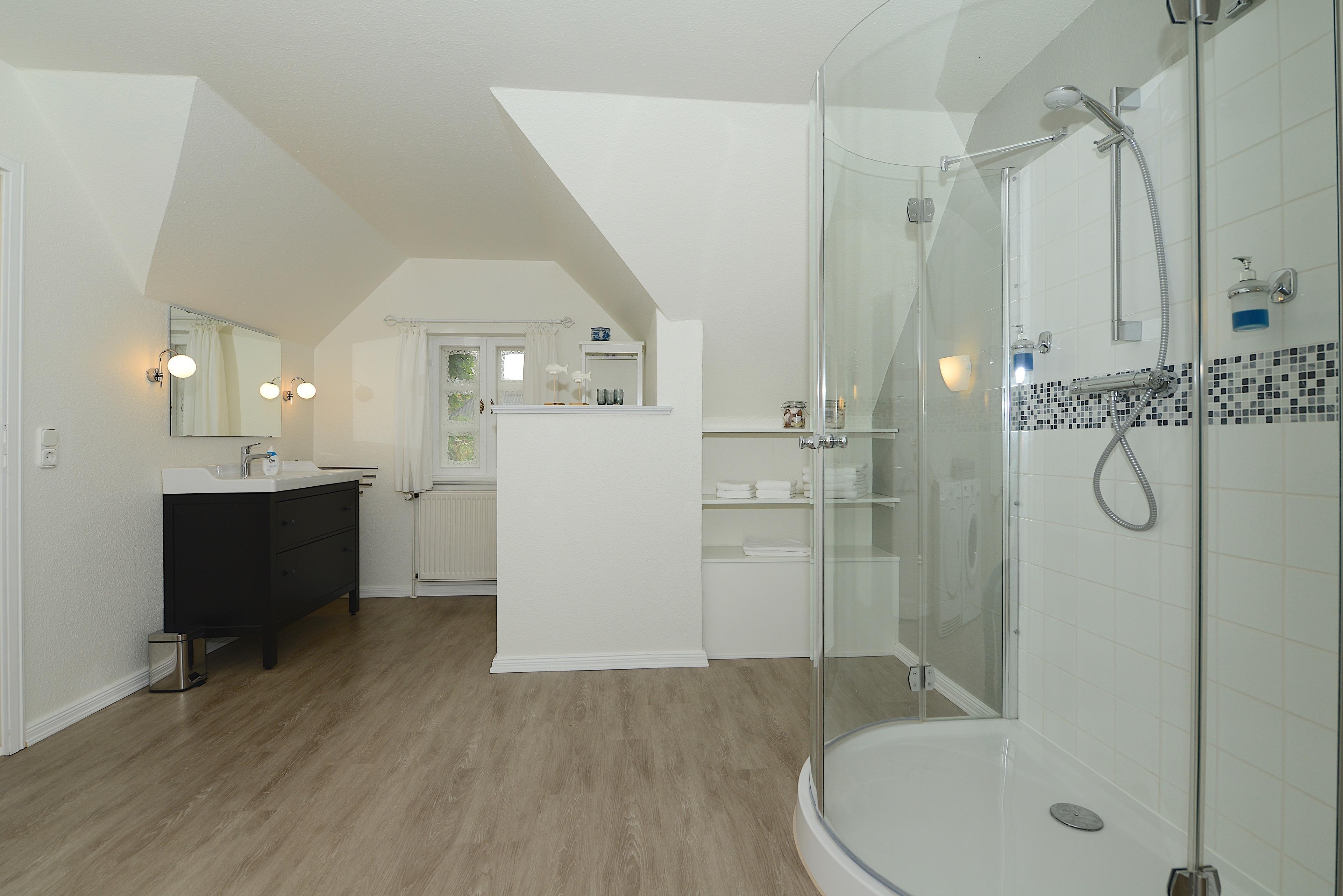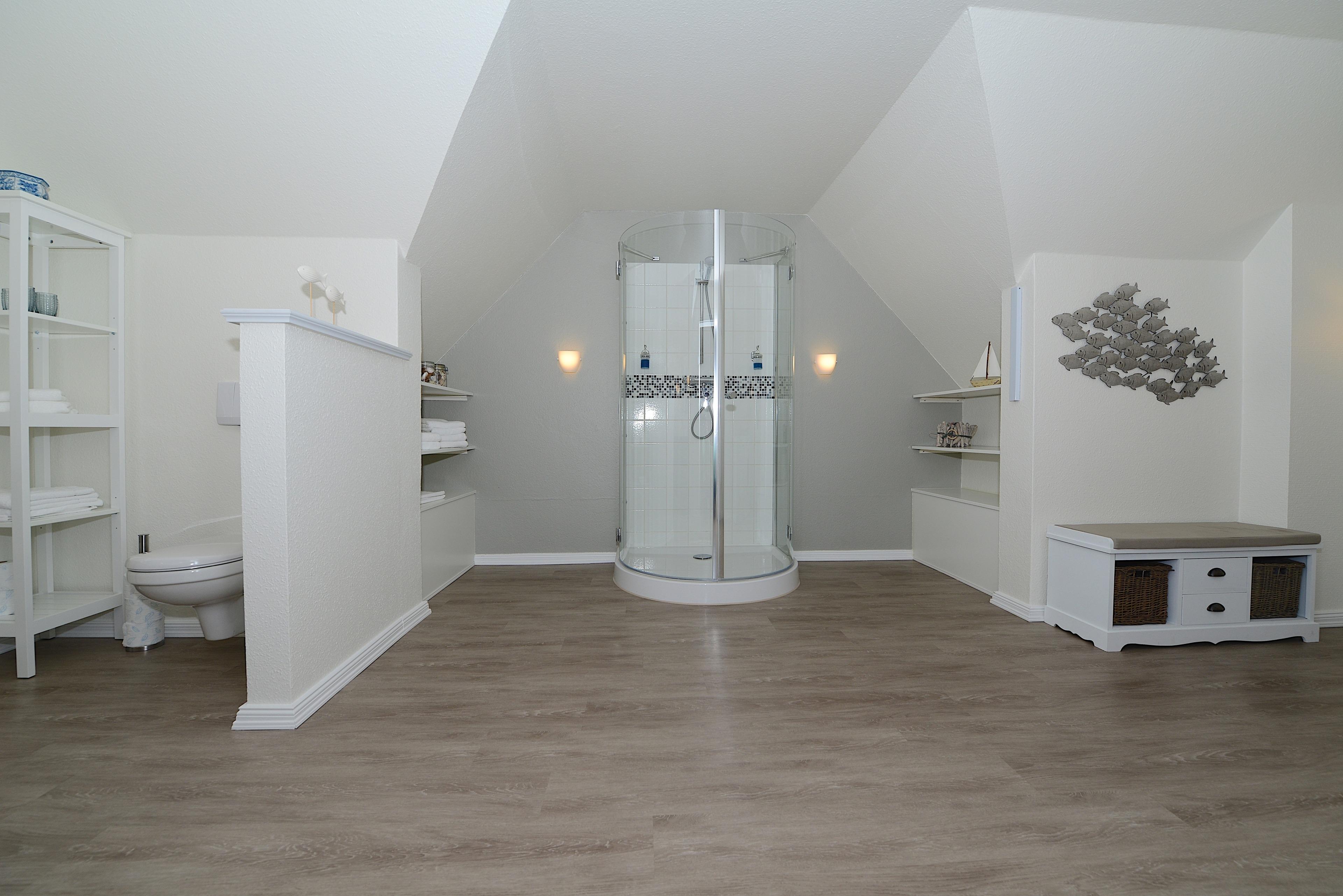 Im Obergeschoss erwartet Sie ein stilvolles Schlafzimmer mit exklusivem Designboden und ein großzügiges Badezimmer. Das Schlafzimmer ist mit einem hochwertigen Doppelbett ausgestattet, das für erholsamen Schlaf sorgt. Ein gemütlicher Ohrensessel lädt zum Entspannen ein. Das Badezimmer bietet Platz für Wellness-Momente mit einer großzügigen Runddusche und einem großen Waschtisch-WC-Bereich. Ein Fön, Waschmaschine und Trockner stehen Ihnen ebenfalls zur Verfügung.