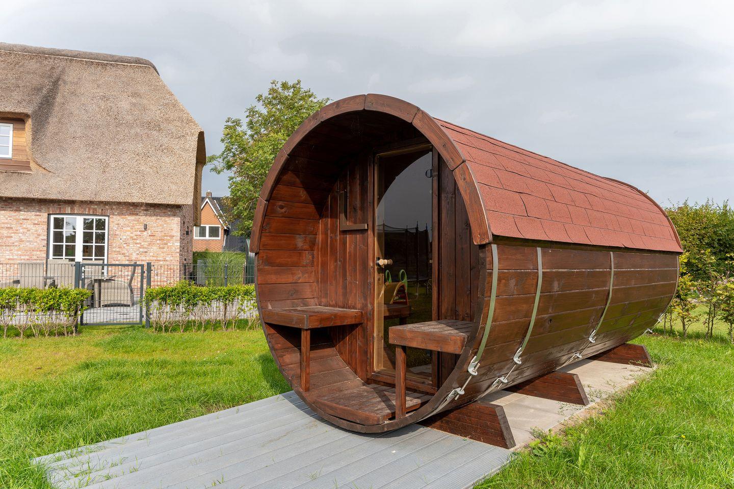 Reetgedeckte Doppelhaushälfte mit Garten, Terrasse und Fasssauna.
