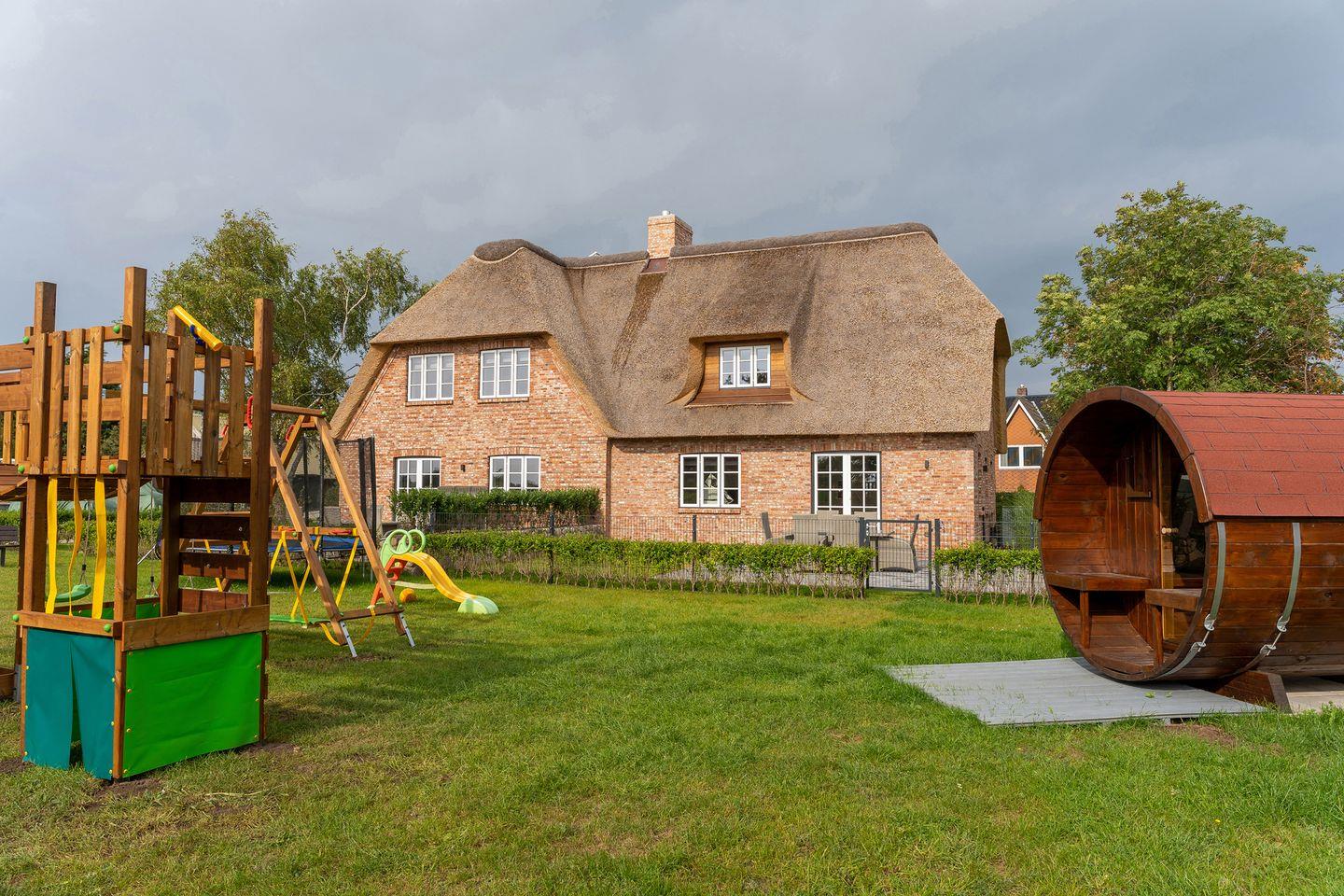 Reetgedeckte Doppelhaushälfte mit Garten, Terrasse und Fasssauna.