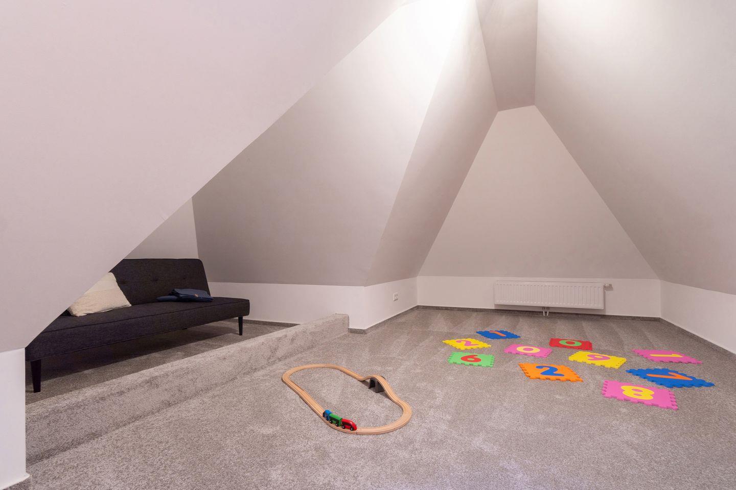 Die 3 Schlafzimmer sowie ein Vollbad mit Badewanne und Dusche sind im Obergeschoss gelegen. Von hier gelangen Sie auch in das Dachgeschoss mit Aufenthaltsraum und Yogamatte.