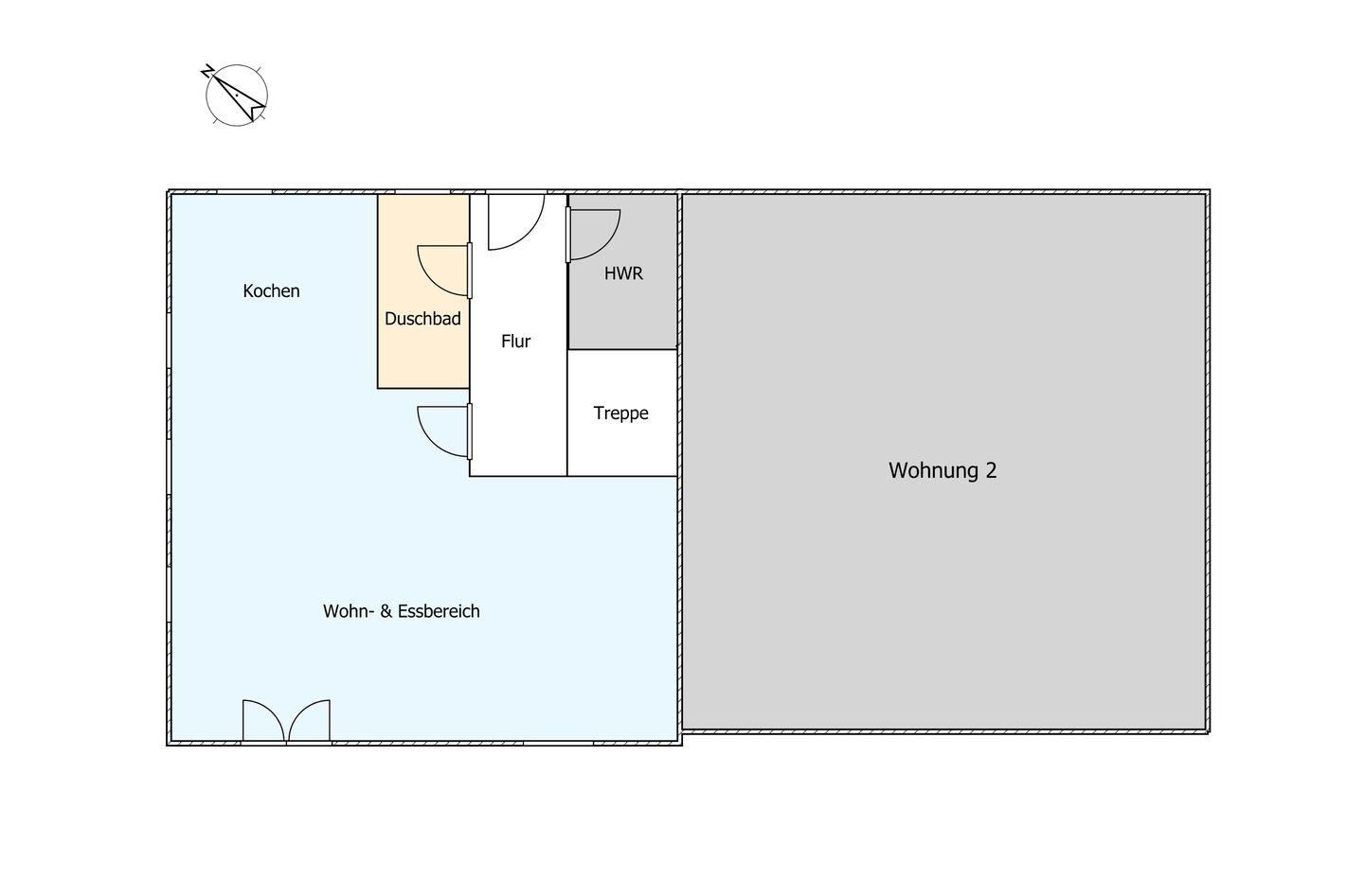 Im Erdgeschoss befindet sich der großzügige Wohn- und Essbereich mit offener Küche sowie ein Duschbad.