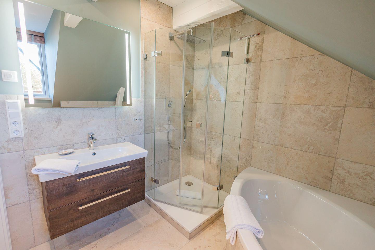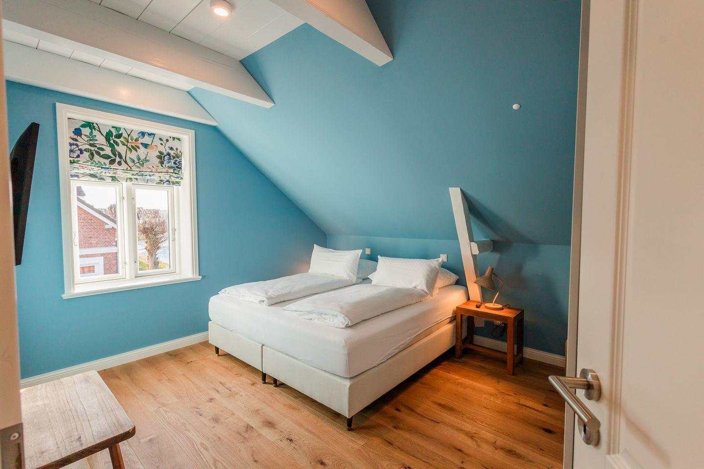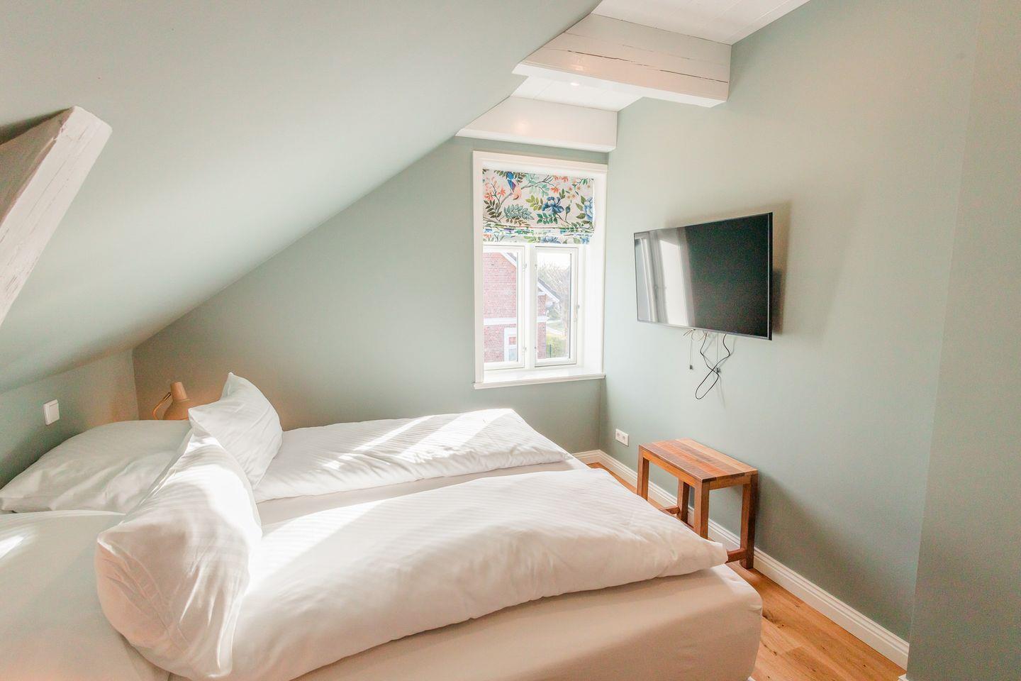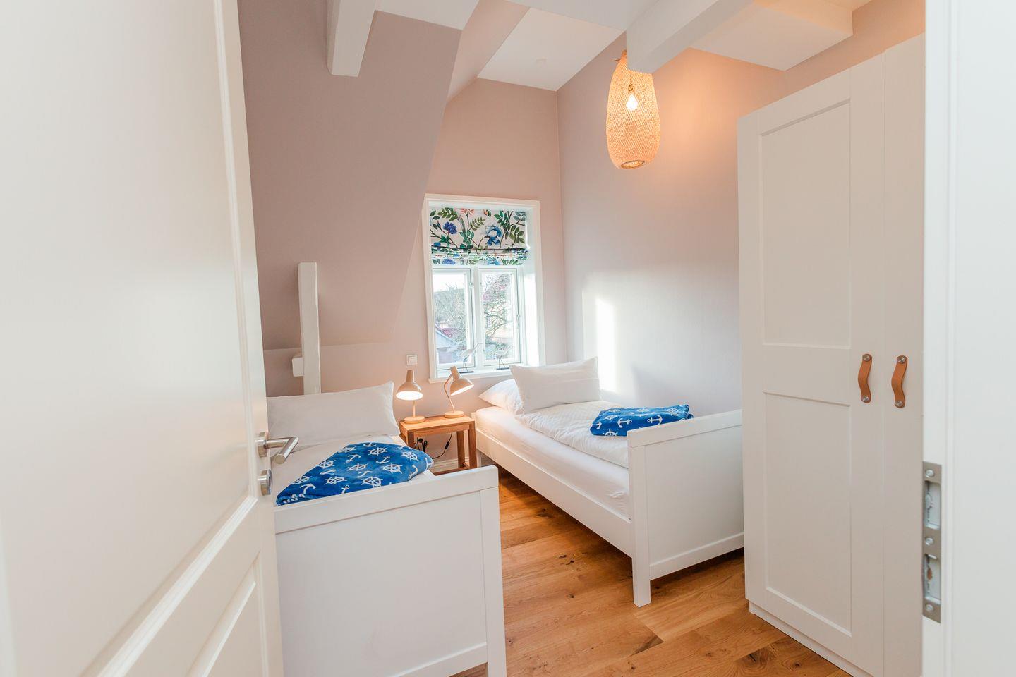 Im Obergeschoss sind die drei Schlafzimmer und ein Vollbad, sowie die hauseigene Sauna gelegen. Zwei Schlafzimmer sind jeweils mit einem Doppelbett ausgestattet, das dritte Schlafzimmer mit zwei Einzelbetten.