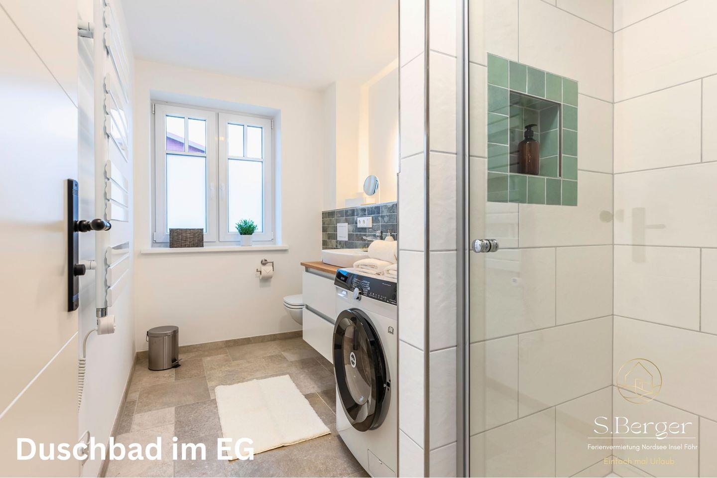 Offener Wohn- und Essbereich mit einer einladenden Sofaecke, einem Esstisch, einem Flachbildfernseher. Die moderne Küche ist ausgestattet mit Herd, Backofen, Geschirrspüler und weiteren Annehmlichkeiten. Das moderne Duschbad verfügt über eine ebenerdige Dusche, eine Waschmaschine, ein Fenster und eine Fußbodenheizung. Ein Schlafzimmer mit Verdunklungsplissees ist ebenfalls vorhanden.