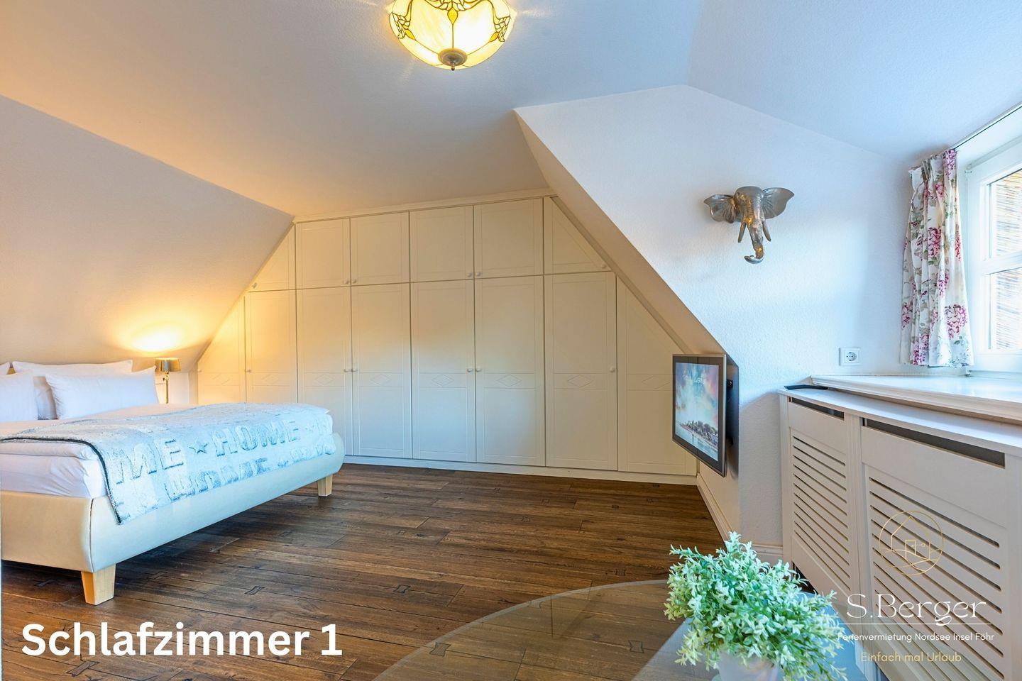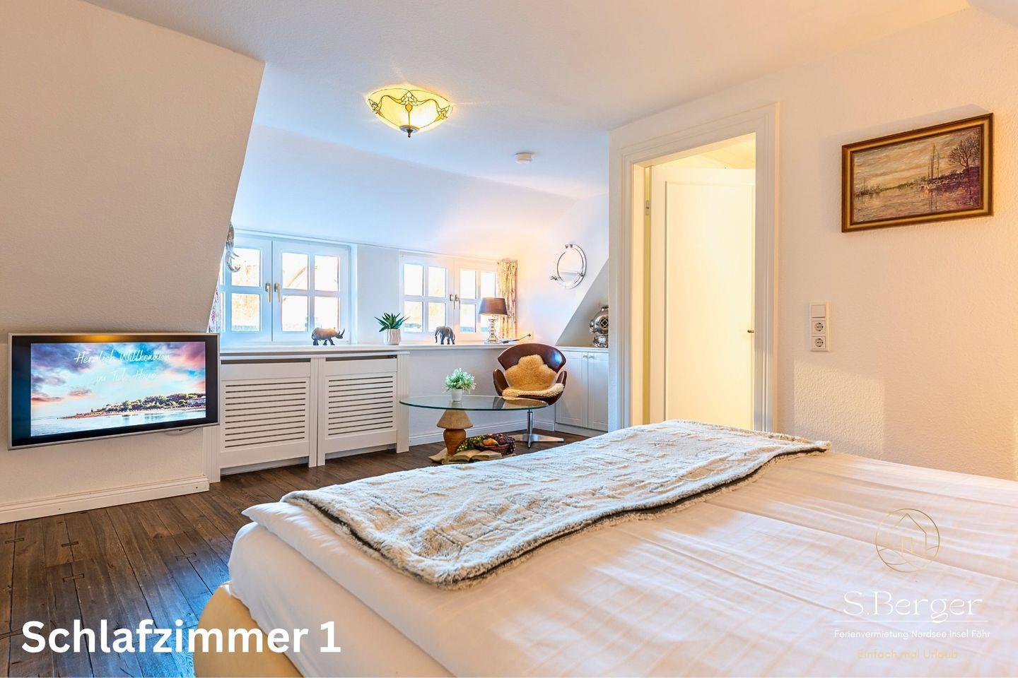 Ein liebevoll eingerichtetes Schlafzimmer mit Fernseher im Obergeschoss garantiert erholsamen Schlaf, während der Einbauschrank reichlich Platz für Kleidung bietet. Das Badezimmer ist mit einer Badewanne, einer Toilette und einem Waschbecken ausgestattet. In der Kammer befinden sich zudem eine Waschmaschine und ein Trockner.