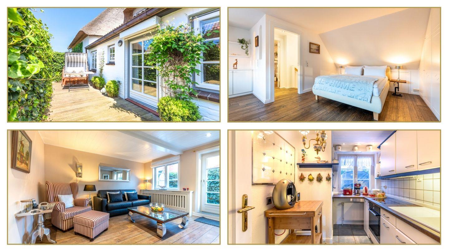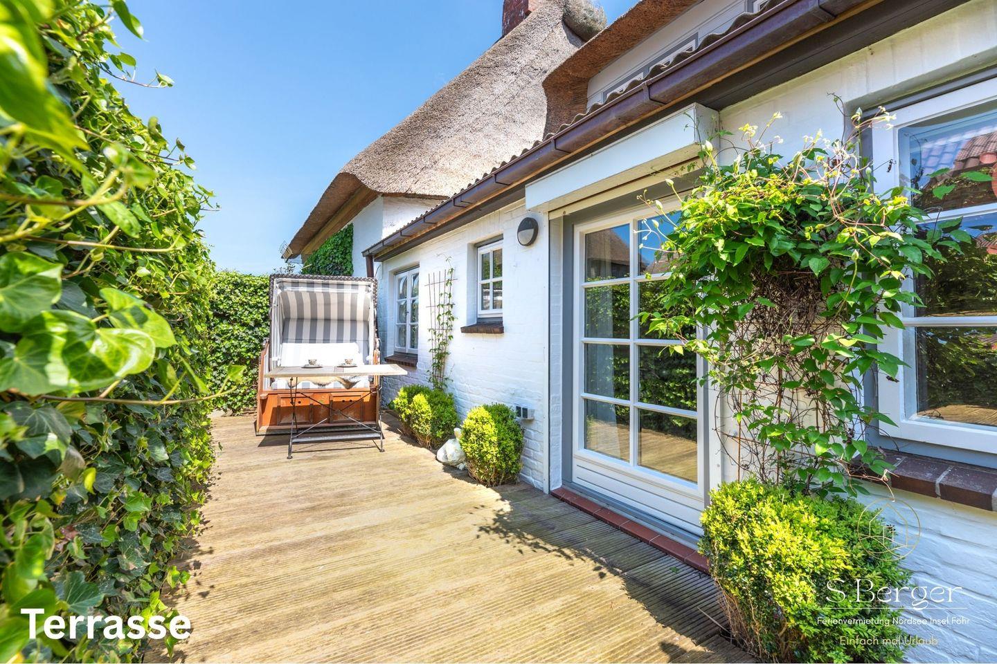 Urlaub unter Reet in ruhiger, idyllischer Lage und einer umzäuter Terrasse mit Strandkorb.