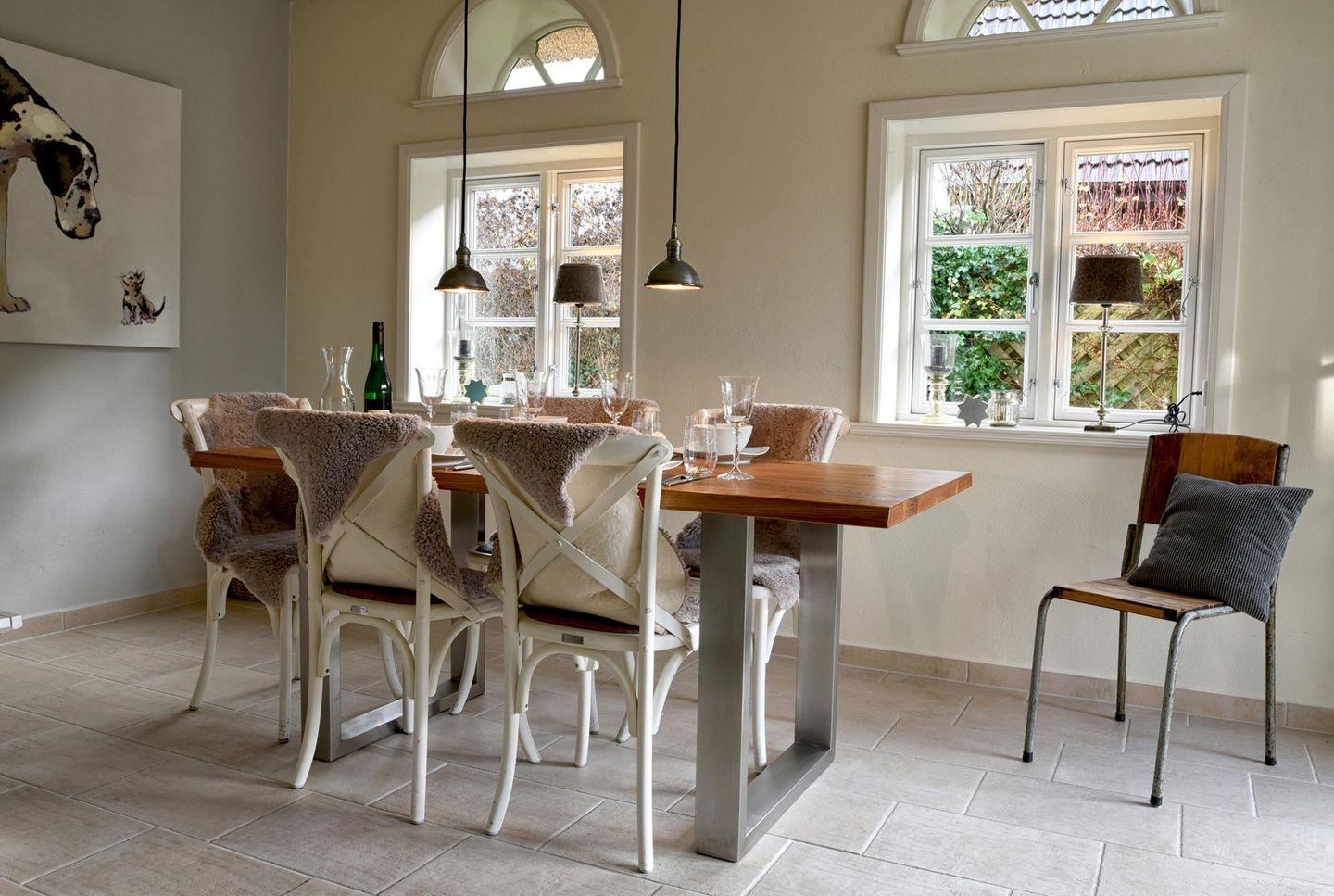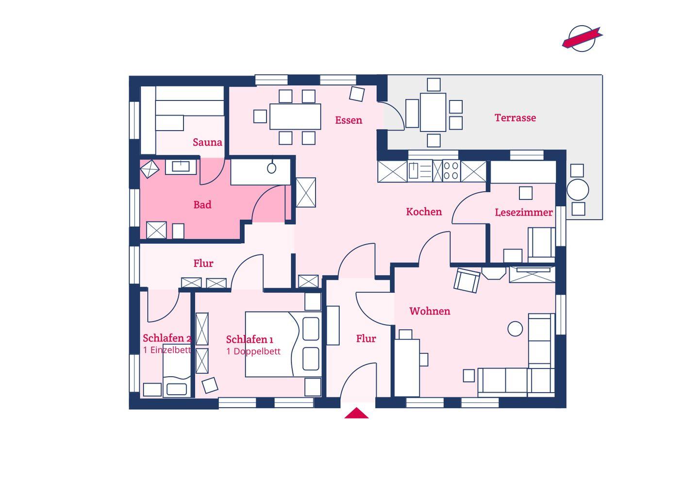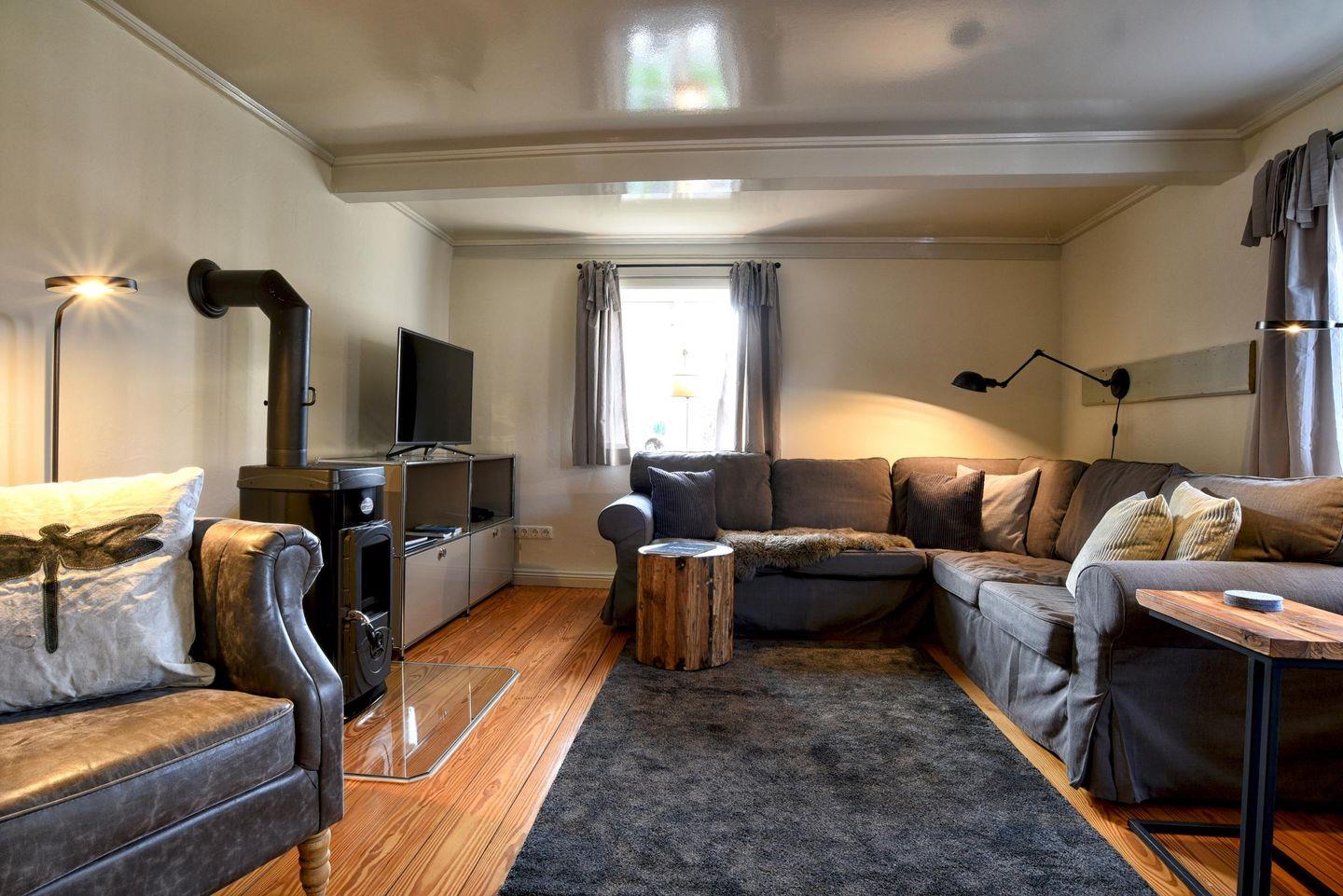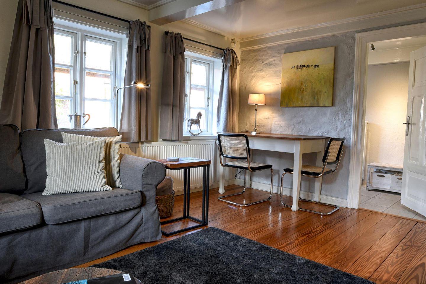Für Feriengäste, die sich vom Alltag erholen, aber auch einmal arbeiten möchten, ist die „Kleine Flucht“ der optimale Rückzugsort. Wunderschön gelegen in einer kleinen Dorfstraße mit Apfelbaumgarten und ausreichend Platz auf der ebenerdigen Wohnfläche bietet das Haus Platz für bis zu zwei Personen. Das Haus erstreckt sich über 90 m². Die voll ausgestattete Küche wird Sie begeistern. Dort finden Sie alles, was das Herz begehrt: von einem Milchaufschäumer bis hin zu einem Waffeleisen, verschiedenen Backformen und diversem Geschirr. Der angrenzende, lichtdurchflutete Essbereich führt direkt zur Terrasse und in den schönen Garten. Das Ferienhaus "Kleine Flucht" verfügt über ein eigenes Lese- bzw. Arbeitszimmer mit einem bequemen Sessel und einem zusätzlichen Schreibtisch. Das Schlafzimmer ist mit einem gemütlichen Doppelbett ausgestattet. Im Duschbad befindet sich eine Sauna, in der Sie sich nach einem windigen Tag entspannen können. Auf gemütlichen Sitzmöbeln im Wohnzimmer findet man Platz zum Lesen, Spielen, Fernsehen und ein kleiner Guss-Ofen wärmt Sie an kalten Tagen. Die "Kleine Flucht" bietet ein WLAN-Netz mit einer Bandbreite von 25.000 MBit/s - ideal, um die eigenen Lieblingsfilme und -serien auch im Urlaub zu streamen!
