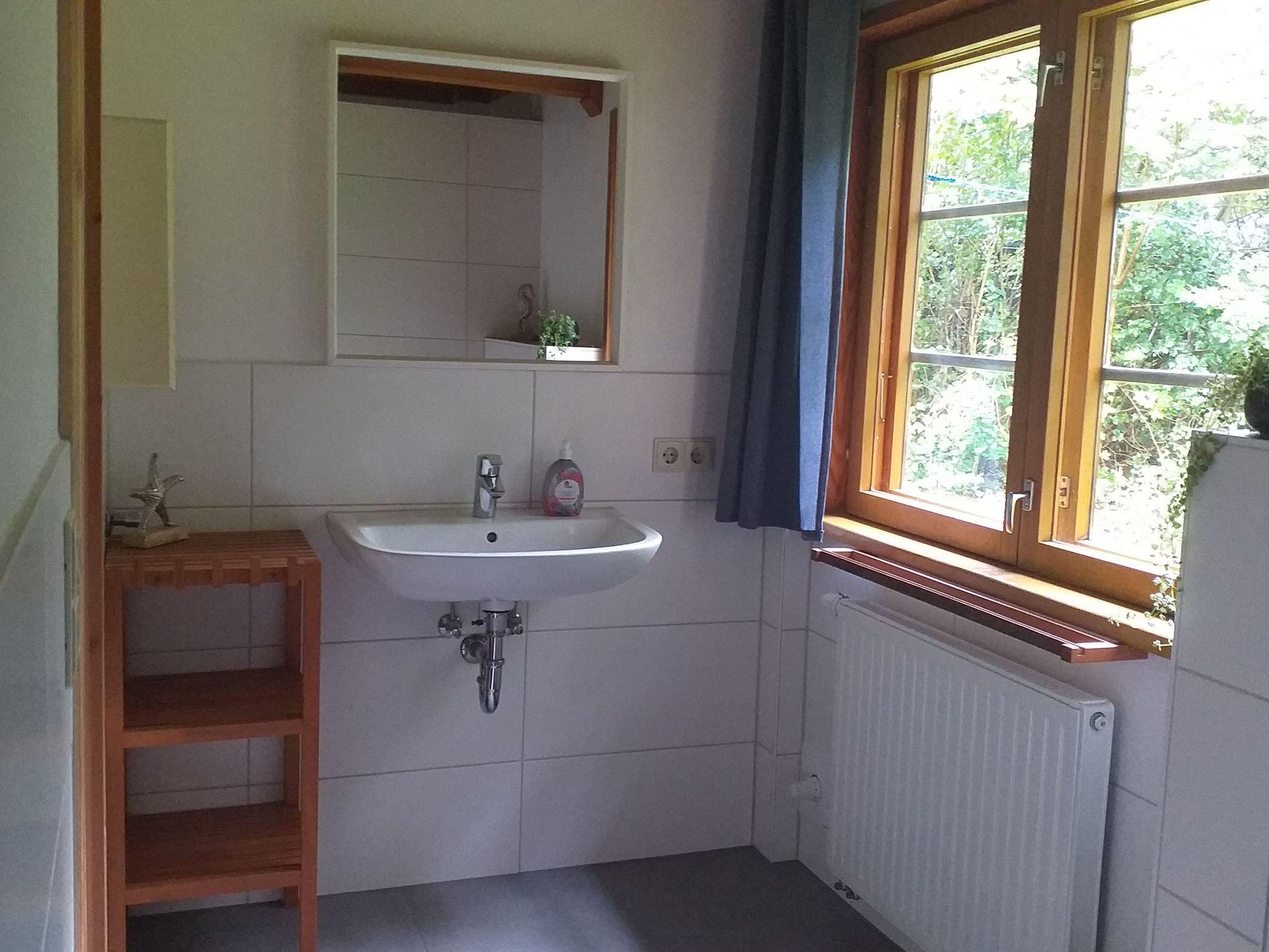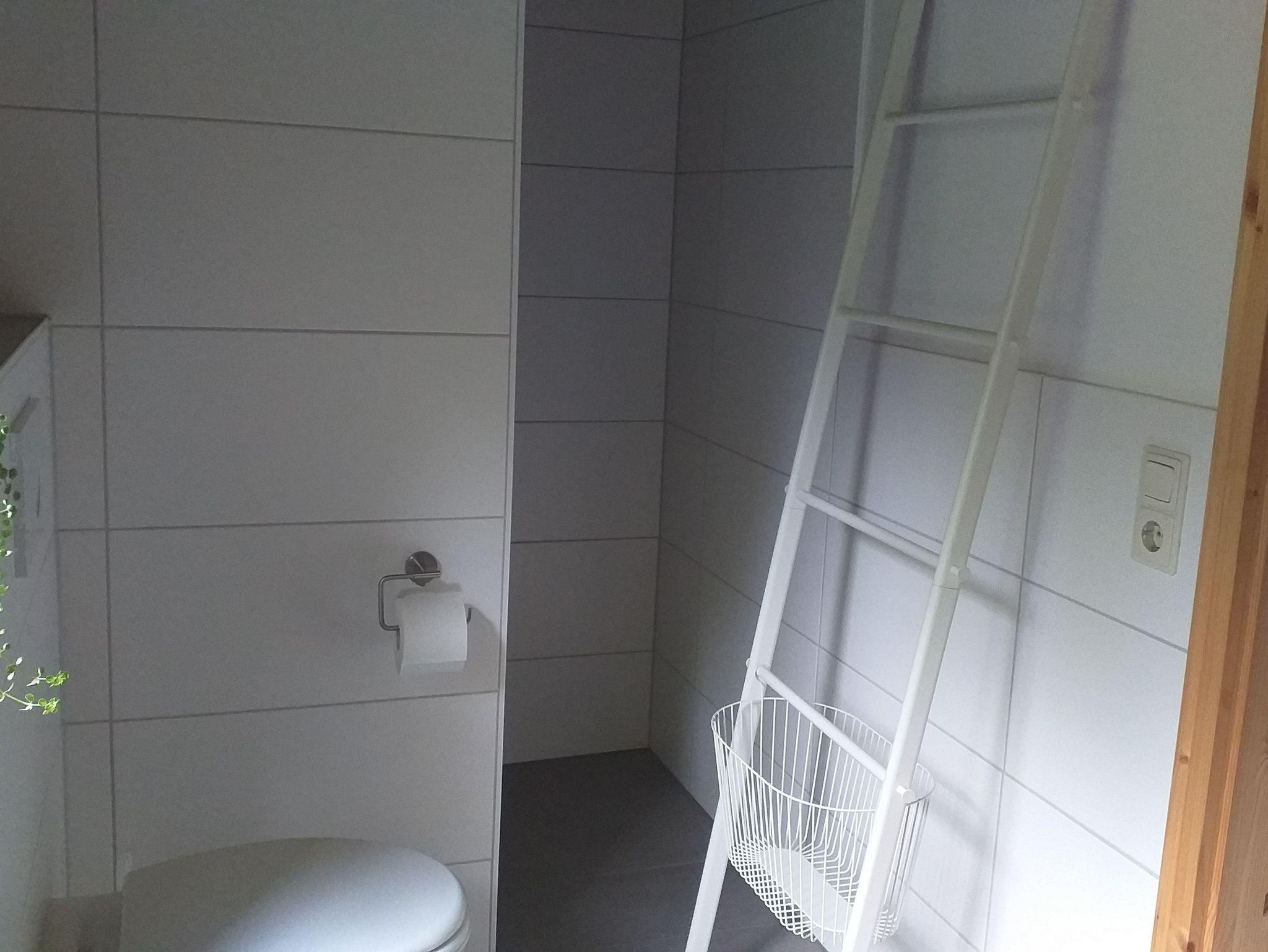 Im Erdgeschoss der Wohnung liegt das große Wohn- und Esszimmer mit gemütlicher Couch, Esstisch, Küchenzeile und dem Duschbad. Über eine recht steile Treppe (oben bietet ein Treppengitter Schutz) geht es auf die Empore, die als ein Schlafraum genutzt wird: hier gibt es neben zwei Betten auch Stauraum für Kleider und Gepäck und von diesem Raum gehen zwei Schlafzimmern mit je zwei Schlafplätzen ab: von beiden Zimmern hat man Zugang zu dem geschützten Balkon mit Blick auf den Hof und in die Natur. Die Küchenzeile ist klein, aber fein - sie ist vollständig ausgestattet mit Kühlschrank, Backofen, Kaffeemaschine und Co., nur gespült werden muss von Hand. Das Bad liegt im Erdgeschoss und ist modern gestaltet: neben Waschtisch und Toilette gibt es eine ebenerdige Dusche.
