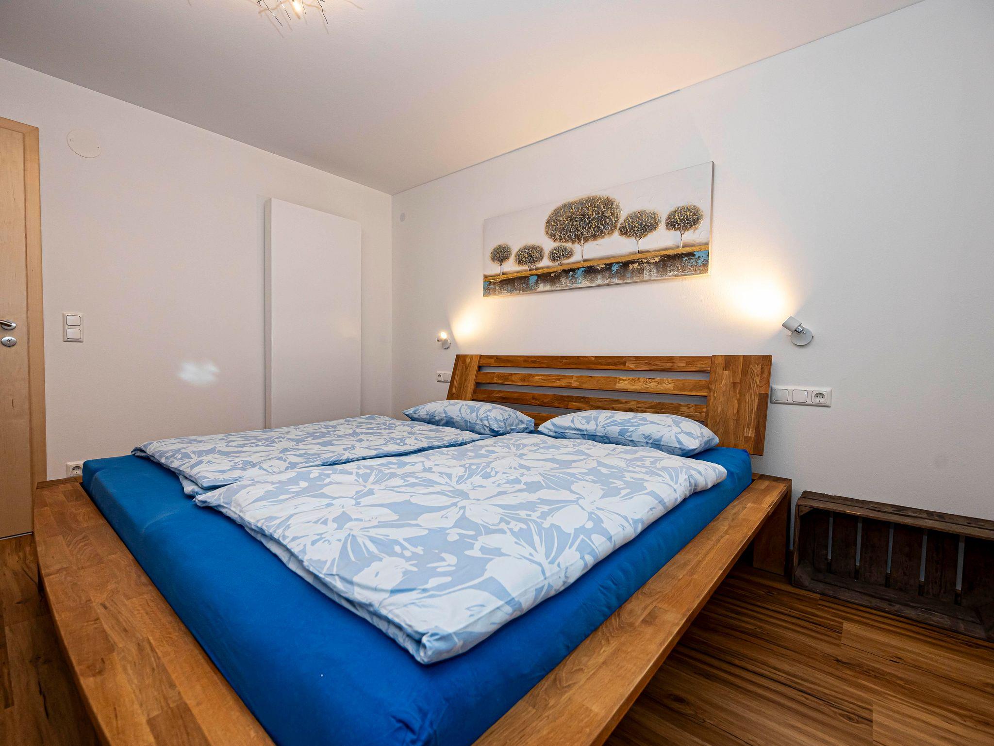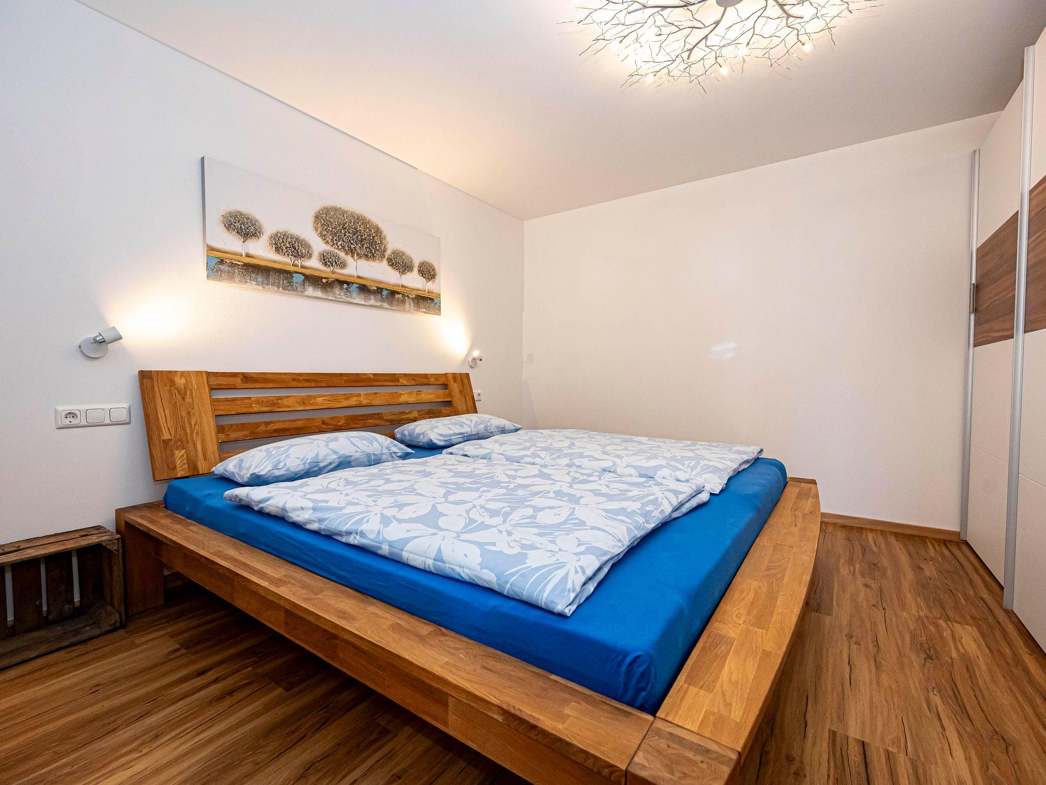 Das Doppelbett 200x200 cm Liegefläche und das Stockbett mit 2 mal 90x200cm Liegefläche befinden sich in einem Raum mit einem Sichtschutz (Schrank) dazwischen. Im Wohnzimmer steht ein Sofa auf dem auch ein Kind schlafen könnte. Auf Anfrage stellen wir ein Baby Reisebett zur Verfügung.