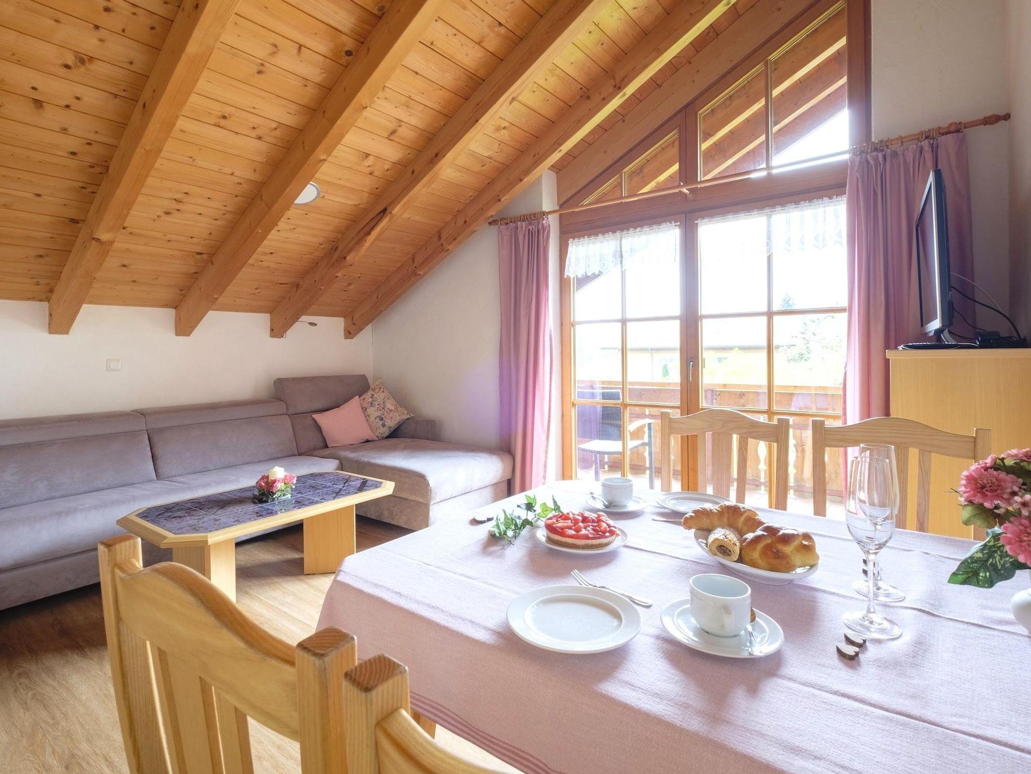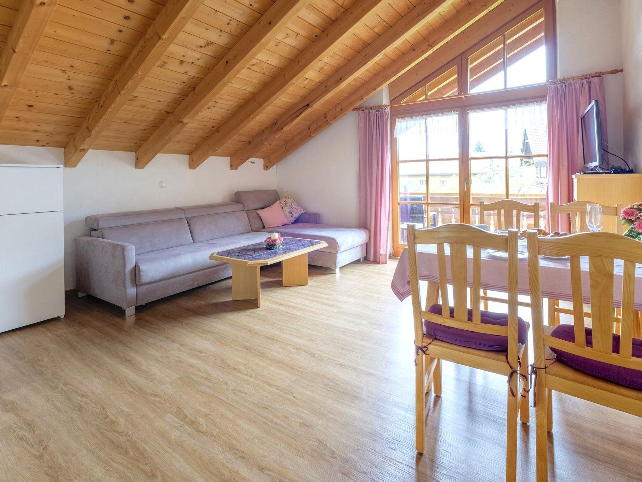 geräumiges, separates Schlafzimmer (Zustellbett möglich), Wohnraum mit ausziehbarer Couchgarnitur, Küchenecke (Spülmaschine, Backofen)Esstisch, Dusche/WC, SAT-TV, Radio, kostenloses WLAN, Südbalkon mit herrlichem Blick auf die Allgäuer Alpen.