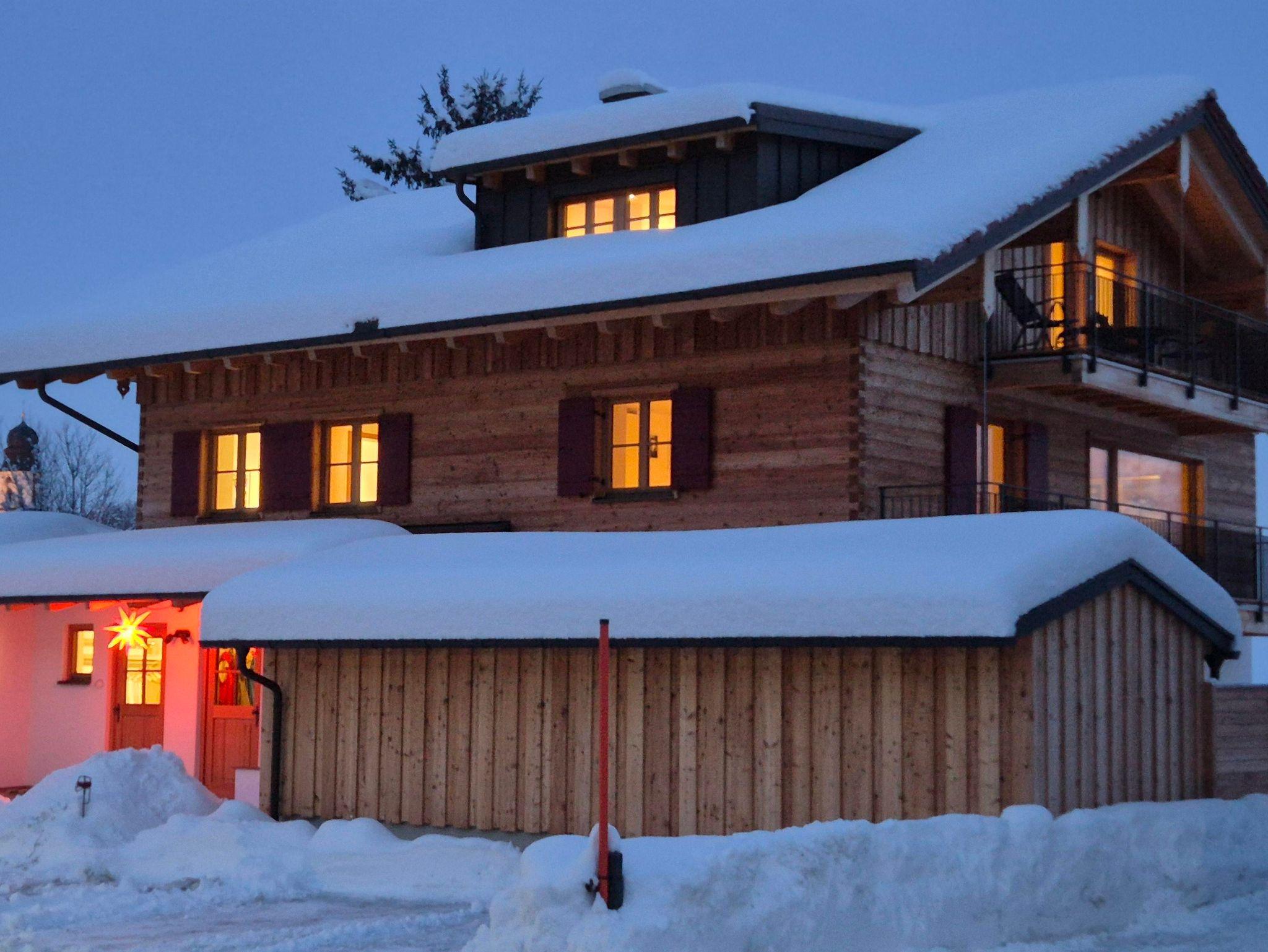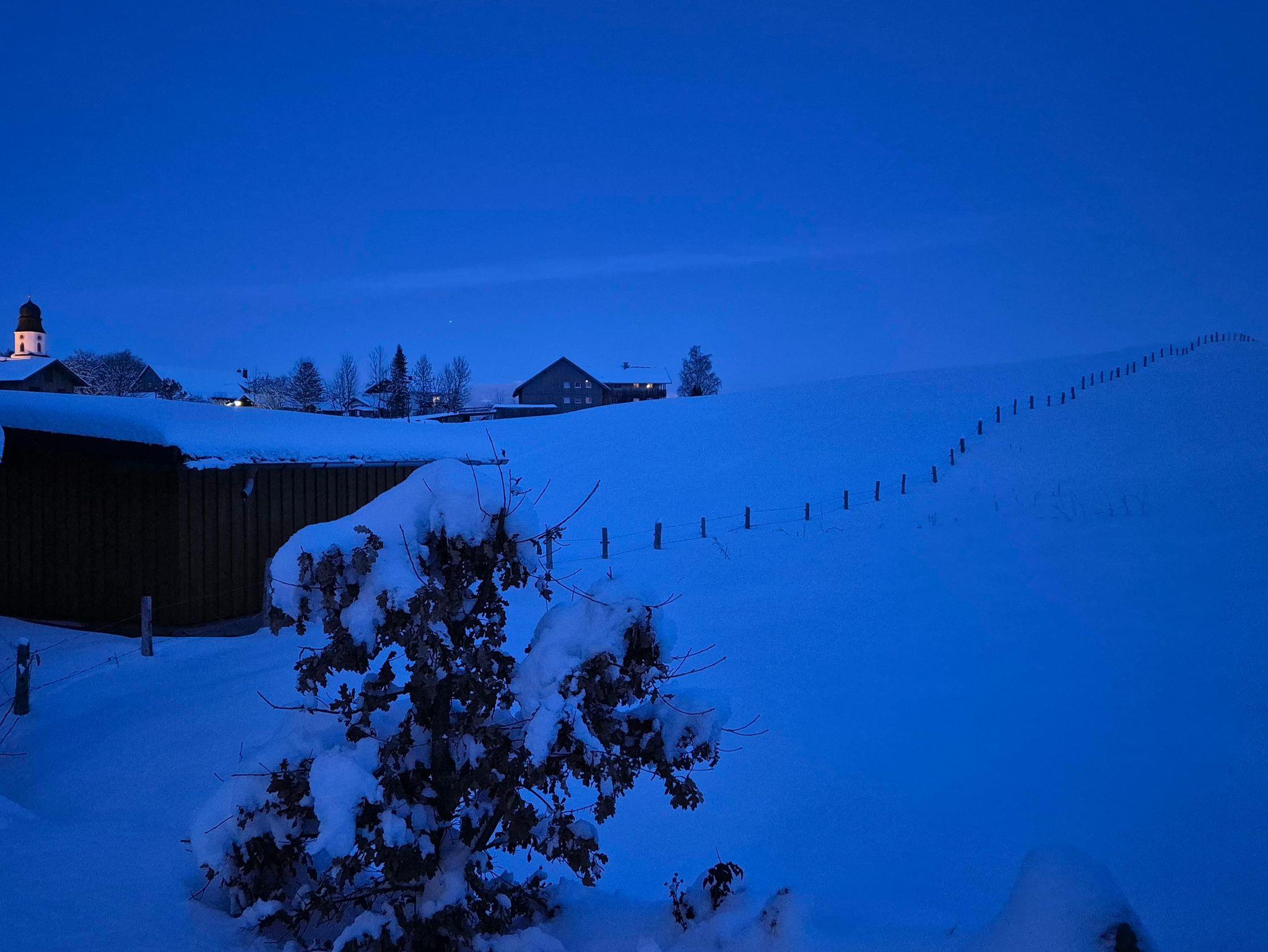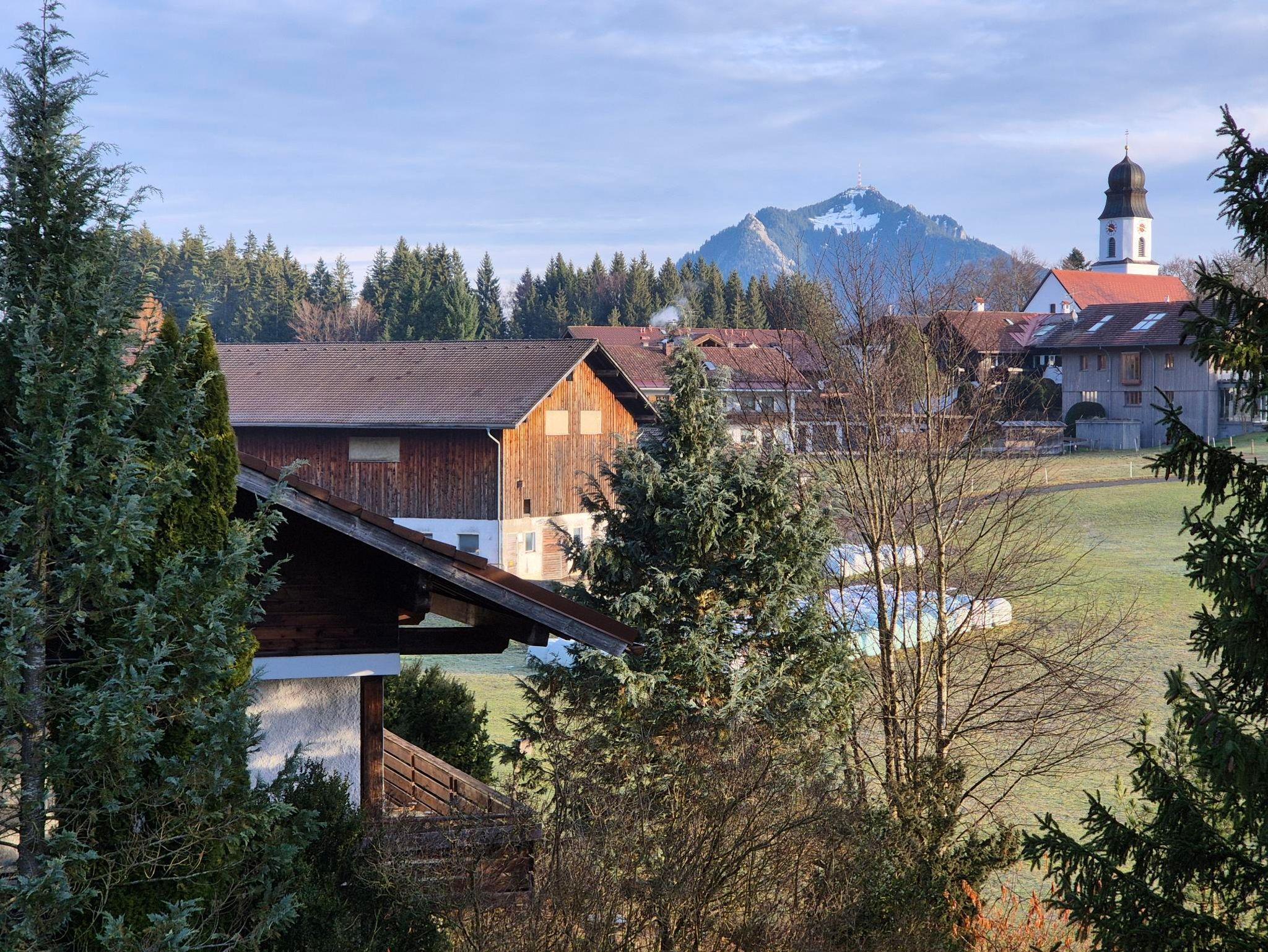 Bergblick in alle 4 Himmelsrichtungen: Die Aussicht vom großzügigen Südbalkon geht in Richtung Kleinwalsertal; Oberstdorf wird durch ein kleines Wäldchen verdeckt; hier sind regelmäßig Rehe oder Füchse am Waldrand zu sehen. In Richtung Osten, vom Balkon aus oder durch das Dachflächenfenster, blickt man auf die Sonnenköpfe. Im Bad und Schlafzimmer mit Blick Richtung Norden hat man einen schönen Blick auf den Grünten und die Ofterschwanger Kirche. In der Küche schließlich blickt man auf den Wald am Ofterschwanger Horn und die Bergbahn.