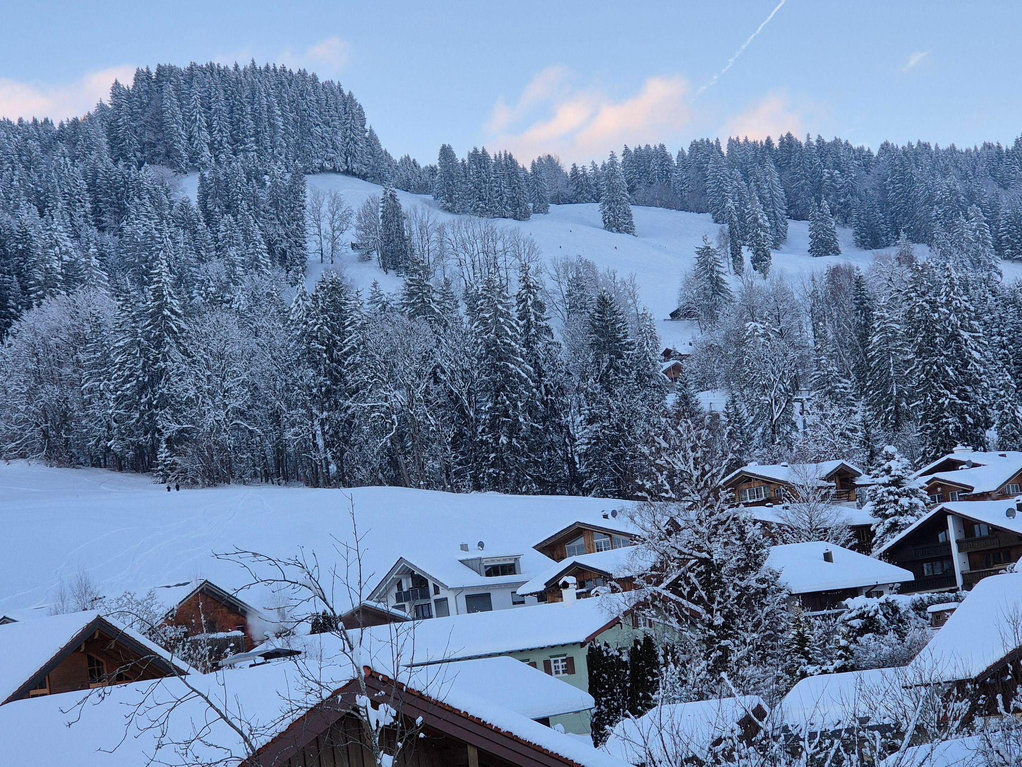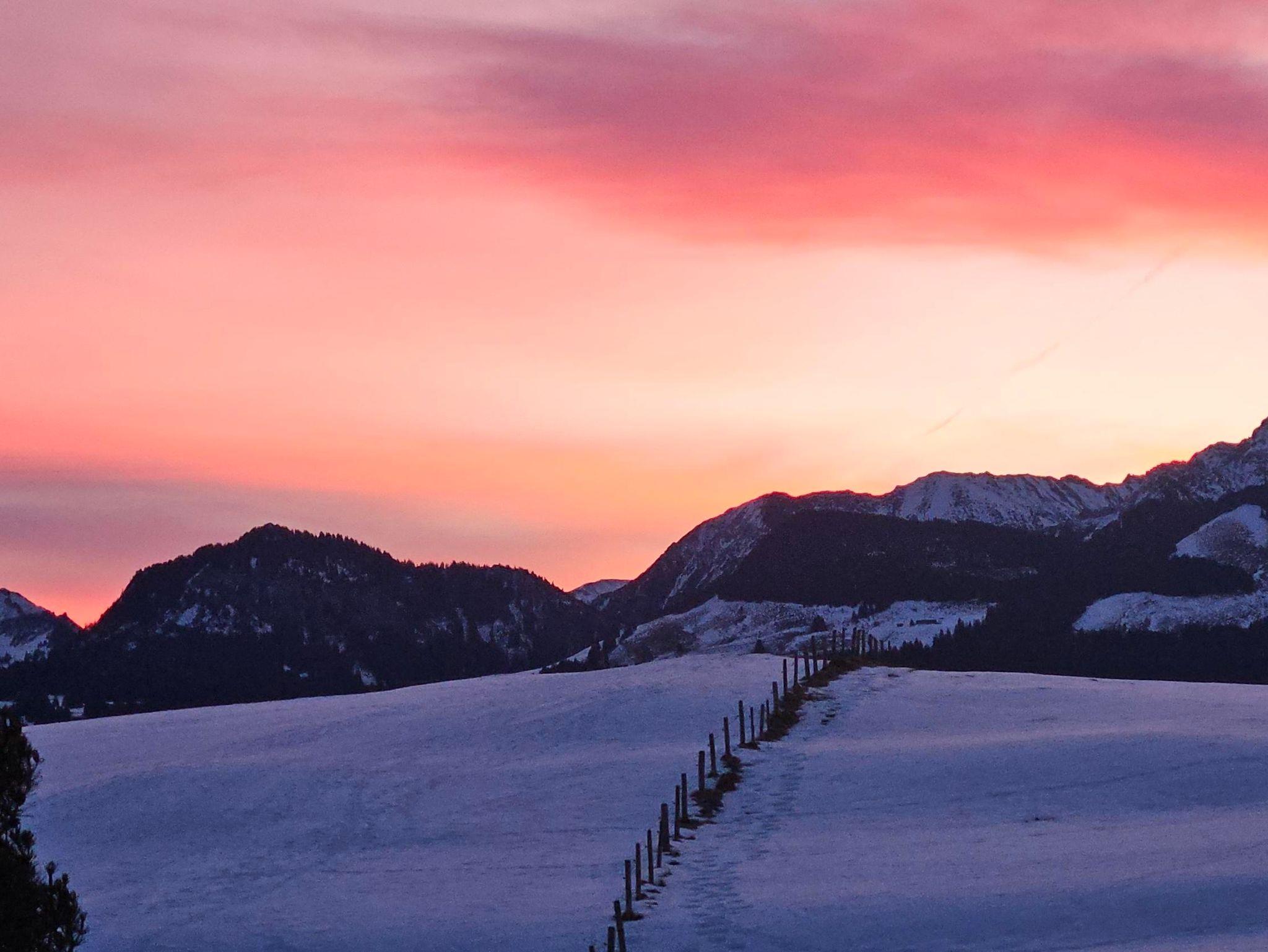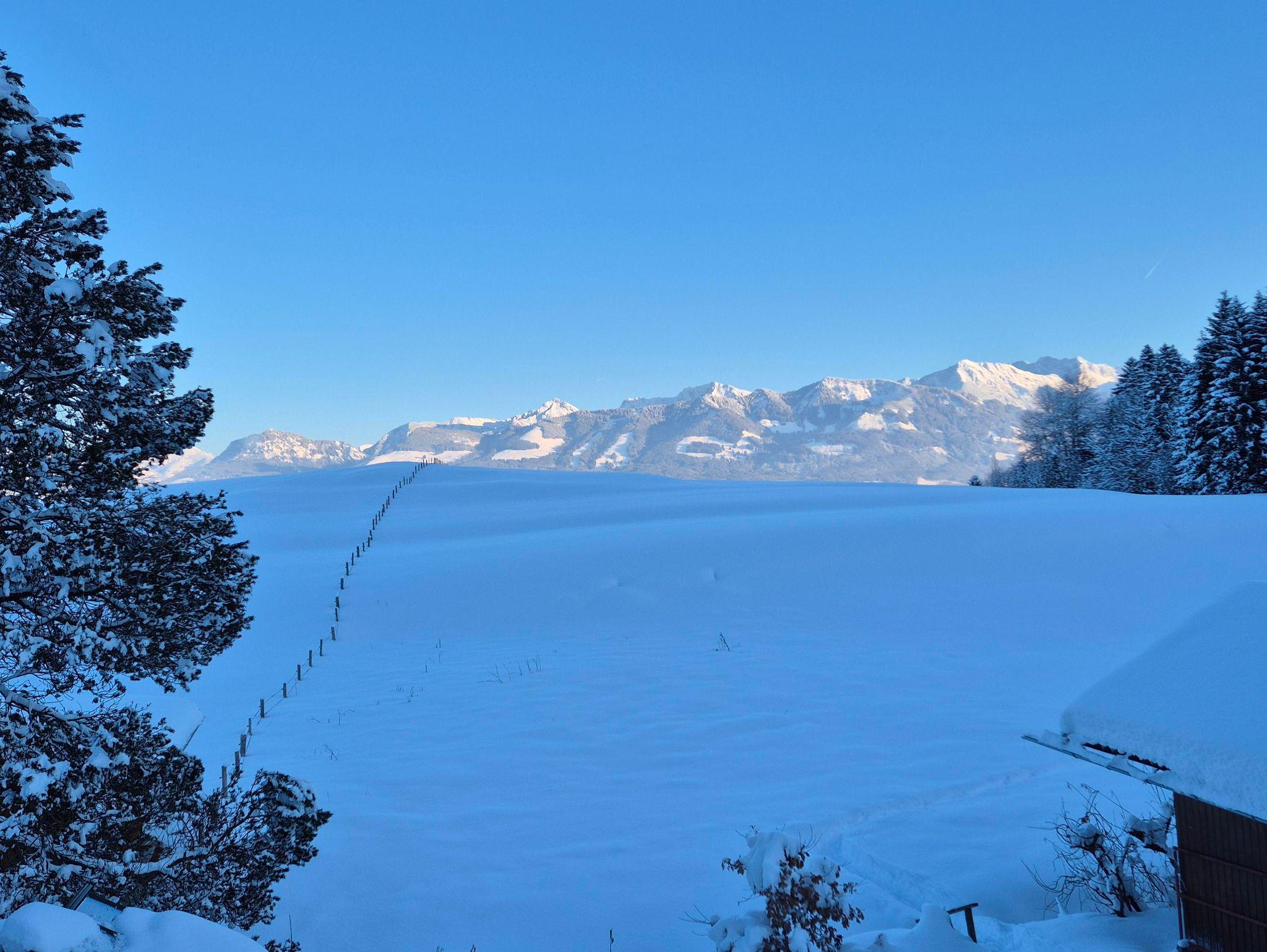 Bergblick in alle 4 Himmelsrichtungen: Die Aussicht vom großzügigen Südbalkon geht in Richtung Kleinwalsertal; Oberstdorf wird durch ein kleines Wäldchen verdeckt; hier sind regelmäßig Rehe oder Füchse am Waldrand zu sehen. In Richtung Osten, vom Balkon aus oder durch das Dachflächenfenster, blickt man auf die Sonnenköpfe. Im Bad und Schlafzimmer mit Blick Richtung Norden hat man einen schönen Blick auf den Grünten und die Ofterschwanger Kirche. In der Küche schließlich blickt man auf den Wald am Ofterschwanger Horn und die Bergbahn.