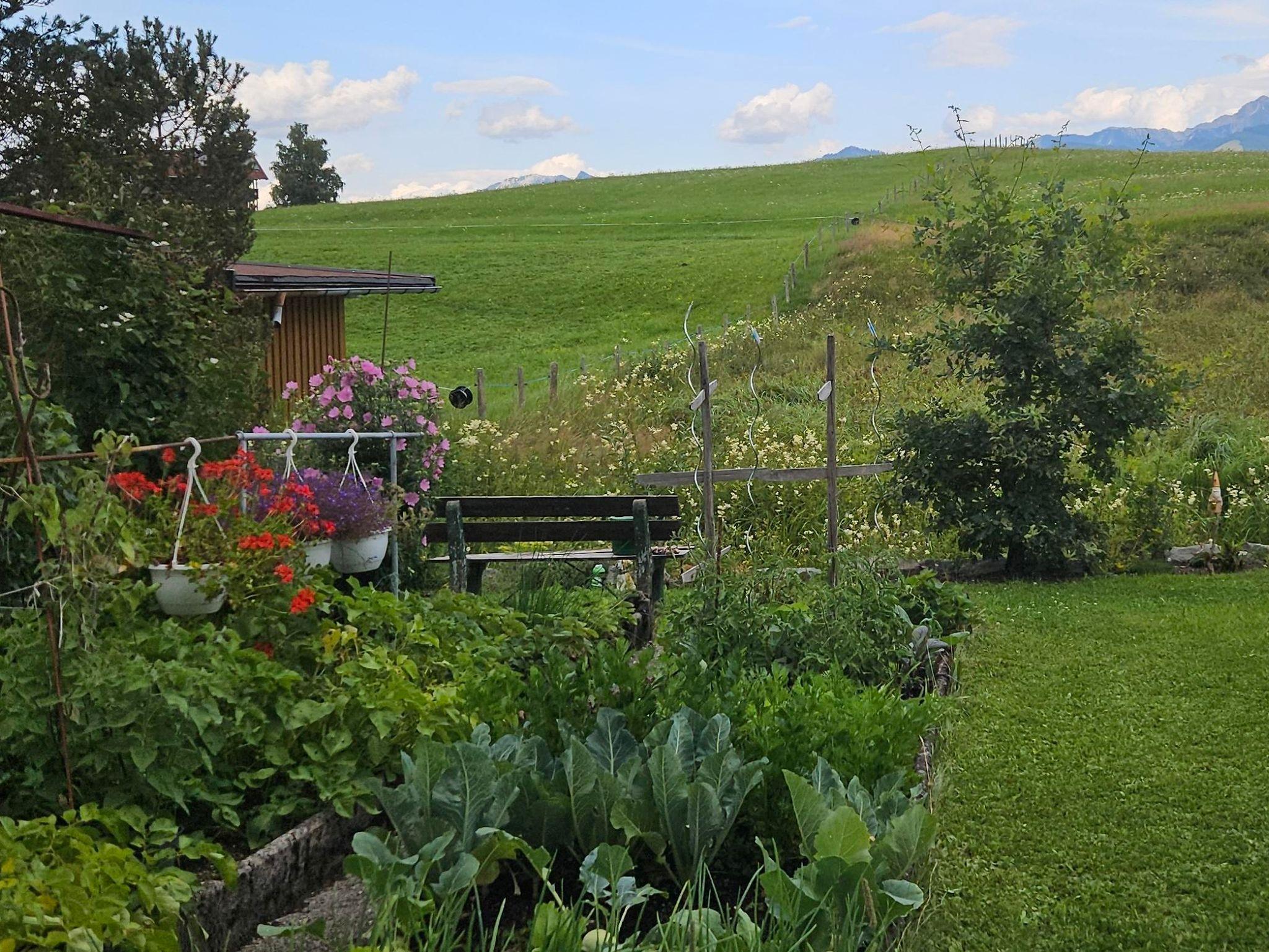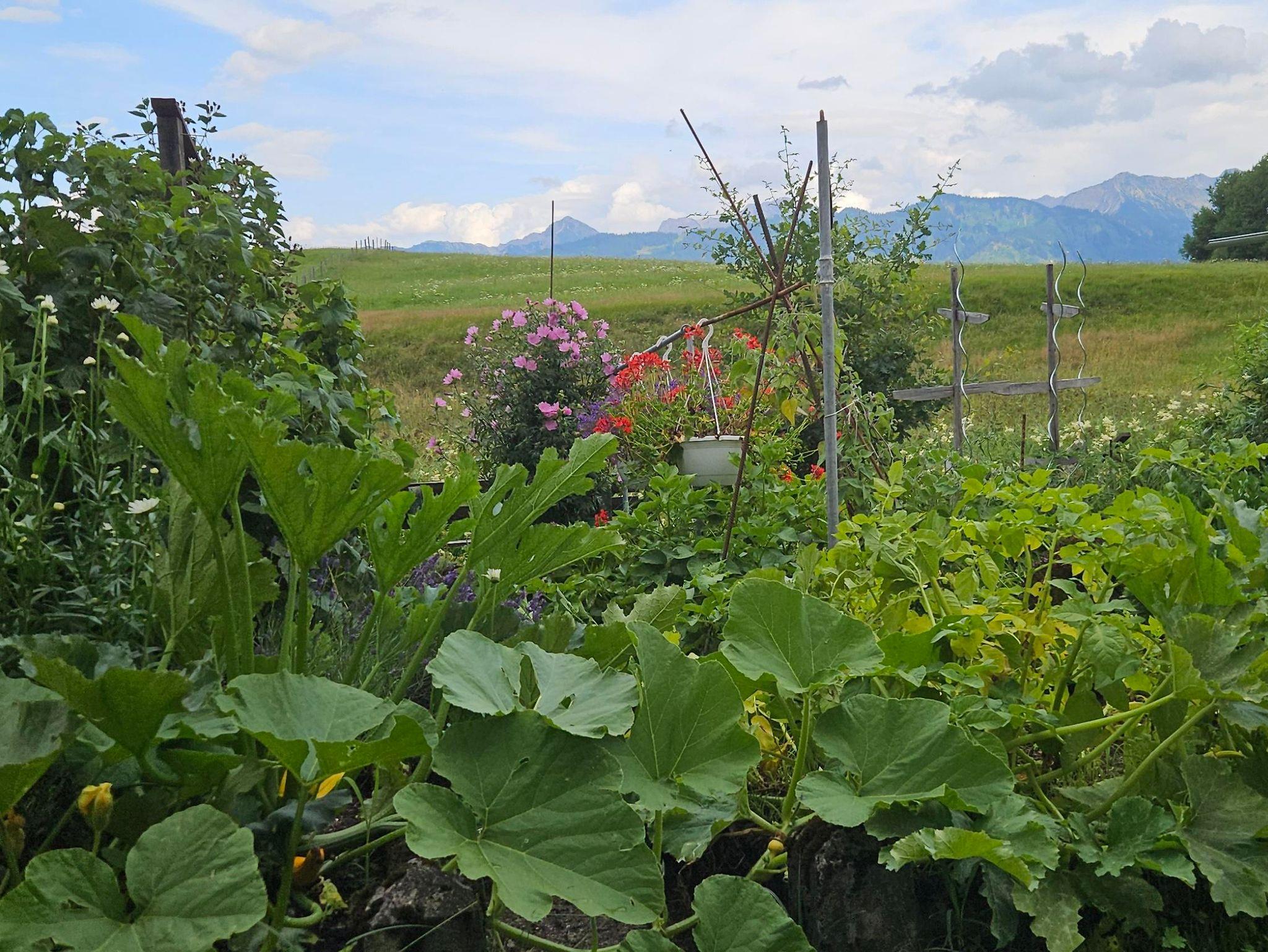 Der Garten des Hauses liegt am Riedbach und gegenüber befinden sich bewirtschaftete Felder und ein kleines Wäldchen. Im Sommer können die Kinder am Bach spielen. Der eigene Gartenzugang für die Ferienwohnung ist neben der Garage; der Garten kann in Teilen mitgenutzt werden (Liege- und Rasenflächen, Bach mit Wasserbausteinen, Terrasse am Bach). Fahrräder können gerne untergestellt werden.
