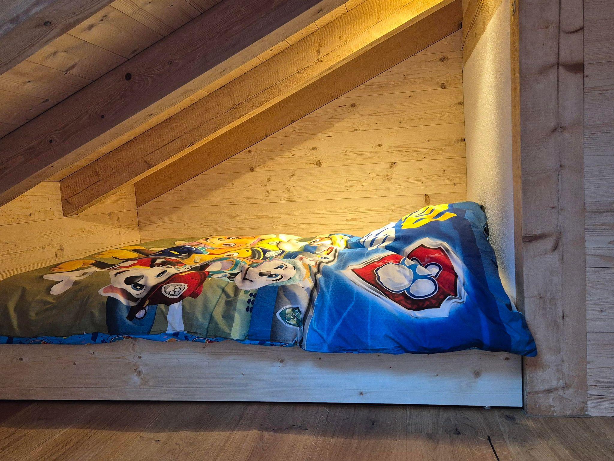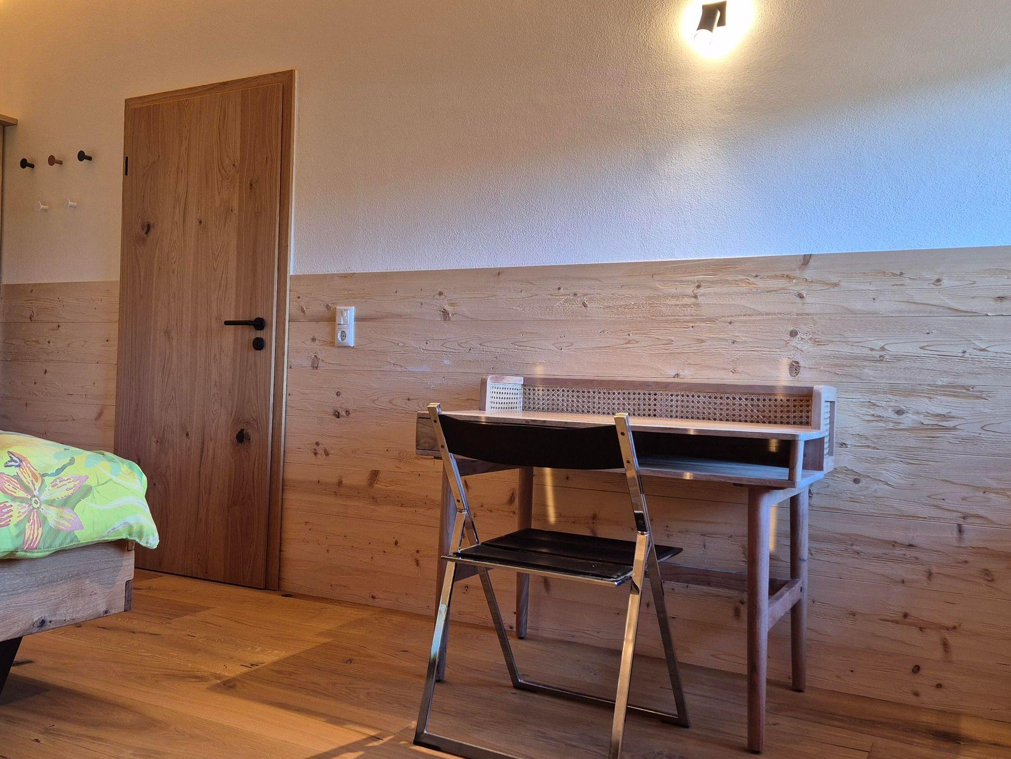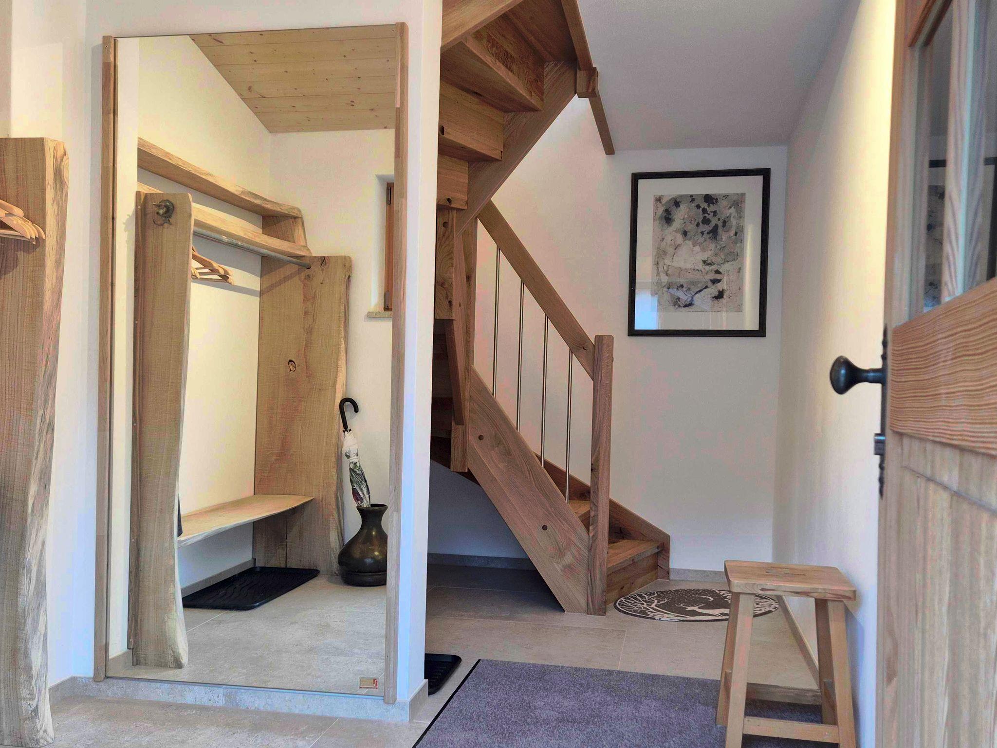 Der Boden des Balkons und die Außenfassade bestehen aus Lärchenholz. Die Wände der Wohnung sind größtenteils mit gehacktem Fichtenholz verkleidet. Die Garderobe im EG und der offene Kleiderschrank im DG wurden aus einem Eichestamm aus heimischen Wald gebaut. Die verschiedenen Hölzer führen zu einer sehr angenehmen und natürlichen Atmosphäre; andererseits können Holzspleiße / Splitter auftreten und man sollte etwas Obacht geben.