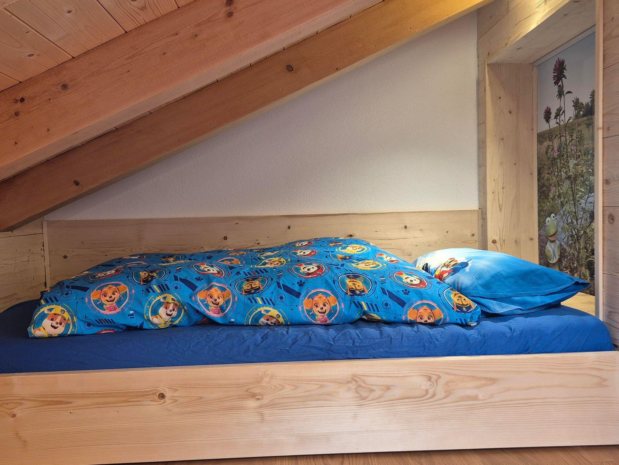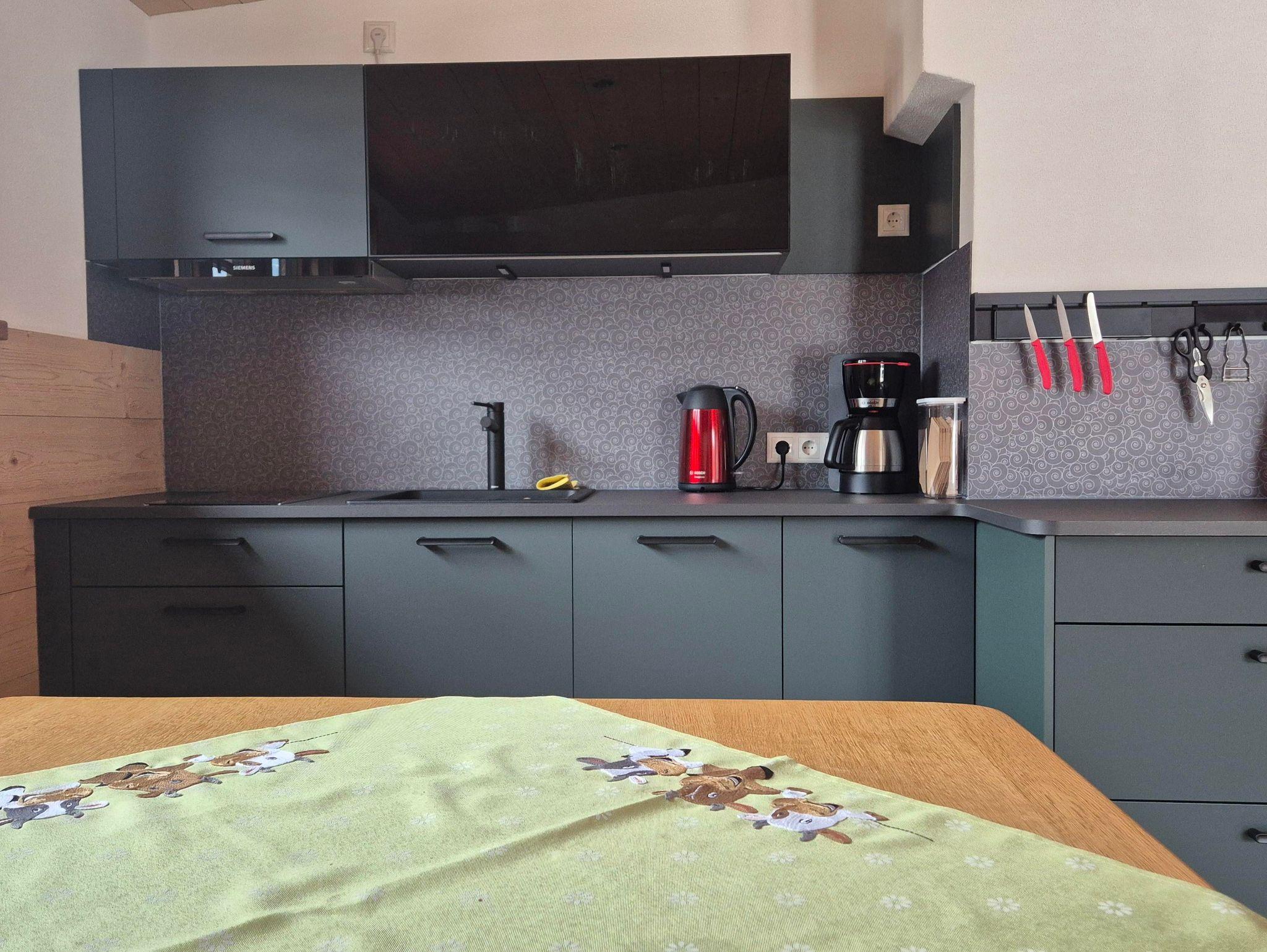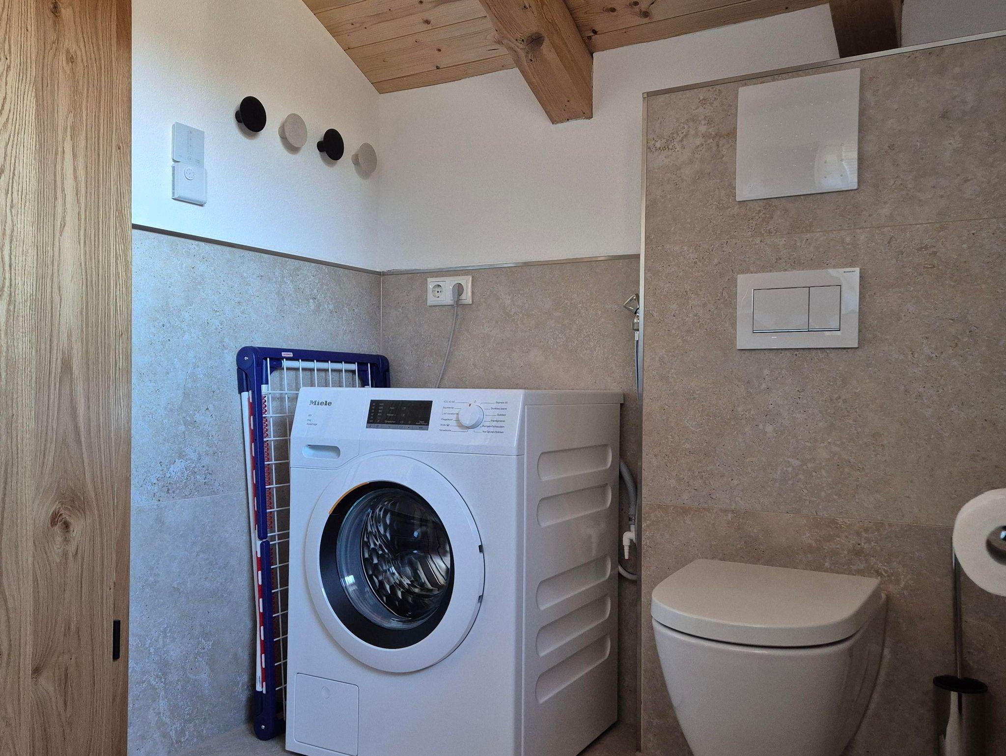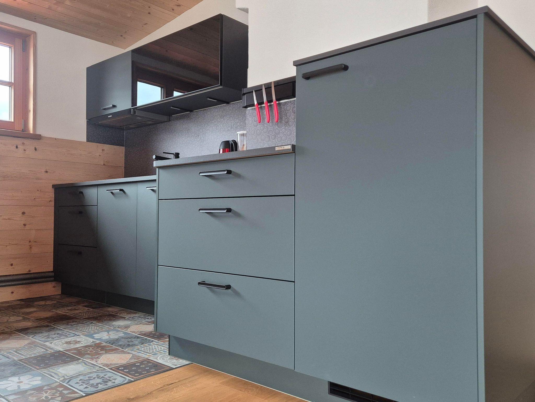 Der Boden des Balkons und die Außenfassade bestehen aus Lärchenholz. Die Wände der Wohnung sind größtenteils mit gehacktem Fichtenholz verkleidet. Die Garderobe im EG und der offene Kleiderschrank im DG wurden aus einem Eichestamm aus heimischen Wald gebaut. Die verschiedenen Hölzer führen zu einer sehr angenehmen und natürlichen Atmosphäre; andererseits können Holzspleiße / Splitter auftreten und man sollte etwas Obacht geben.