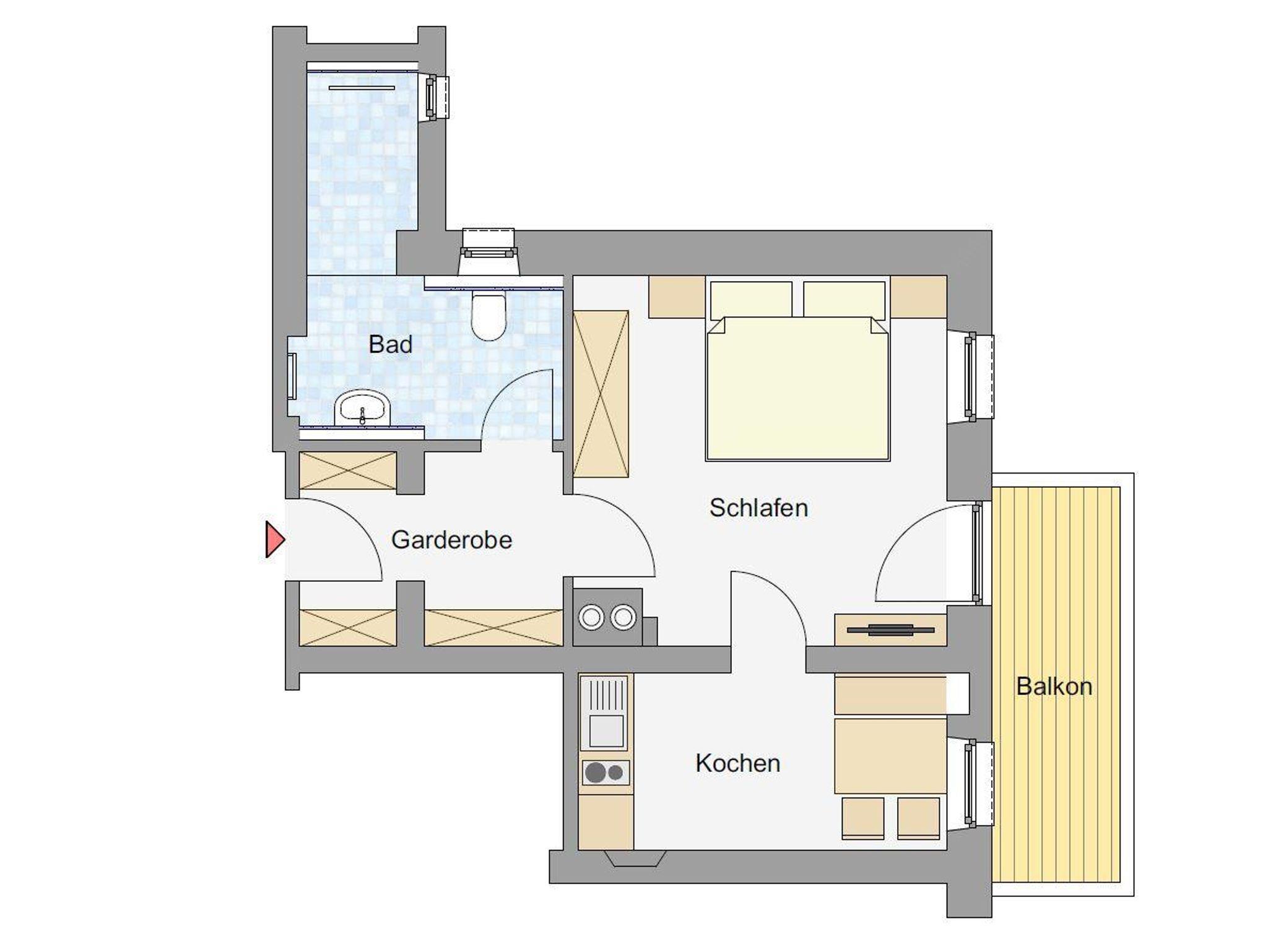 Im gemütlichen Wohn-/Schlafzimmer befindet sich ein Doppelbett, ein Schrank für Ihre Utensilien und ein großer Flachbildschirm mit SAT/TV. Die Wohnung liegt auf der Ostseite des Hauses, so daß Sie morgens von der Sonne geweckt werden und gemütlich auf dem kleinen Ostbalkon frühstücken können.