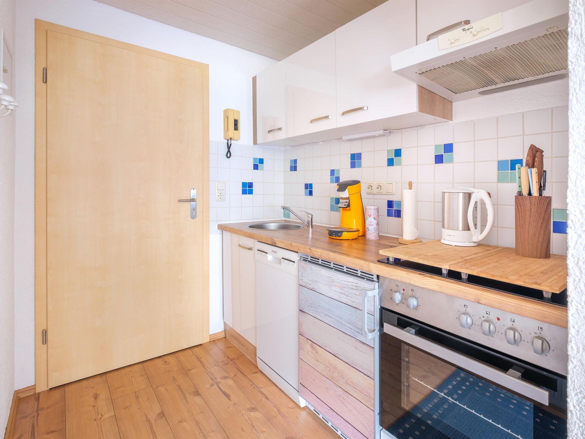 Das Appartement ist ausgestattet mit einer Küche, einem Schlafzimmer mit Doppelbett sowie einem Badezimmer mit Dusche und WC.