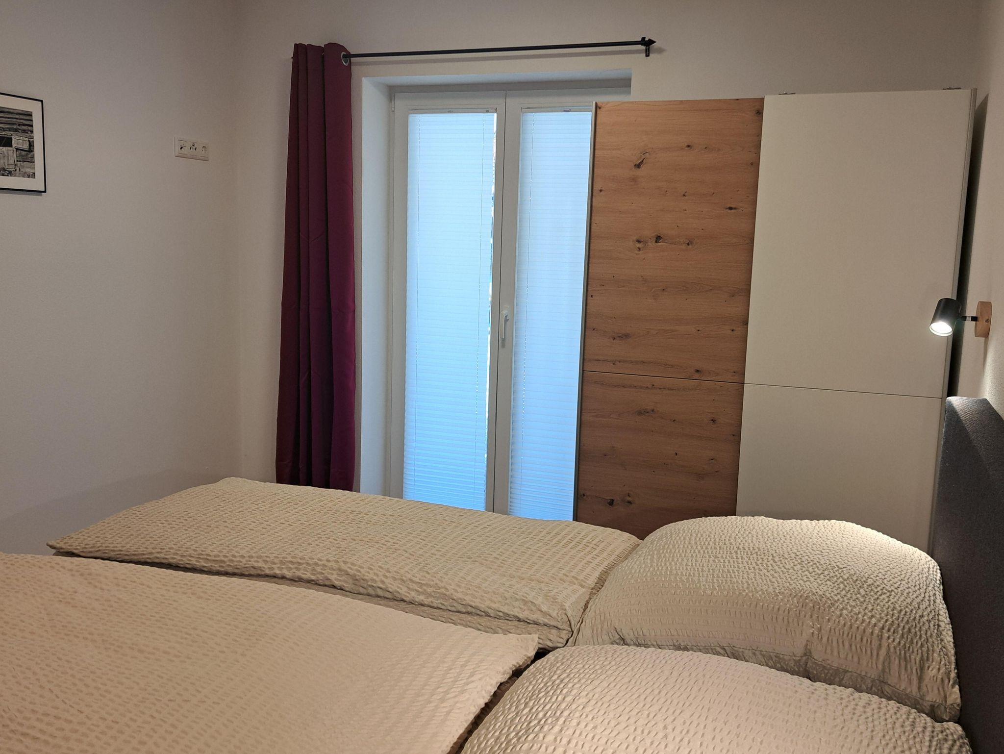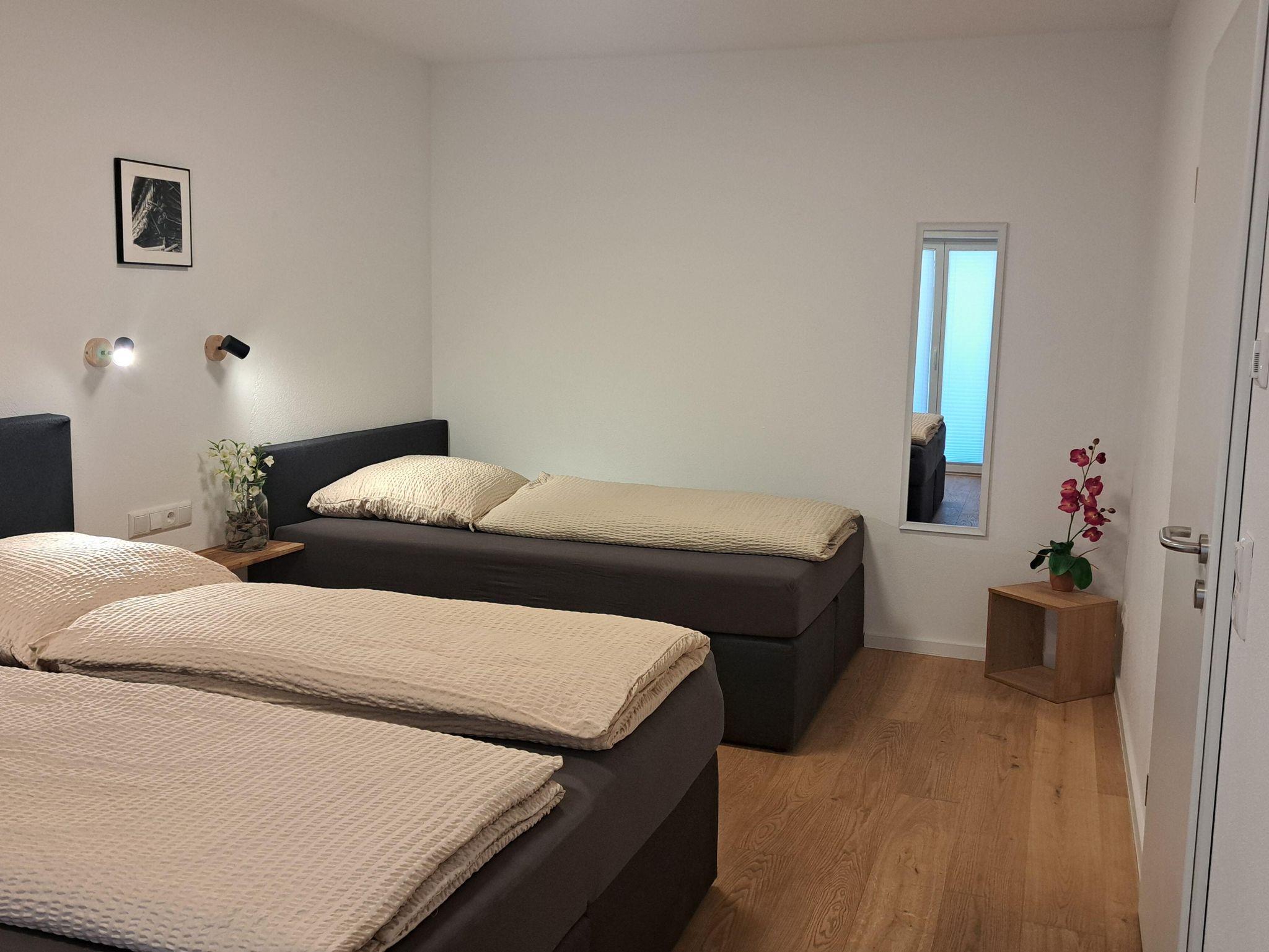 Neben einem Schlafzimmer mit zwei gemütlichen Boxspringbetten (180 cm bzw. 140 cm breit) und einer gemütlichen Wohnecke bietet die Wohnung eine voll ausgestattete Küche mit Backofen, Spülmaschine, Kaffeekapselmaschine etc. sowie ein modernes Bad mit Dusche, WC, Handtuchheizkörper, Kosmetikspiegel und Föhn.
