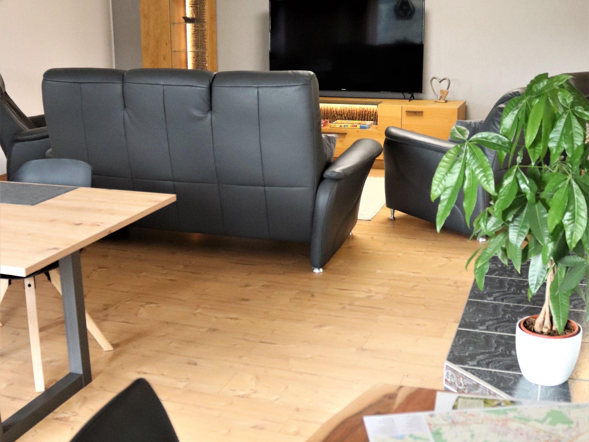 Das geräumige Wohnzimmer bietet einen Fernsehbereich mit Couch und Sessel. Ebenso gibt es einen Essbereich, einen Schreibtisch und einen Spielbereich für Kinder.