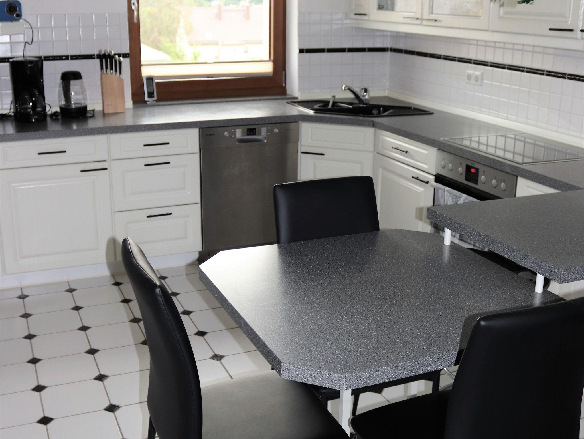 In der großzügigen Einbauküche befindet sich ein Essbereich und sie ist mit allem notwendigem ausgestattet.
