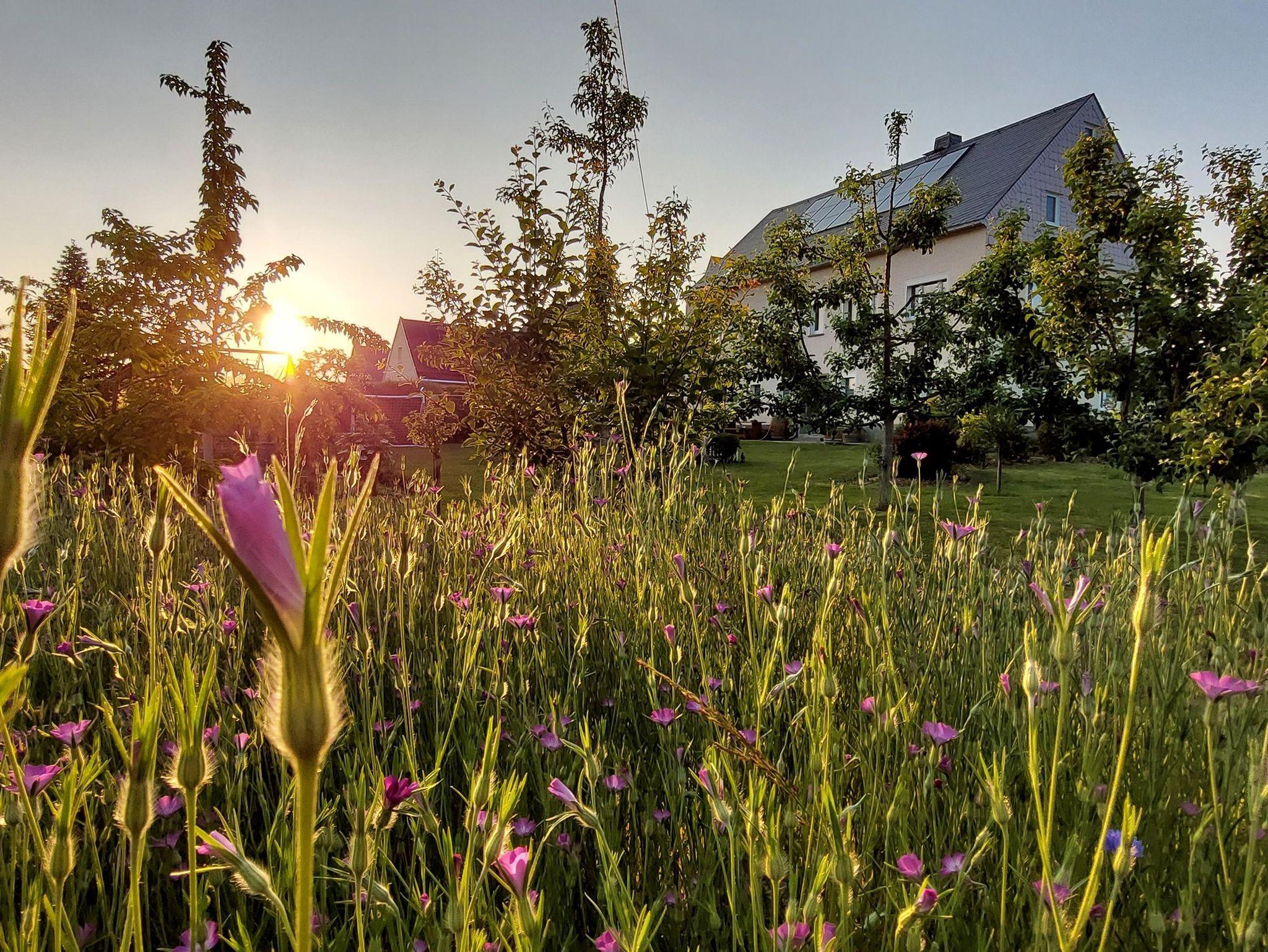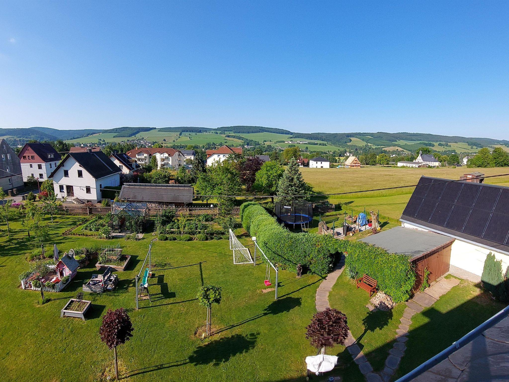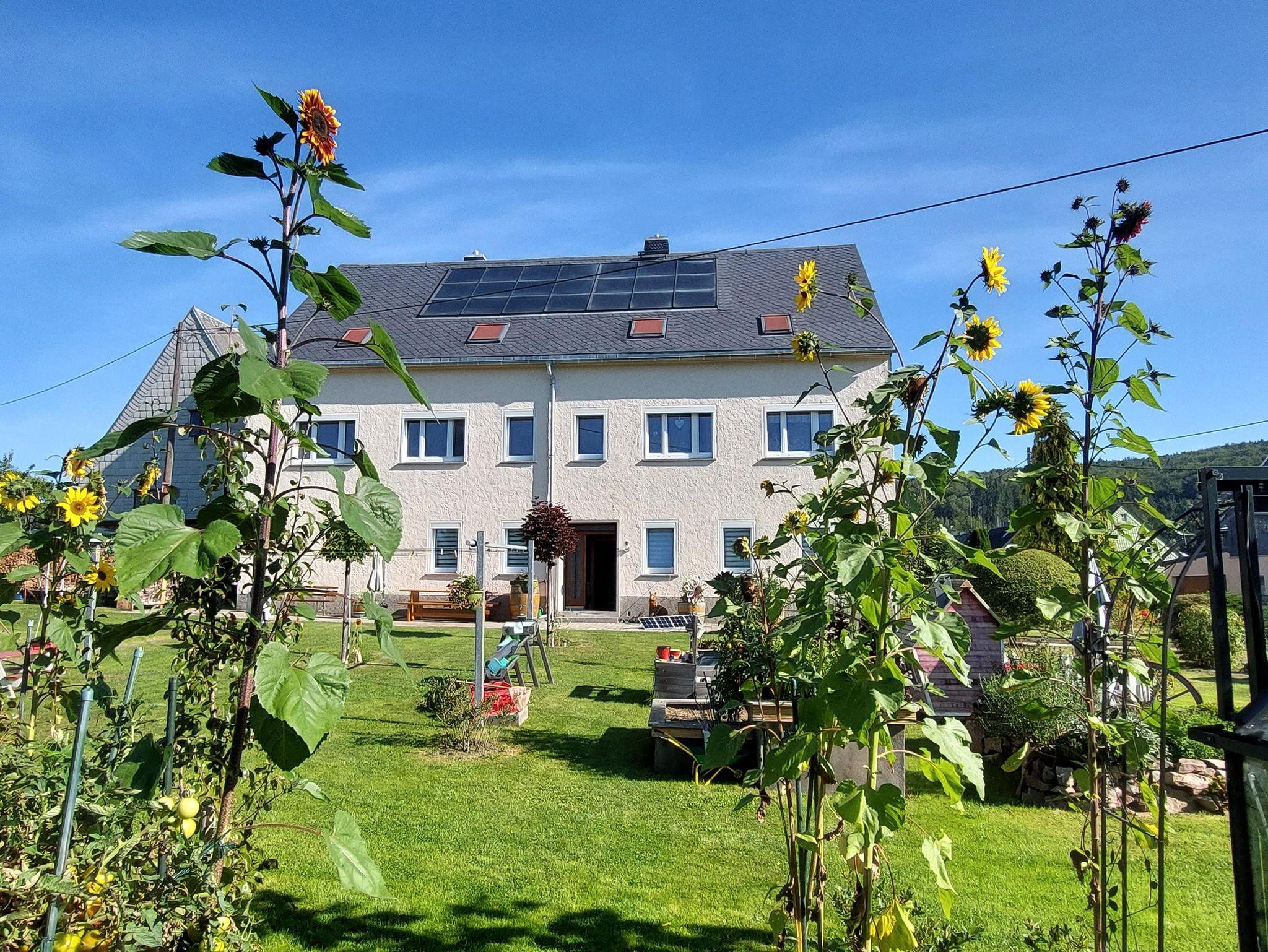 Herzlich Willkommen in unserer großzügigen und komfortablen Ferienwohnung. Sie ist der perfekte Rückzugsort für Ihren erholsamen Urlaub. Es bietet sich ein herrlicher Blick auf die umliegende Landschaft und Natur. Erkunden Sie von diesem idealen Ausgangspunkt die Schönheit des Erzgebirges. Für Ihren nachhaltigen Aufenthalt bei uns legen wir besonderen Wert auf umweltfreundliche Energiequellen und klimaneutrale Maßnahmen. Unsere Ferienwohnung wird durch eine eigene Photovoltaikanlage mit sauberem Strom versorgt. Zusätzlich nutzen wir Solarthermie zur umweltfreundlichen Wärmeerzeugung. Der große Garten vor dem Haus lädt zur Erholung ein und verfügt über einen Sitzbereich mit Grillmöglichkeit. Für unsere kleinen Gäste gibt es ausreichend Spielmöglichkeiten sowie viel Platz auf der grünen Wiese. Im Garten wachsen saisonales Obst, Gemüse und Küchenkräuter.