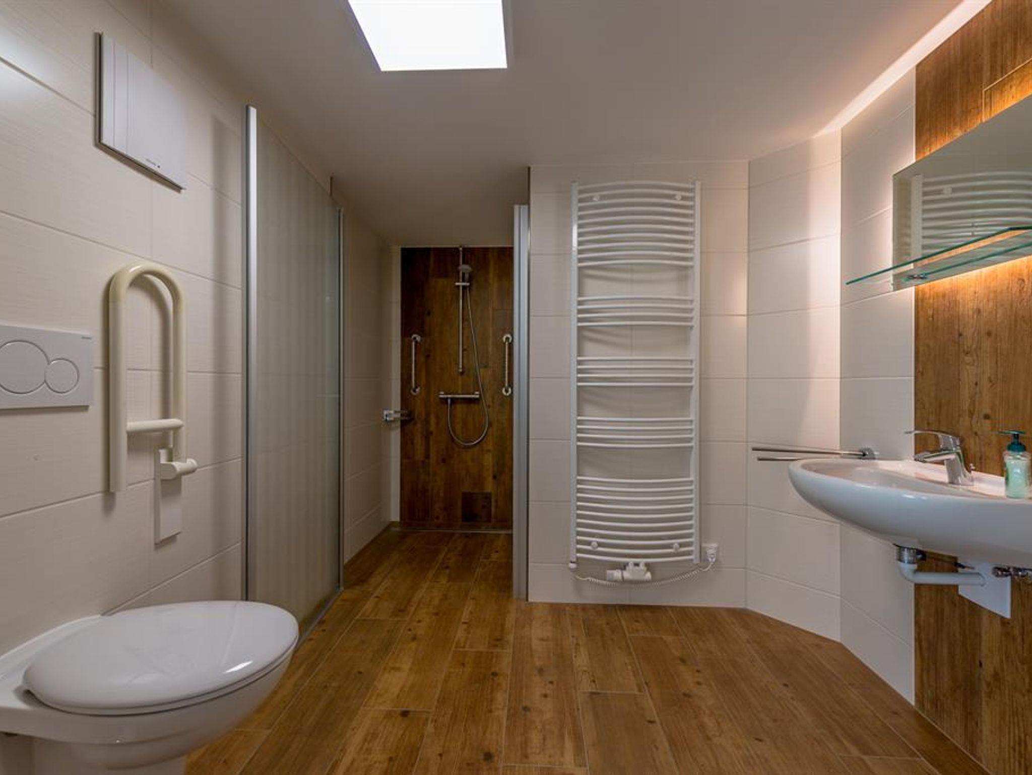 • rollstuhlgerecht, Boden eben, keine Stufen, Haltegriffe an Toilette und Dusche
