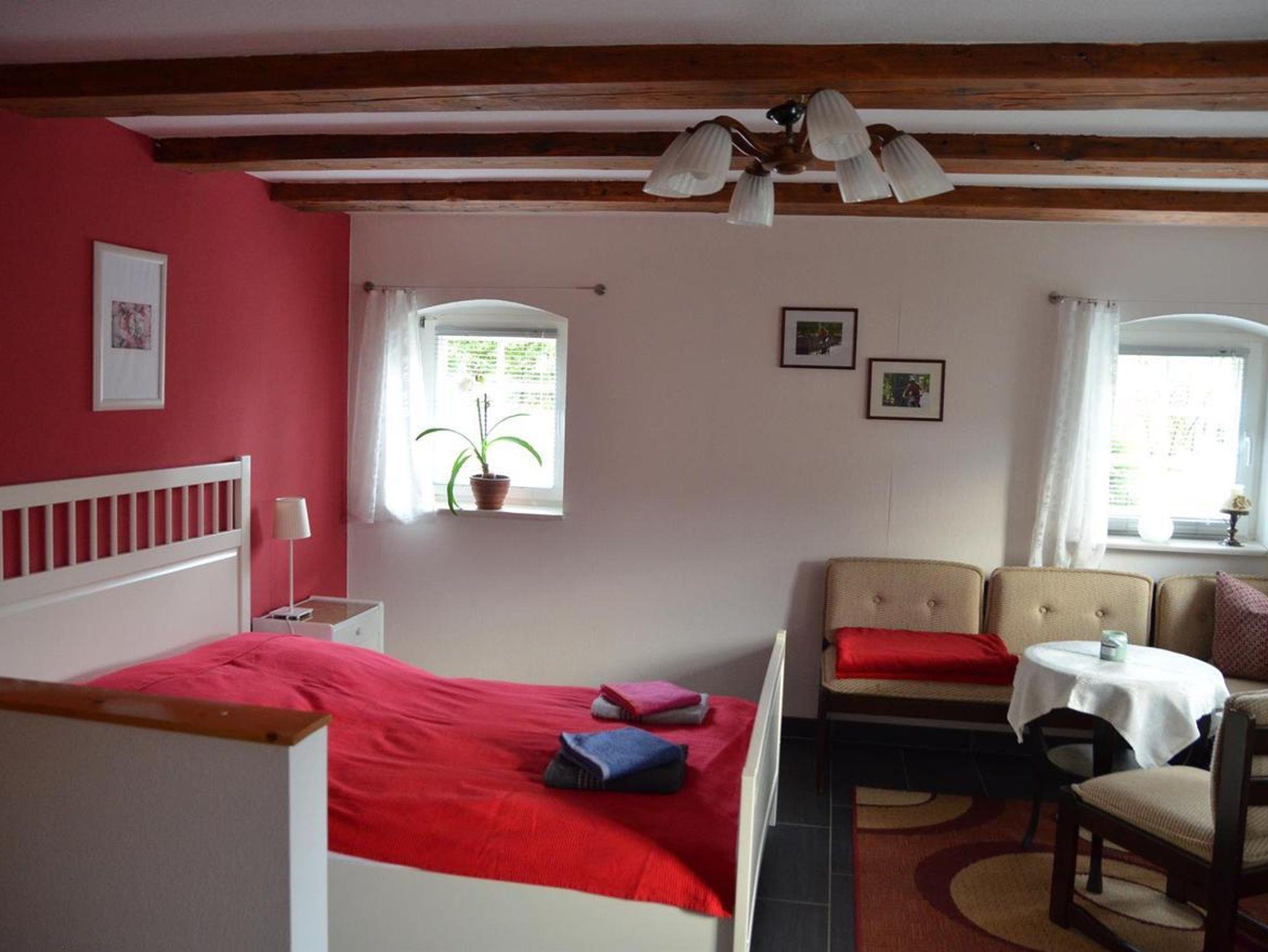 Unser Haus befindet sich in ruhiger Lage. Die Ferienwohnung ist über einen separaten Eingang im Haupthaus zu erreichen und befindet sich im Erdgeschoss. Sie ist renoviert, neu eingerichtet und verfügt über einen kombinierten Wohn-/ Schlafraum mit Doppelbett (160x200 cm), Schrank, Sitzecke, TV und Radio sowie einer separaten Küche mit Essecke. Eine Unterstellmöglichkeit für Fahrräder besteht im großzügigen Eingangsbereich. Für Ihren PKW steht ein Stellpatz zur Verfügung (abschließbar). Ein Haustier mittlerer Größe ist erlaubt.