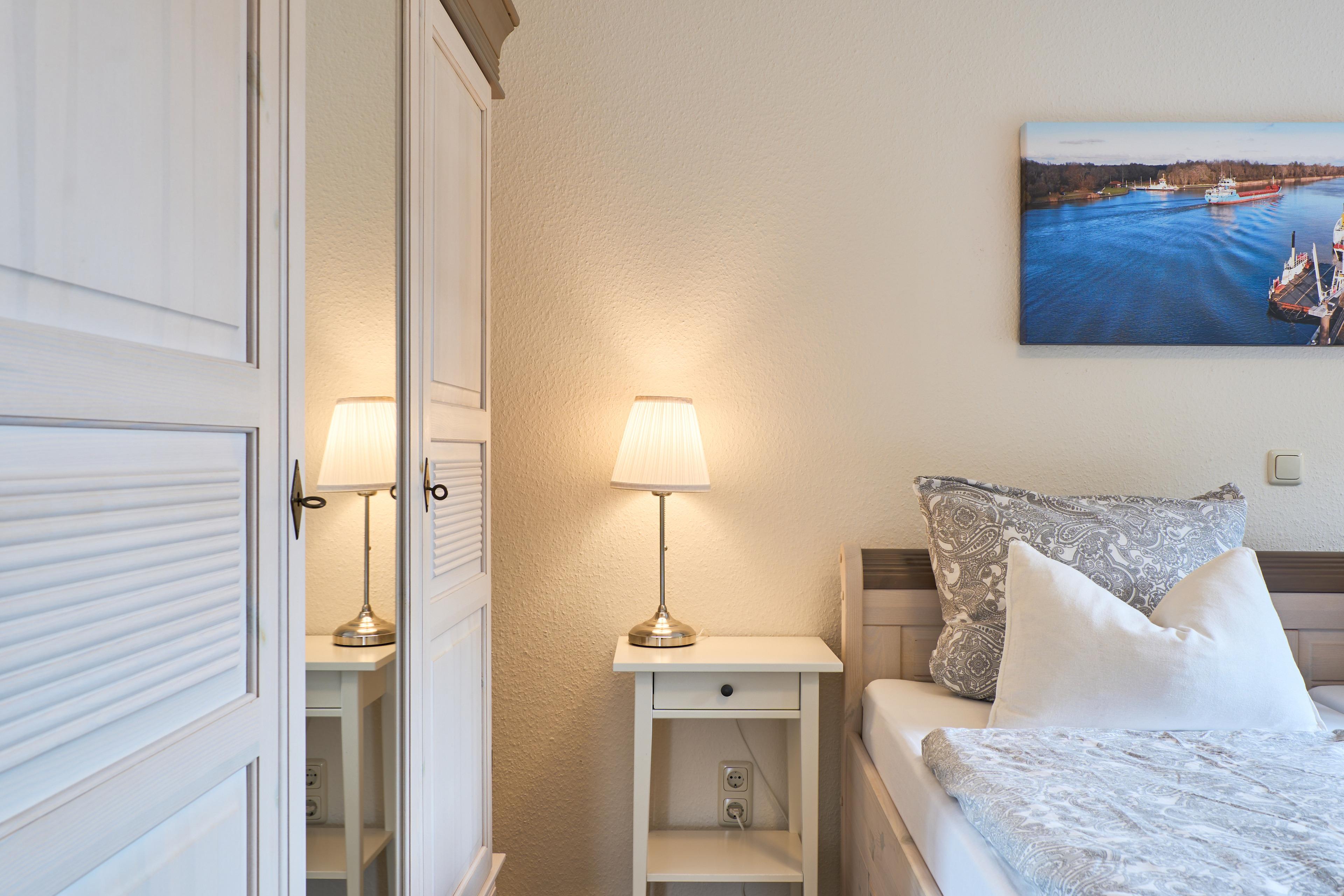 Die Ferienwohnung Schiffsdeck im Erdgeschoss ist hochwertig und geschmackvoll im hellen, modernen Landhausstil eingerichtet. In der lichtdurchfluteten Wohnung finden Sie viel Platz und Komfort für Ihren Traumurlaub. Der großzügige Schnitt der Wohnung lädt zum Erleben ein, ob gemeinsam oder lieber alleine, hier genießen Sie viel Freiraum, aber auch individuelle Rückzugsorte. Auf der großen Sonnenterrasse, die direkt vom Wohn- und Essbereich begehbar ist, finden Sie hochwertige Gartenmöbeln, einen Weber Gasgrill und natürlich einen Sonnenschirm. Der Garten mit viel Rasenfläche ist ideal für Familien mit Kindern. Die Wohnung ist bedingt barrierefrei, auf Wunsch steht Ihnen ein mobile Rollstuhlrampe zur Verfügung. Von der Nebeneingangstür zusätzlich zum Haupteingang könne Sie die Wohnung direkt vom Carport aus betreten. Zwei geräumige Schlafzimmer (Doppelbett 180x200) mit TV laden hier nach einem tollen Urlaubstag zum Träumen ein. Die Schlafzimmer haben zusätzlich zu den Plissees elektrische Aussenrollläden, damit Sie auch im Sommer nicht auf einen erholsamen Schlaf verzichten müssen. Der Wohn- und Essbereich bietet mit seinen bodentiefen Fenstern einen herrlichen Blick auf den NOK. Träumen Sie beim Kochen in der hochwertig ausgestatteten Küche von großen Pötten und der weiten Welt oder genießen Sie von der großen Wohnlandschaft das ständige pendeln der Fähre. Die Wohnung ist komplett ausgestattet, neben dem 55 Zoll TV mit DVD Player und Sonoro Soundsystem, im Wohnbereich, finden Sie eine feine Auswahl an Lektüren und Spielen. Unsere kleinen Gäste liegen uns sehr am Herzen, für sie stellen wir Ihnen gerne unsere Kleinkindausstattung zur Verfügung. Genießen Sie entspannte Sonnentage in der sehr gepflegten Gartenanlage mit viel Platz zum relaxen, Kraft tanken, entspannen oder toben und spielen. Staunen Sie über die vorbeiziehenden Schiffe oder beobachten Sie das rege Treiben der NOK- Fähre.