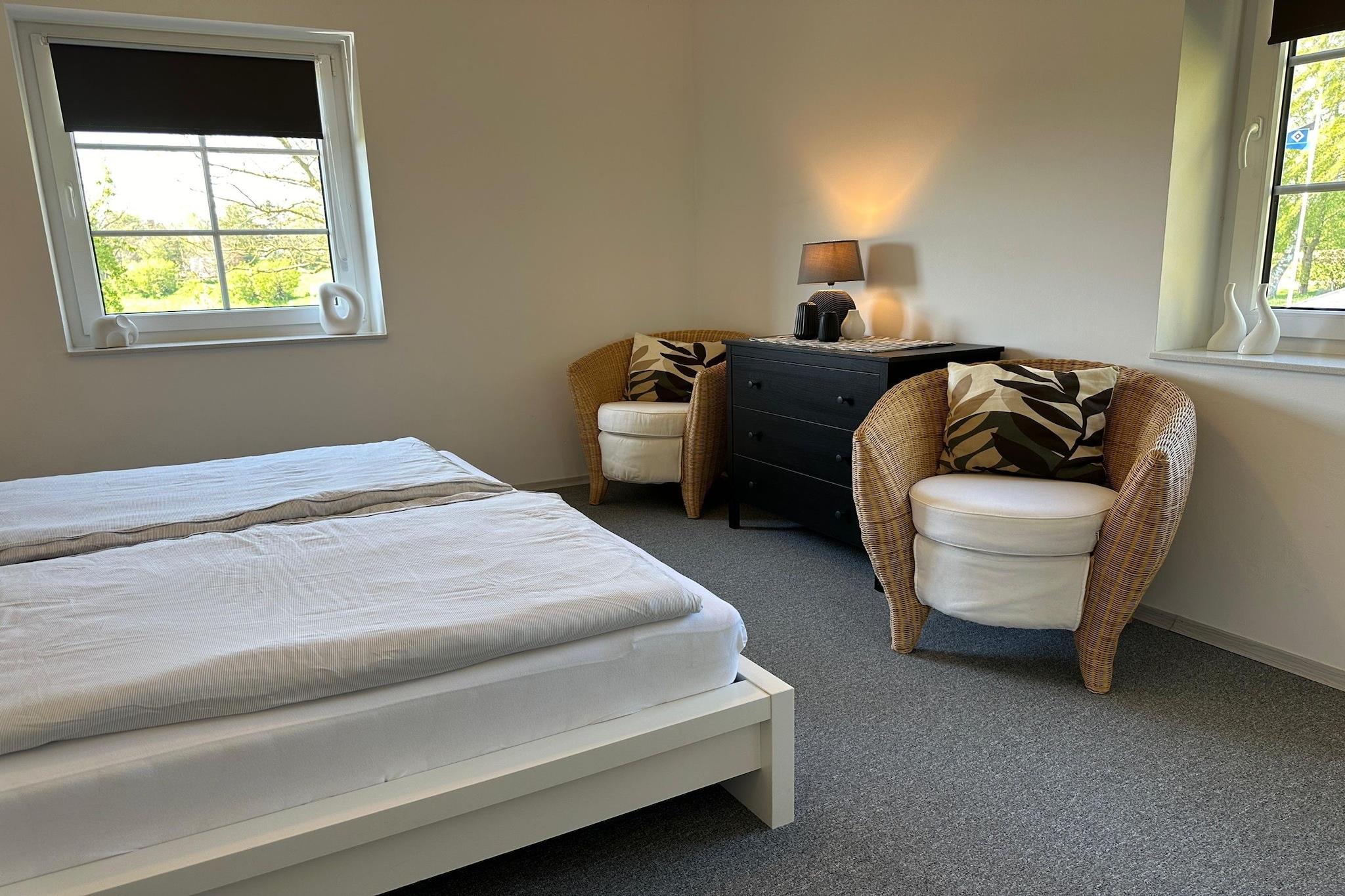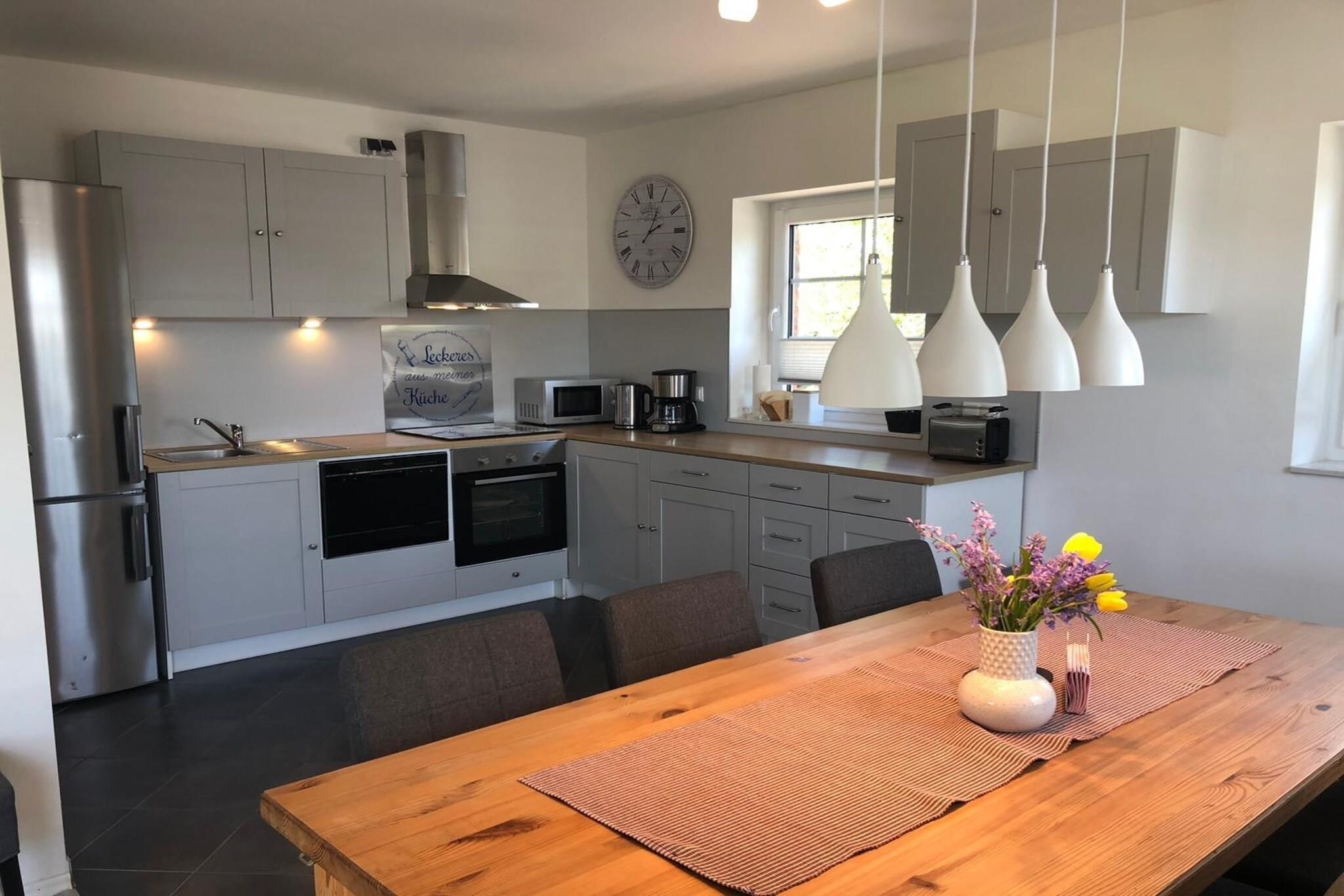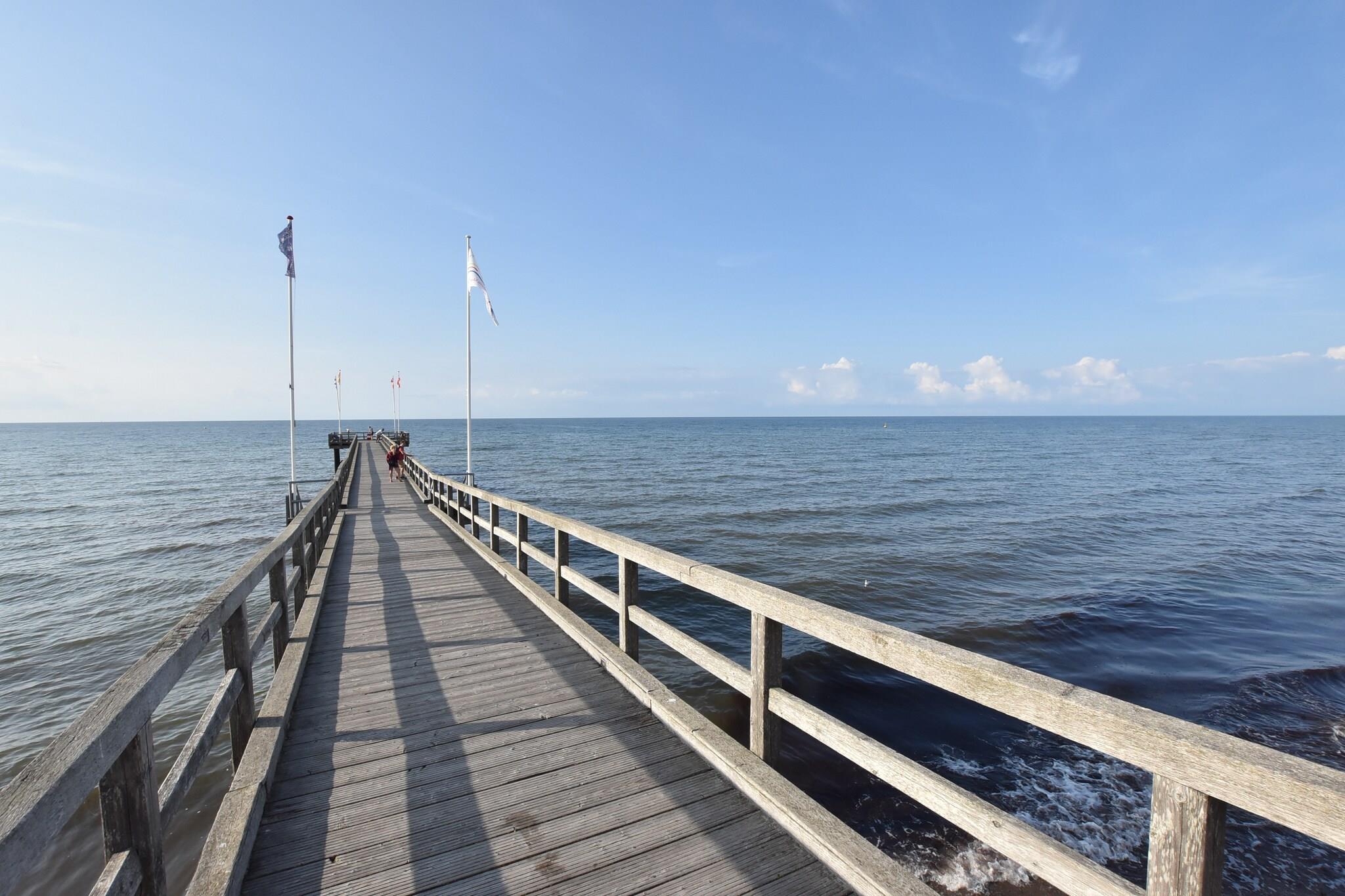 Denne lyse lejlighed på første sal i Dannau ligger kun 3 km fra havet og sandstranden og tilbyder et veludstyret oase for familier eller grupper. Det åbne køkken har en keramisk kogeplade, ovn, mikroovn, opvaskemaskine og køleskab med fryser, mens stuen/spisestuen har stereoanlæg, festspil og en balkon til afslappede aftener. Sovearrangementer inkluderer en king-size seng, to enkeltsenge og en køjeseng - ideel til både voksne og børn. Badeværelset er udstyret med bruser, toilet og hårtørrer, og tankevækkende ekstraudstyr som varme, barneseng, høj stol, barneseng (gratis) og betalt vaskemaskine gør længere ophold behageligt. Udendørs kan du nyde terrassen, haven med liggestole, grill og betalt cykeludlejning for at udforske de naturskønne omgivelser. Parkering og carport er også tilgængelige. Med restauranter kun 1 km væk og almindelige forsyninger inden for 3 km, blander denne beliggenhed landskabsro med kystnære bekvemmeligheder