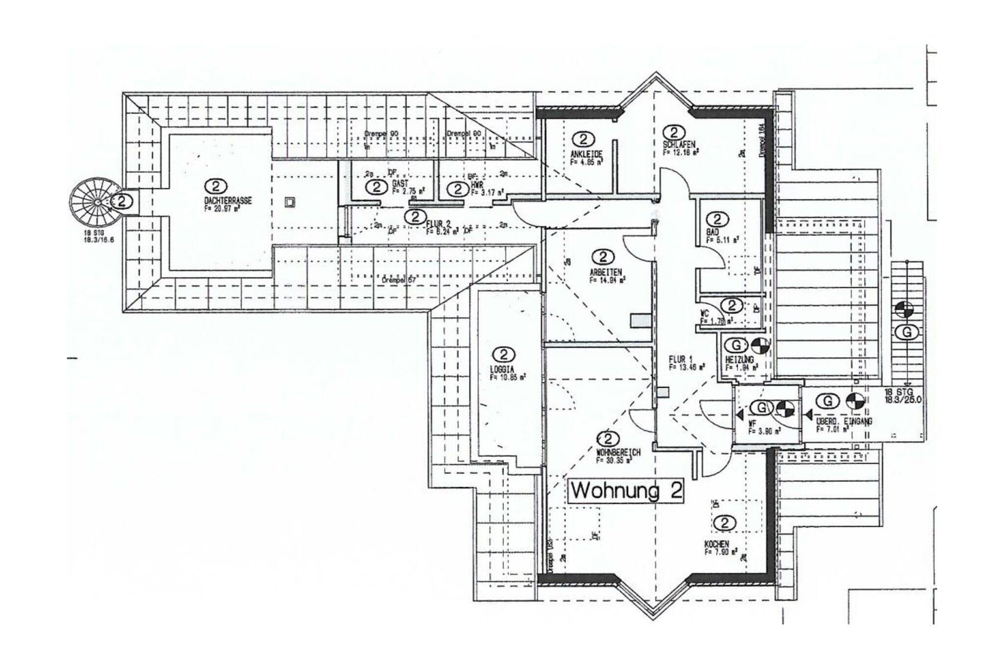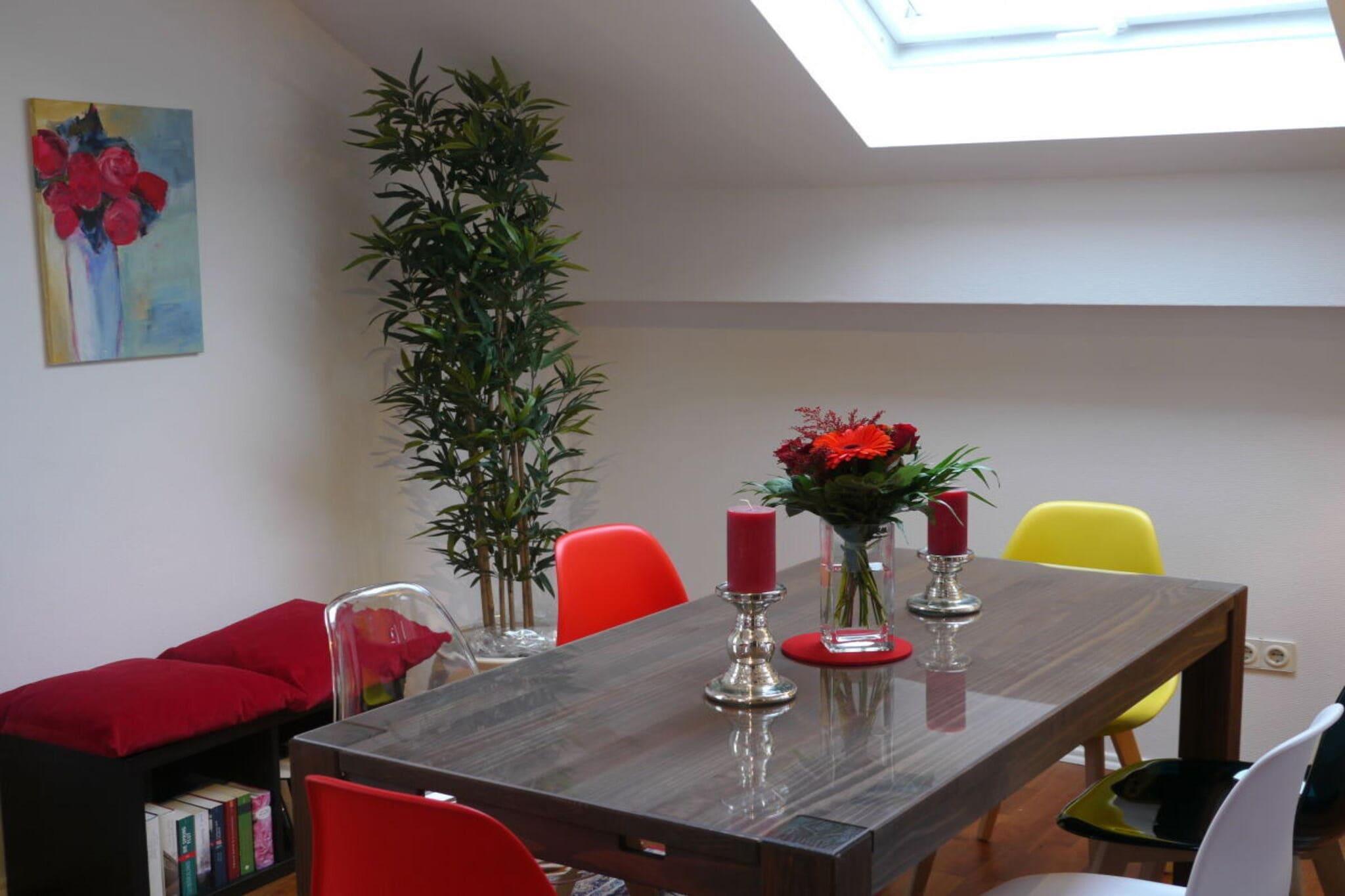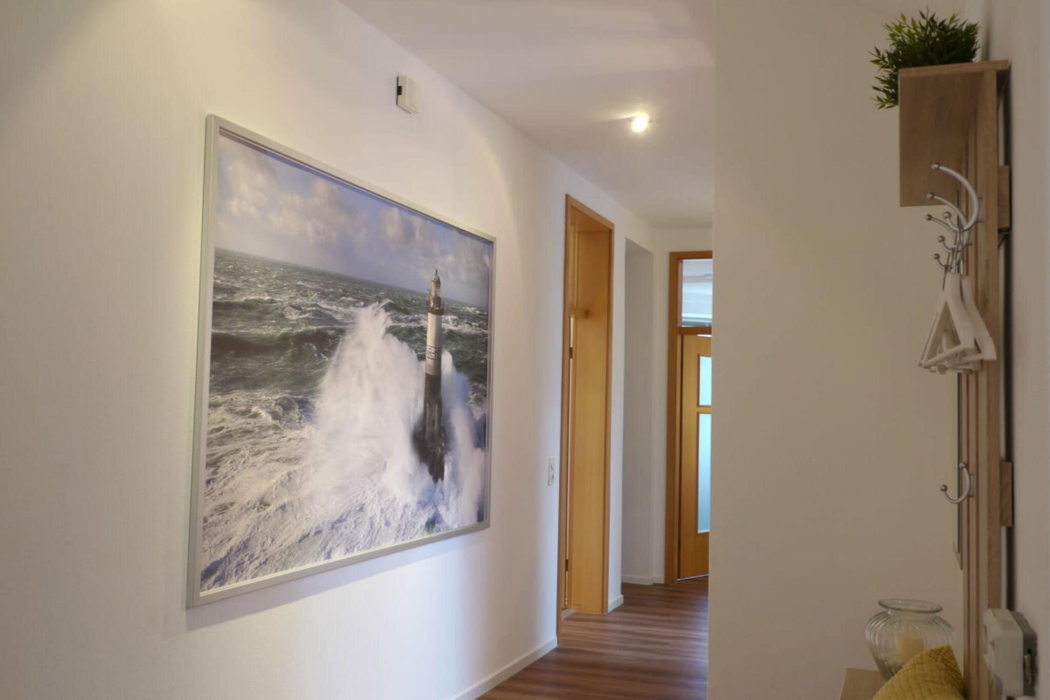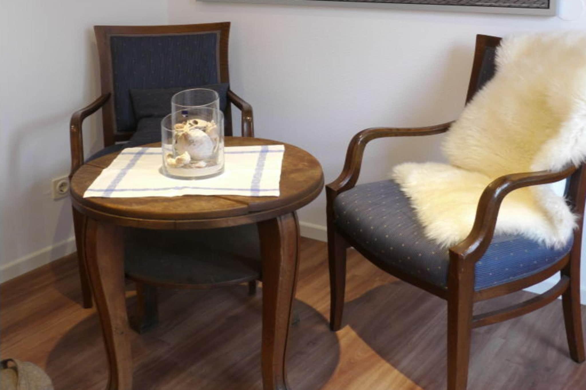 The holiday apartment is approximately 120m² in size, is located on the first floor, and consists of a living/dining room with an open-plan kitchen, two bedrooms, a bathroom, a separate toilet, a hallway with a reading and play area, a utility room, and a small living room. It is accessible via a separate entrance and features a loggia and roof terrace. With its numerous large windows, the apartment is very spacious and bright. For the colder seasons, the apartment has a fireplace in the living area.