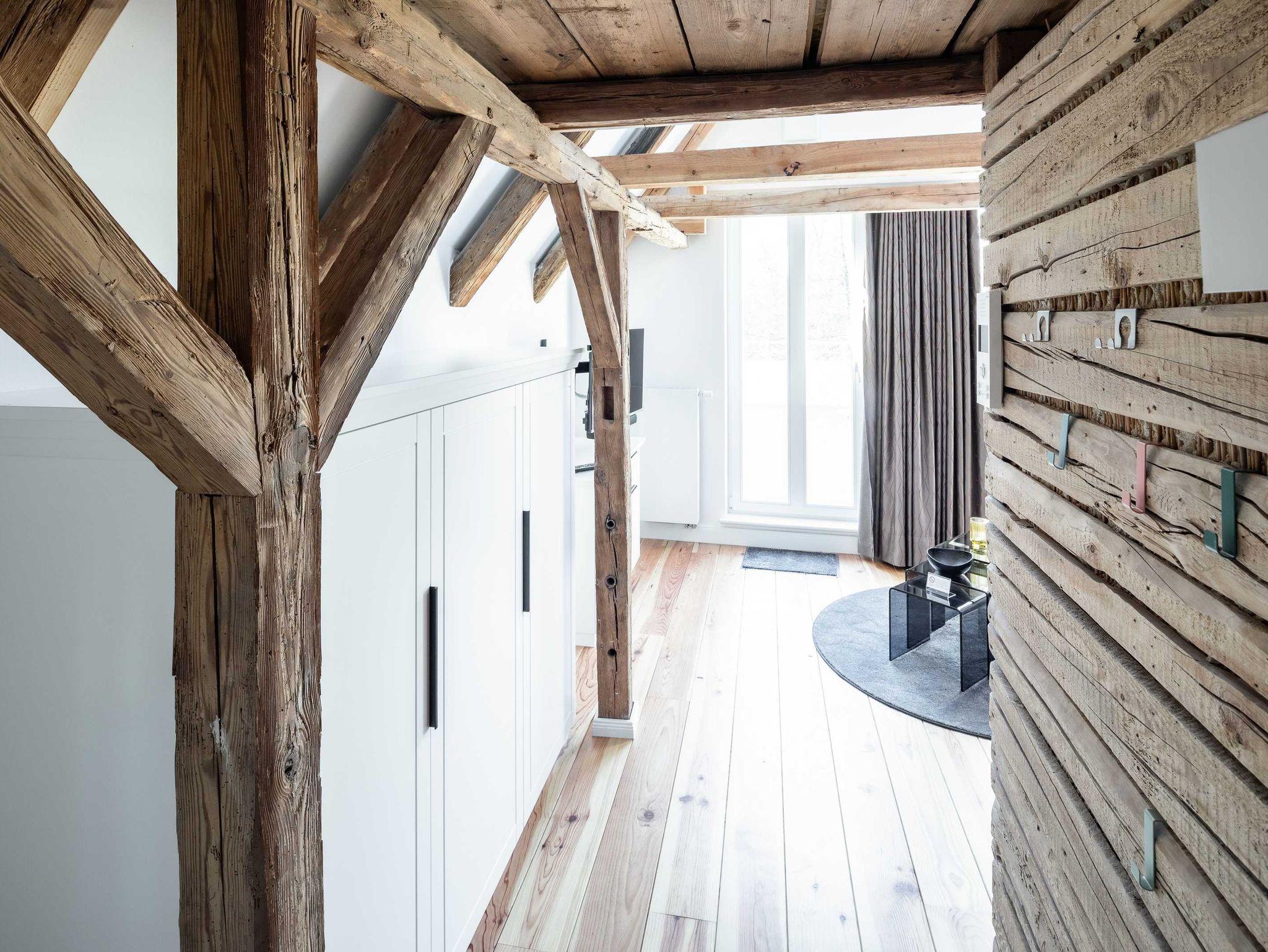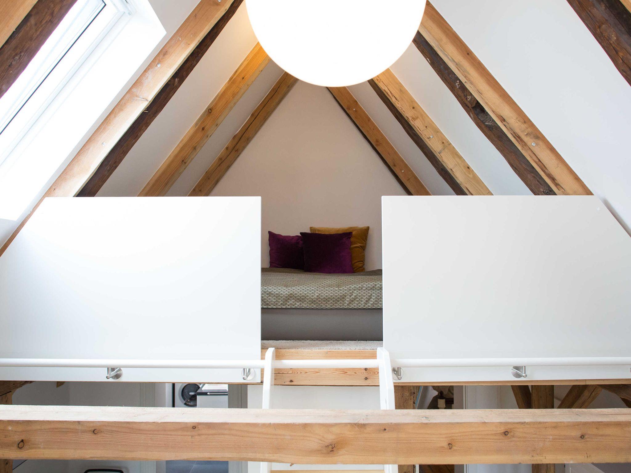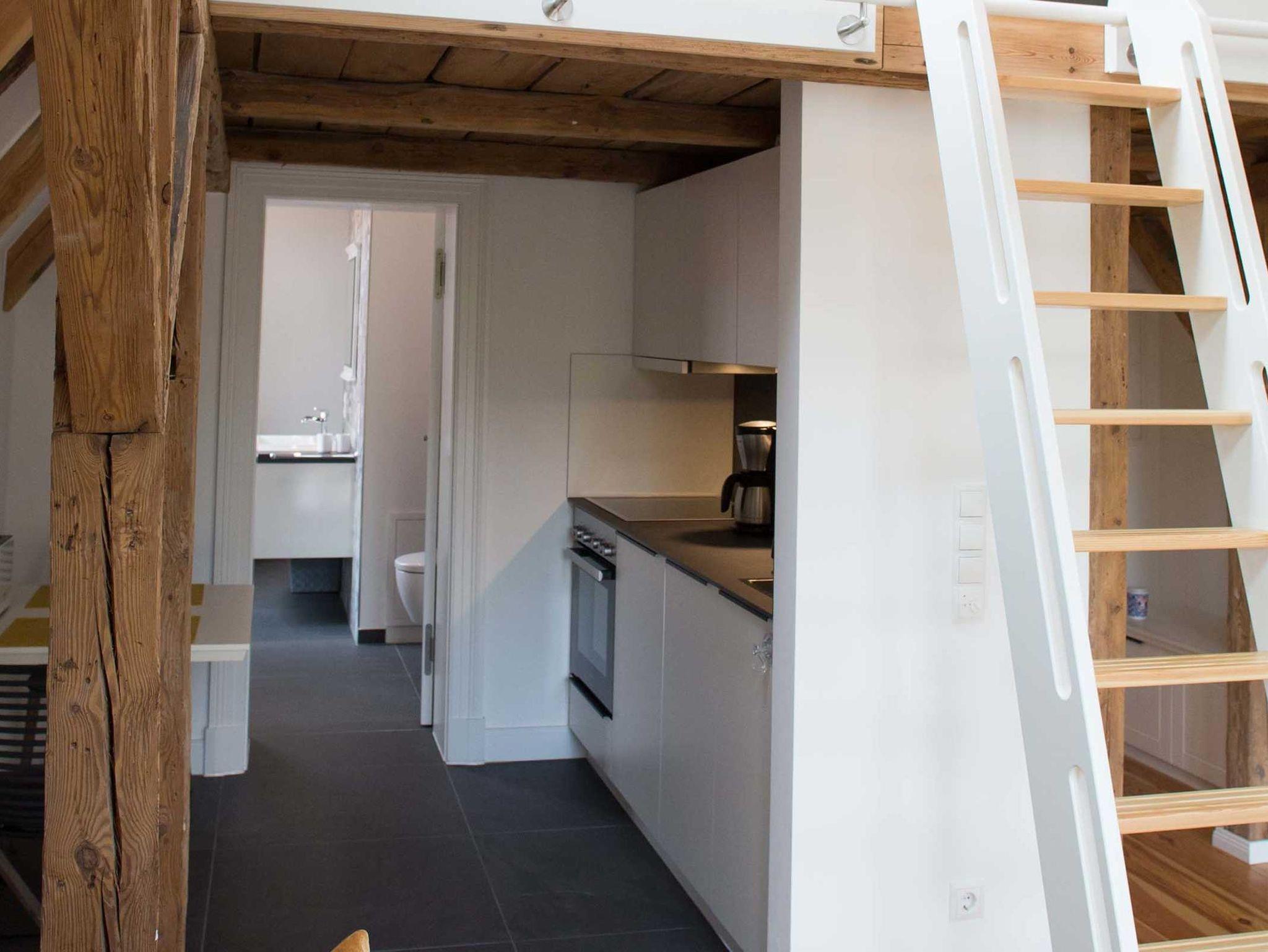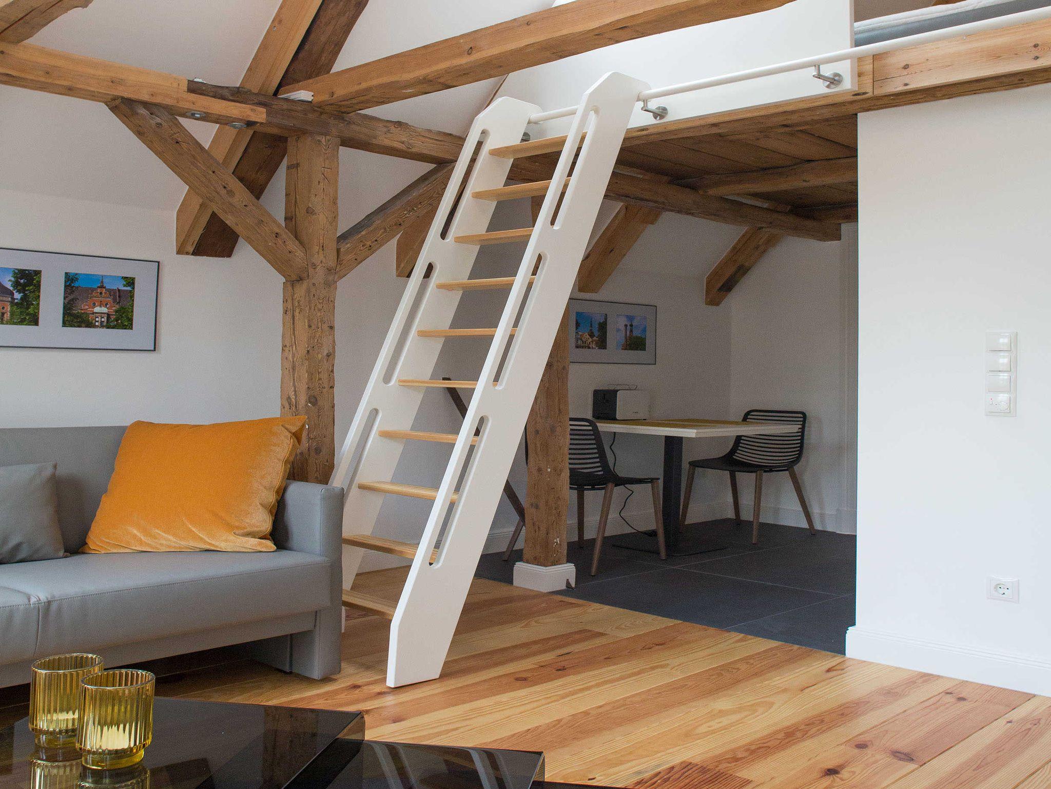 Das stilvoll eingerichtete Apartment 1 liegt im 2. OG des Objektes mit Blick in den Garten. Die Wohnung ist über die Treppe und einen Aufzug erreichbar. Sie verfügt über ein Schlafzimmer, welches Sie über eine Leiter hin zur oberen Etage über dem Wohnbereich erreichen.(siehe Fotos) Ebenso verfügt die Wohnung über ein Badezimmer und einer offenen Küche mit Wohnzimmerbereich. Das Sofa im Wohnzimmer ist als Schlafsofa nutzbar. Die Wohnung verfügt über einen möblierten Balkon.
