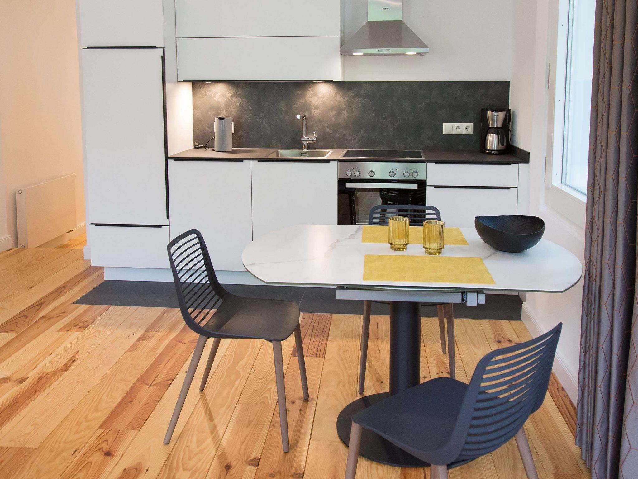 Das stilvoll eingerichtete Apartment 2 Wohnen am Schloßteich liegt im 1. OG des Objektes mit Blick in den Garten. Die Wohnung ist über die Treppe und einen Aufzug erreichbar. Sie verfügt über ein Schlafzimmer, ein Badezimmer und eine offene Küche mit Wohnzimmerbereich. Das Sofa im Wohnzimmer ist als Schlafsofa nutzbar.