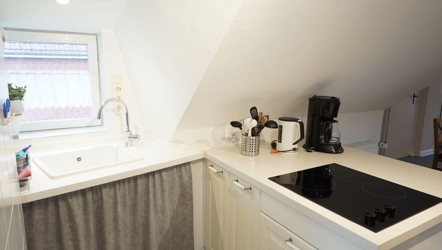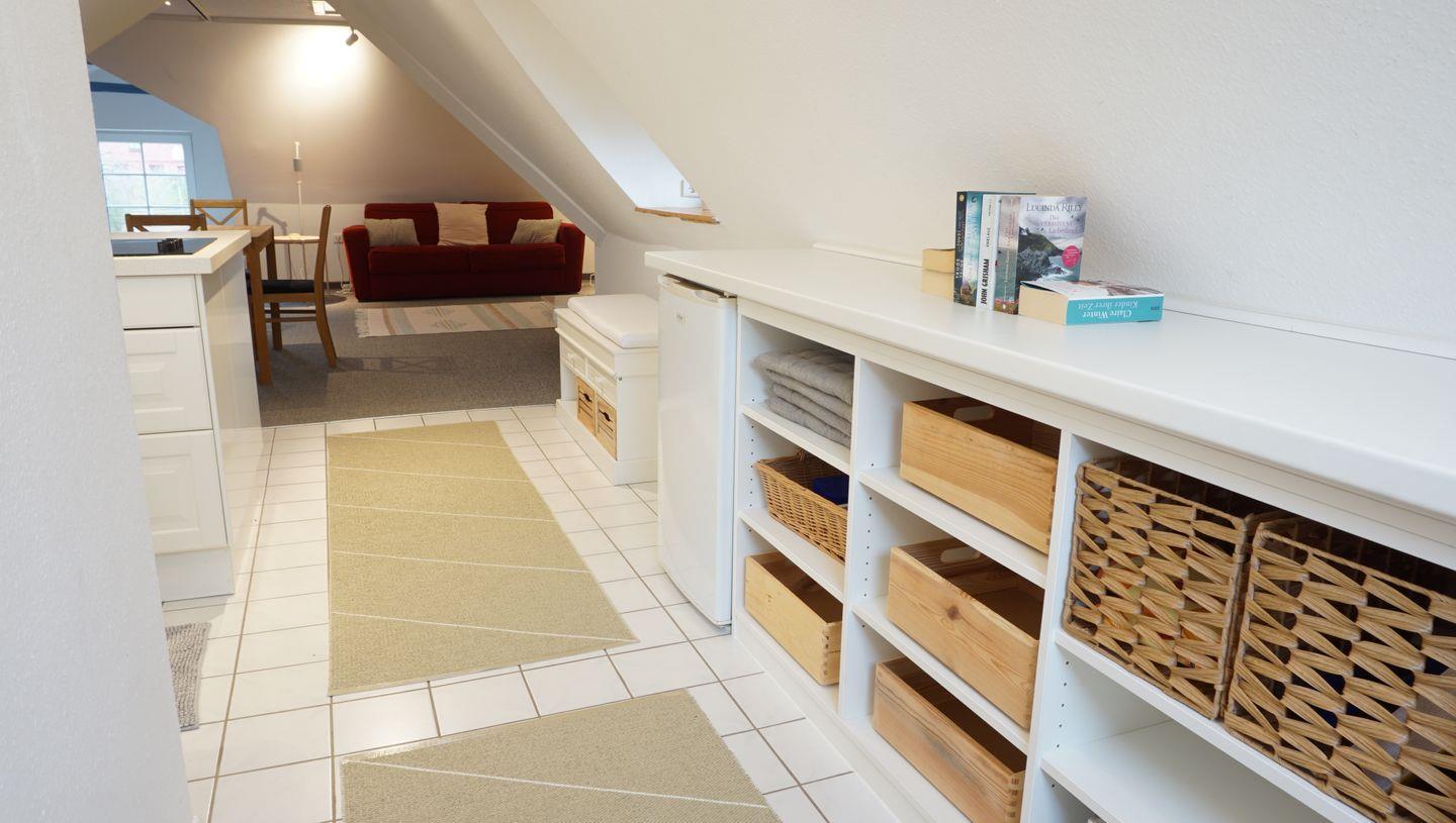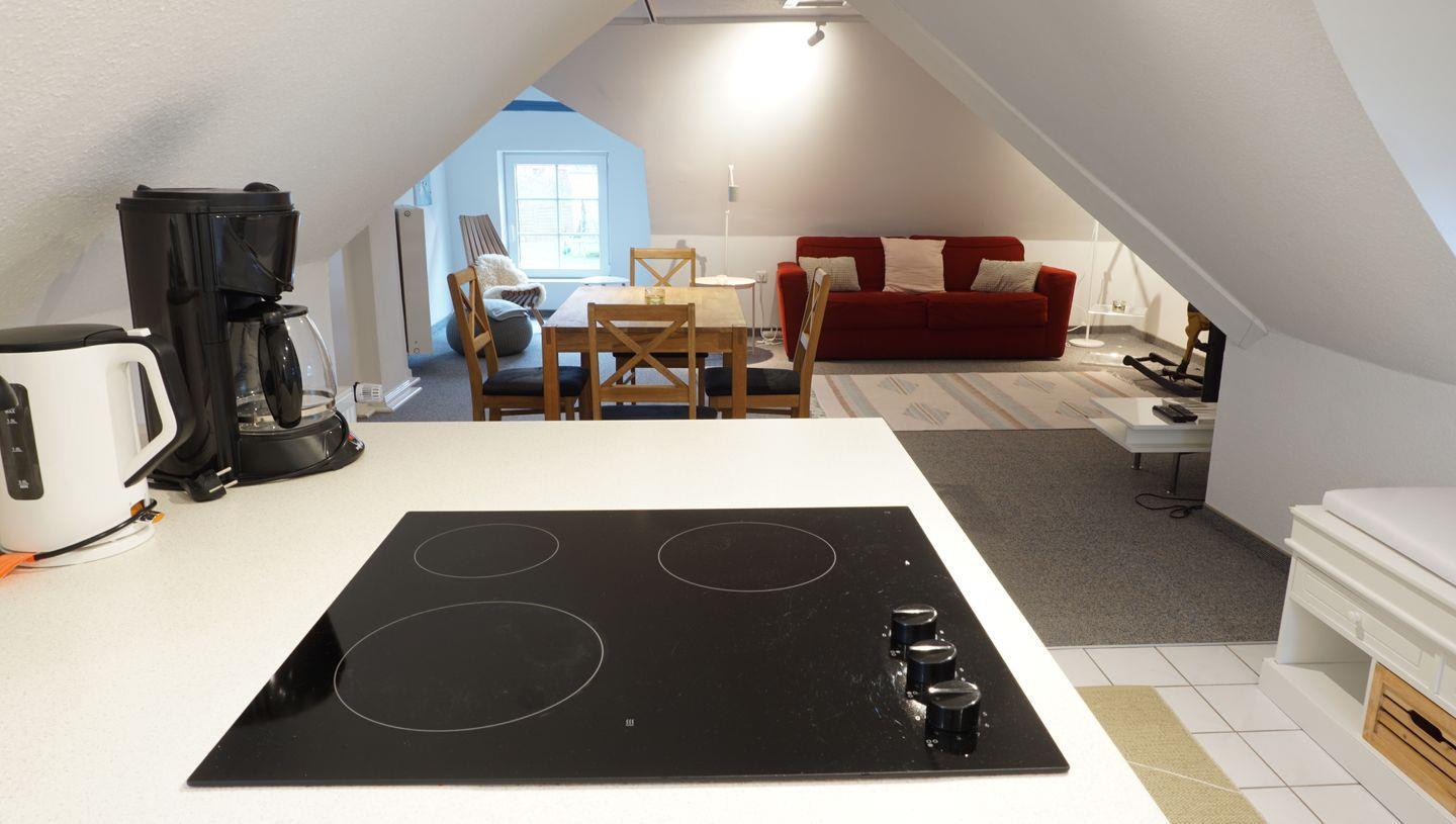 Offener Wohn-Essraum mit Küchenzeile (Kühlschrank, Kaffeemaschine, Wasserkocher, Toaster),