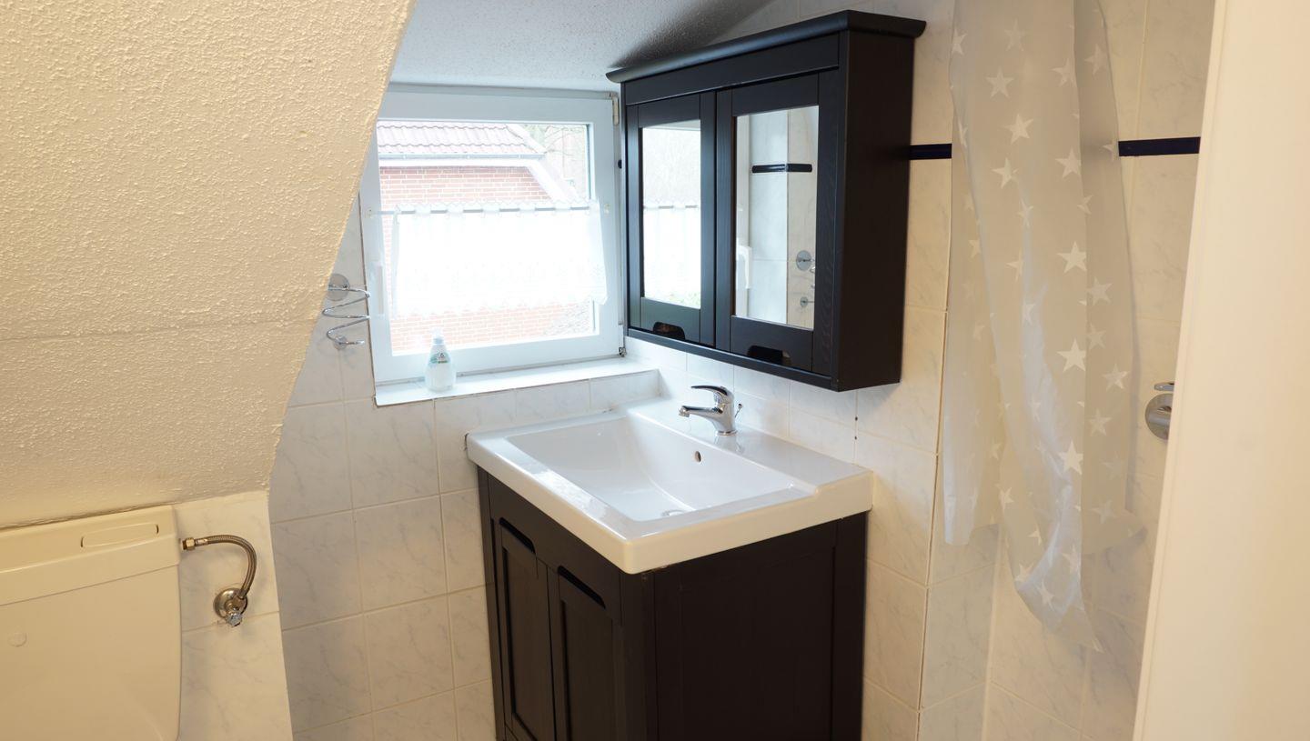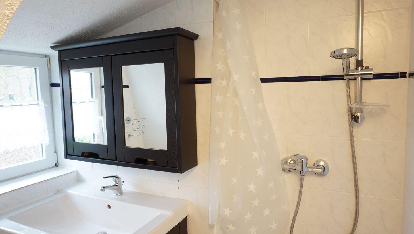 (Dusche hat eine Höhe von ca. 190 cm, Bereich vor dem Waschbecken eng.)