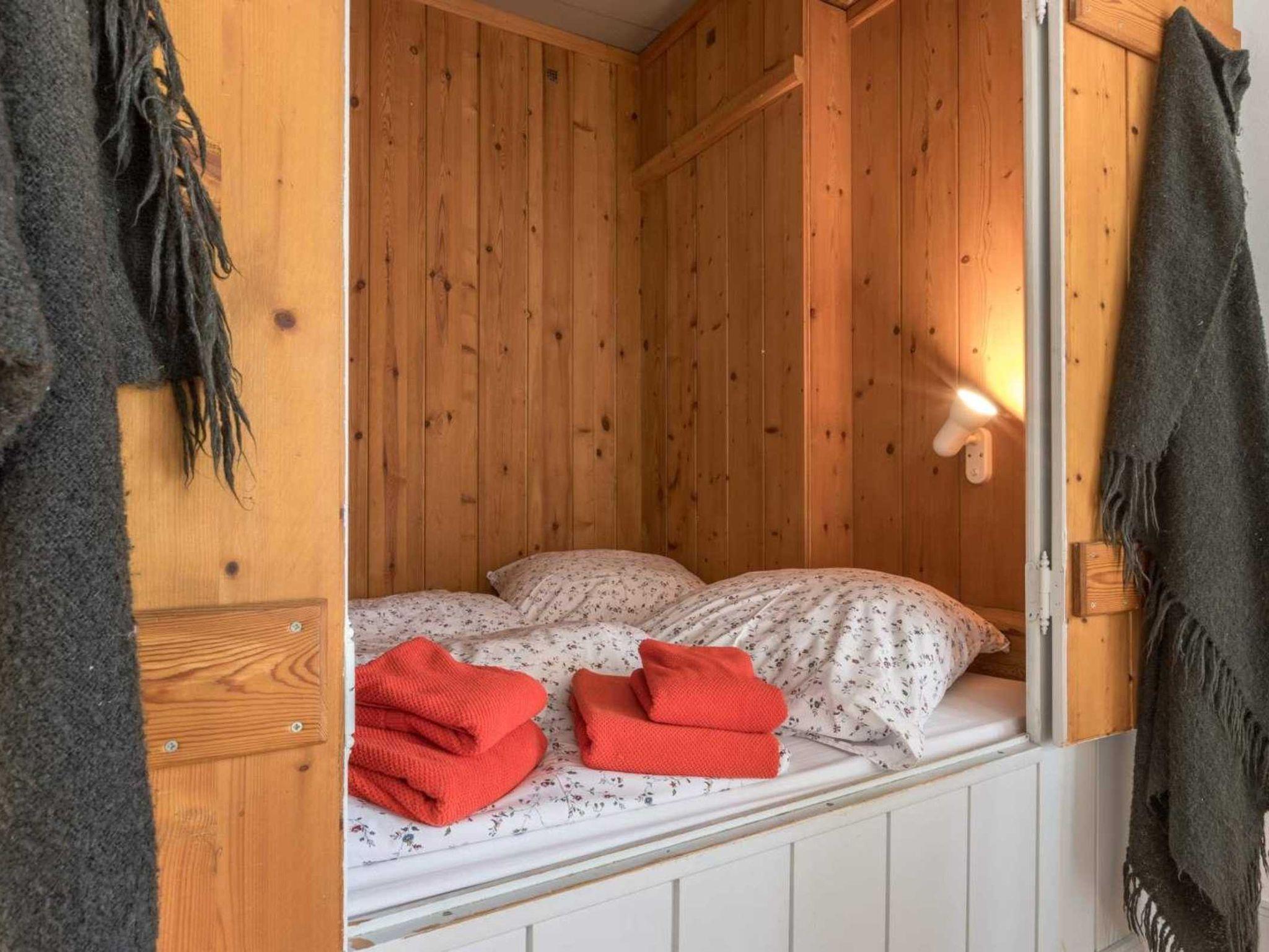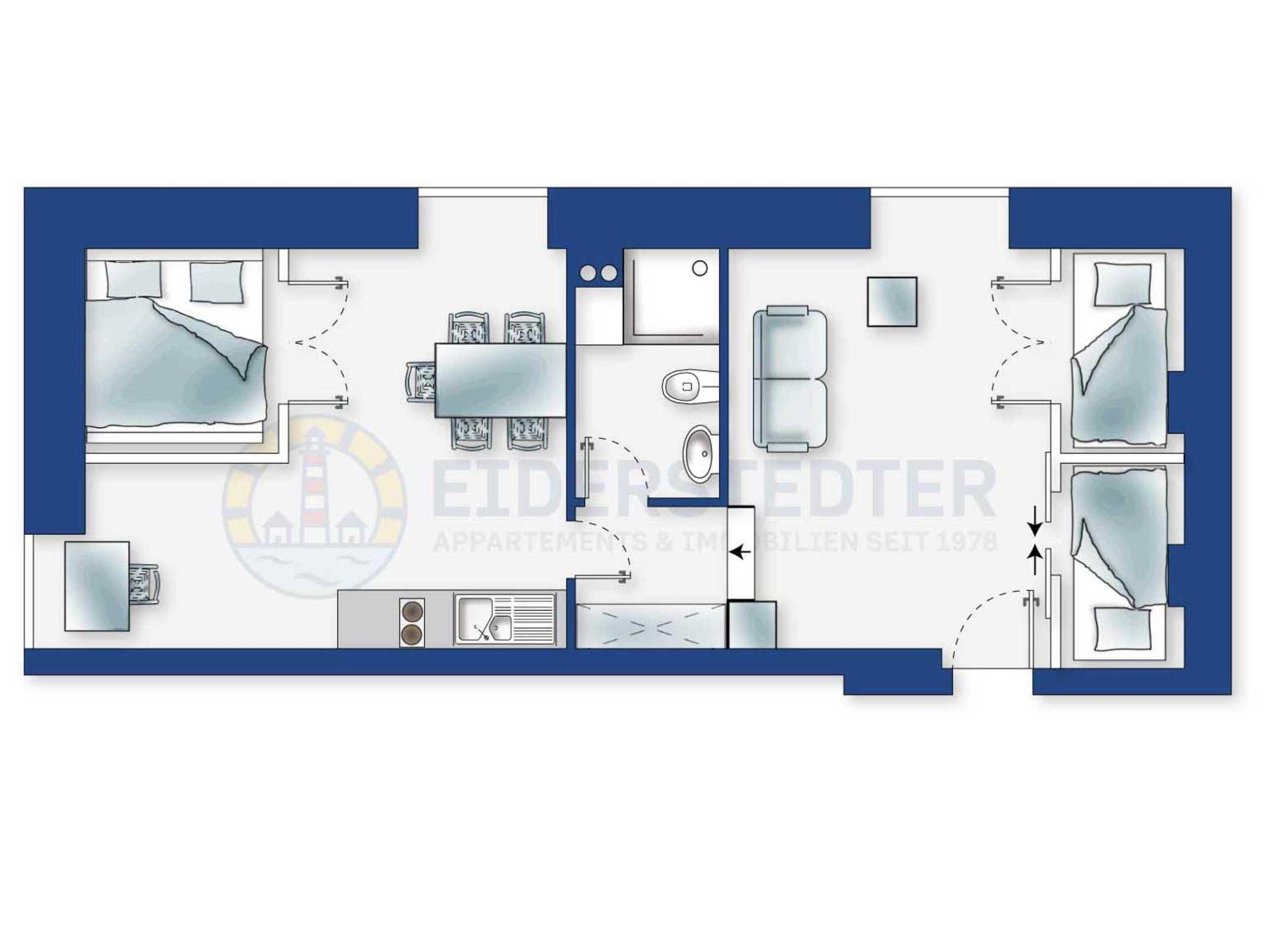 Schlafzimmer mit Alkoven-Doppelbett (2x 80x200cm) und offener Küche mit einem Herd mit Backofen, Kühlschrank mit Gefrierfach sowie einem Essplatz für 4 Personen.