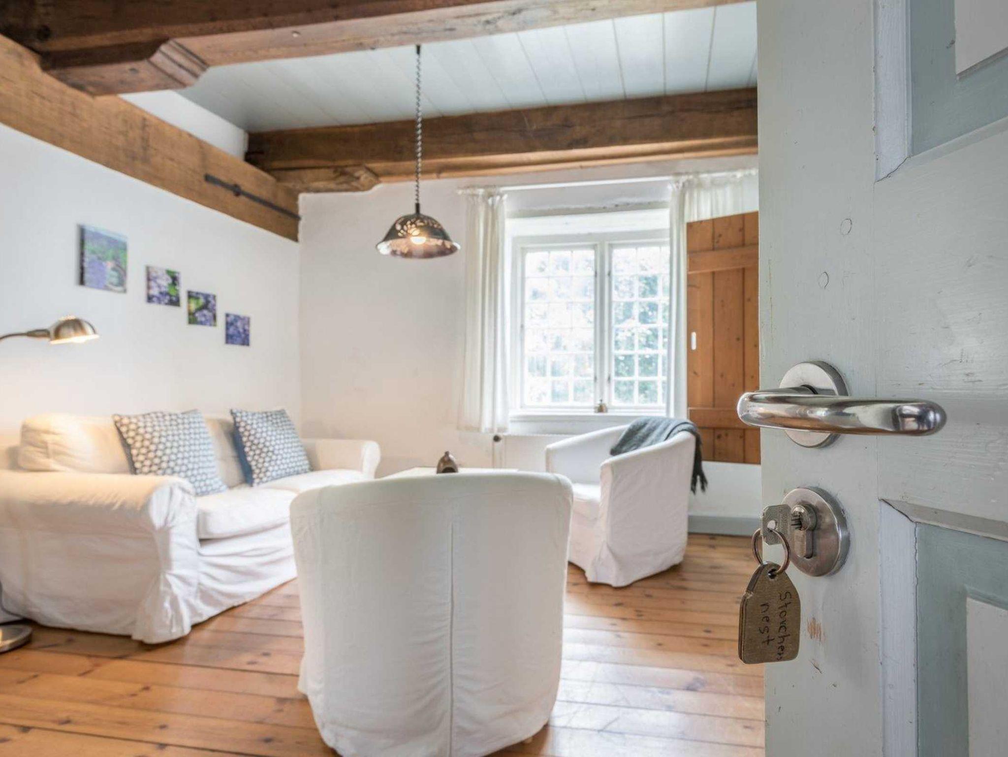 Saunabereich gegen Gebühr vorhanden. Die Schloss-Gäste können die Terrasse sowie den Garten mit Gartenmöbeln, Grillmöglichkeit und Liegewiese mitnutzen. In der ehemaligen Gesindeküche des Westflügels befindet sich heute eine urgemütliche Sitzecke für gesellige Momente. Kinderhochstuhl und Kinderreisebett kostenlos vorhanden (nach Verfügbarkeit).
