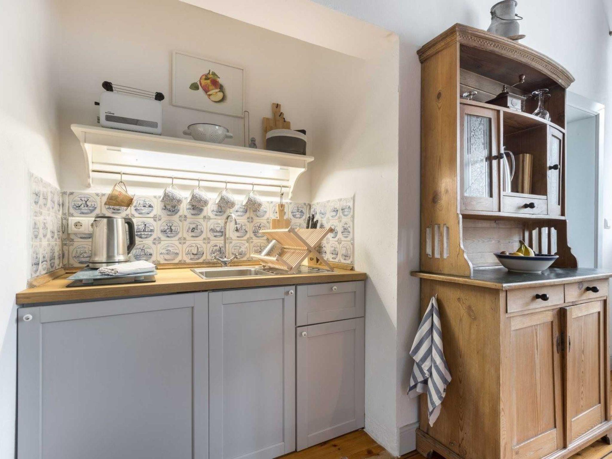 Kochnische mit Ceranfeld und separatem Bräter und Kühlschrank mit Gefrierfach.
