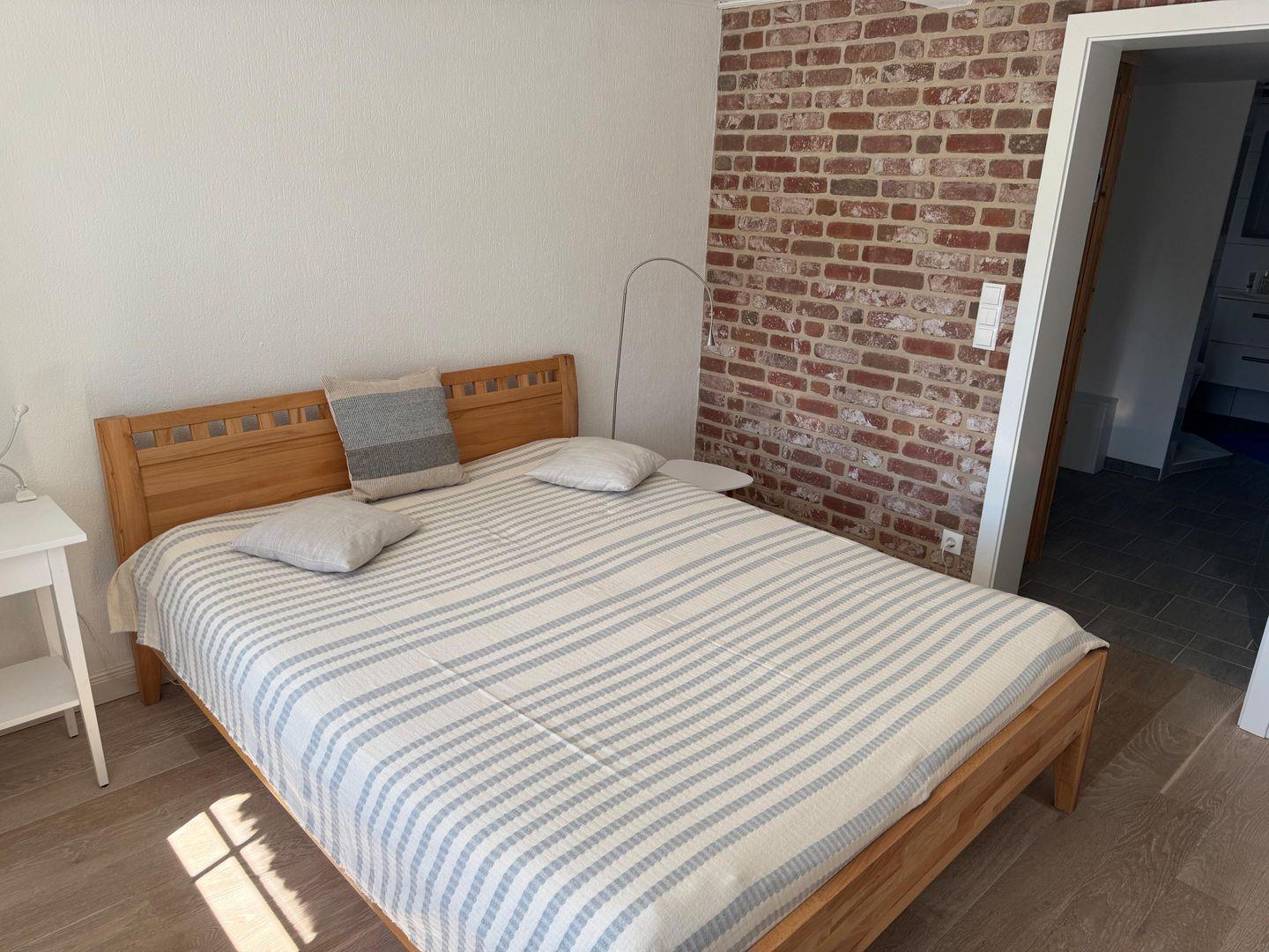 Die Wohnung verfügt über ein Schlafzimmer mit Doppelbett (160 cm x 200cm ) und Sichtschutz mit Verdunkelung, ein Badezimmer mit bodengleicher Dusche und ein zusätzliches Gäste-WC. Der großzügige Wohn- und Essbereich ist hell und freundlich gestaltet, wobei es ein gemütliches Sofa und einen Esstisch gibt, an dem Sie gemeinsame Mahlzeiten genießen können. Die offene Küche ist mit hochwertigen Geräten ausgestattet, darunter ein Induktionsherd, ein Backofen, eine Spülmaschine sowie eine Kaffeemaschine (Filter und italienische Espressomaschine) und ein Toaster. Hier können Sie kulinarische Köstlichkeiten zubereiten und sich dabei an den frischen Landhausstil erfreuen.