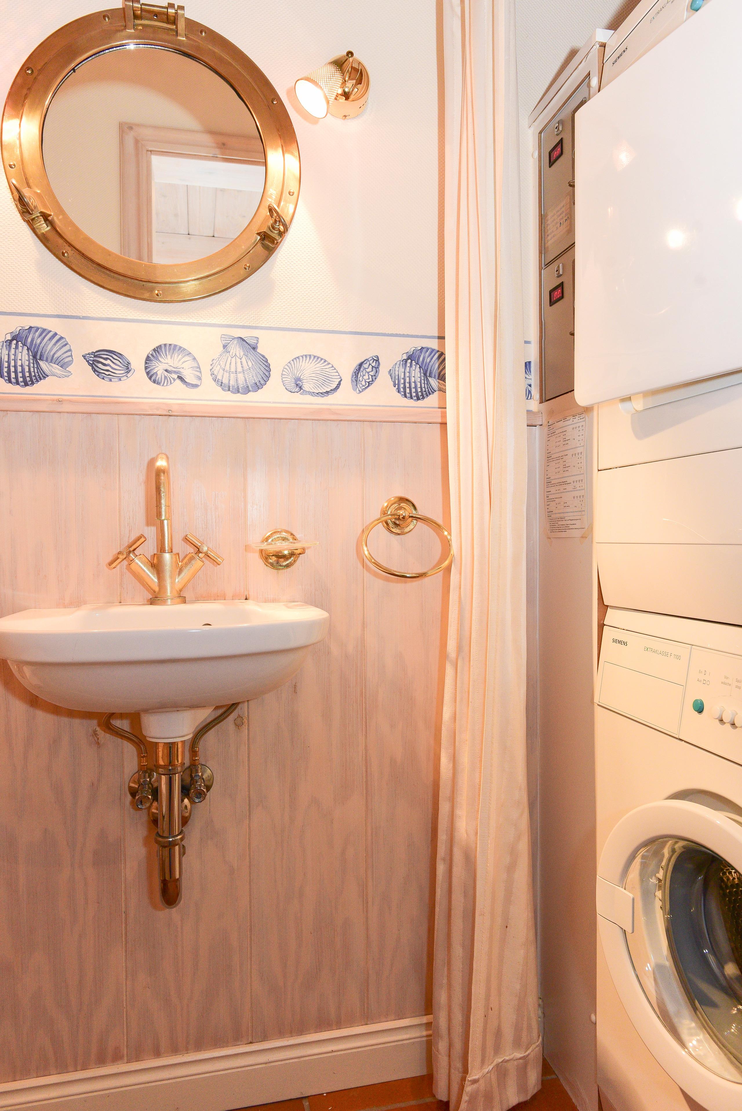 Das Gäste-Bad im Erdgeschoss besticht mit seinem maritimen Look und niedlichen Details, welche den Charme der Wohnung unterstreichen.