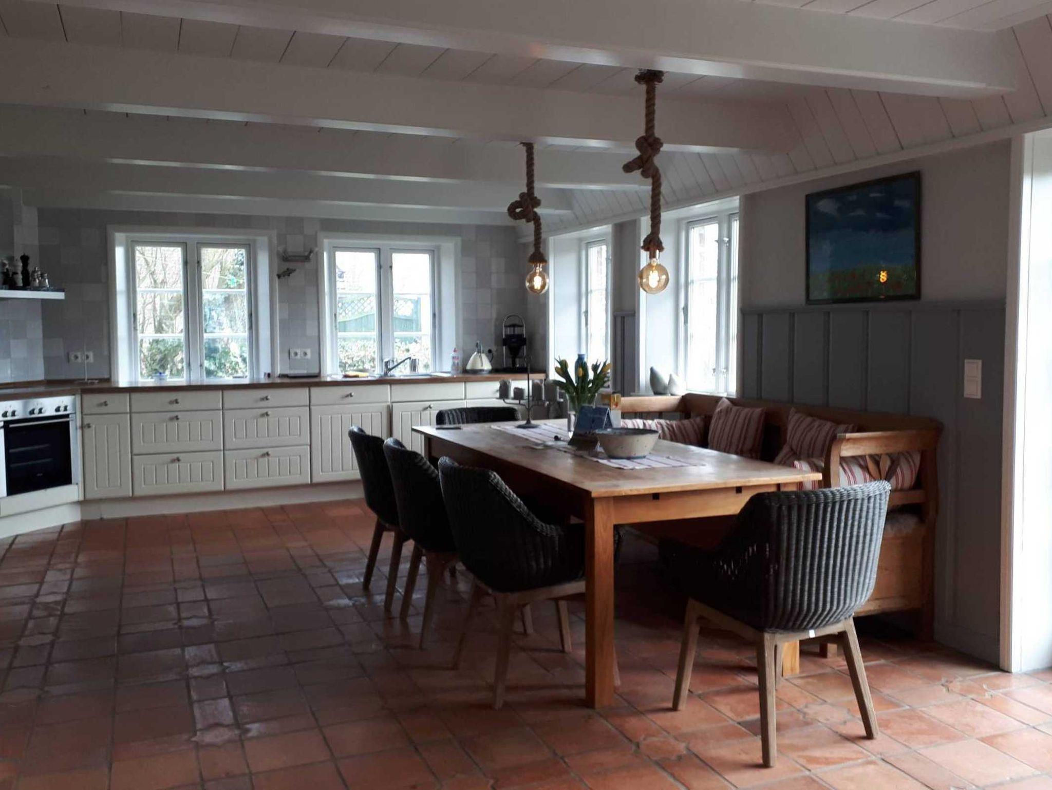 Große lichtdurchflutet Gallerie im Eingangsbereich.800 qm Grundstück mit einem freien Blick auf eine Pferdekoppel.Im Ort befinden sich zwei Cafes, ein Gasthaus, zwei Bauernläden, ein Sparmarkt mit frischen Brötchen, Fahrradverleih, Bastelladen. Das Haus ist 160 qm groß und bietet komfortablen Raum für 7 Personen (4 Erwachsene und 3 Kinder). Neben dem großzügigen, offenen Wohnzimmer und einer mit modernster Technik ausgestatteten, großen Wohnküche, gibt es vier Schlafzimmer, zwei mit Doppelbetten, eines mit zwei Einzelbetten, zusätzlich ein Einzelzimmer. Ein Bad mit Dusche, WC und Badewanne, eines mit Dusche und WC, zusätzlich ein WC.