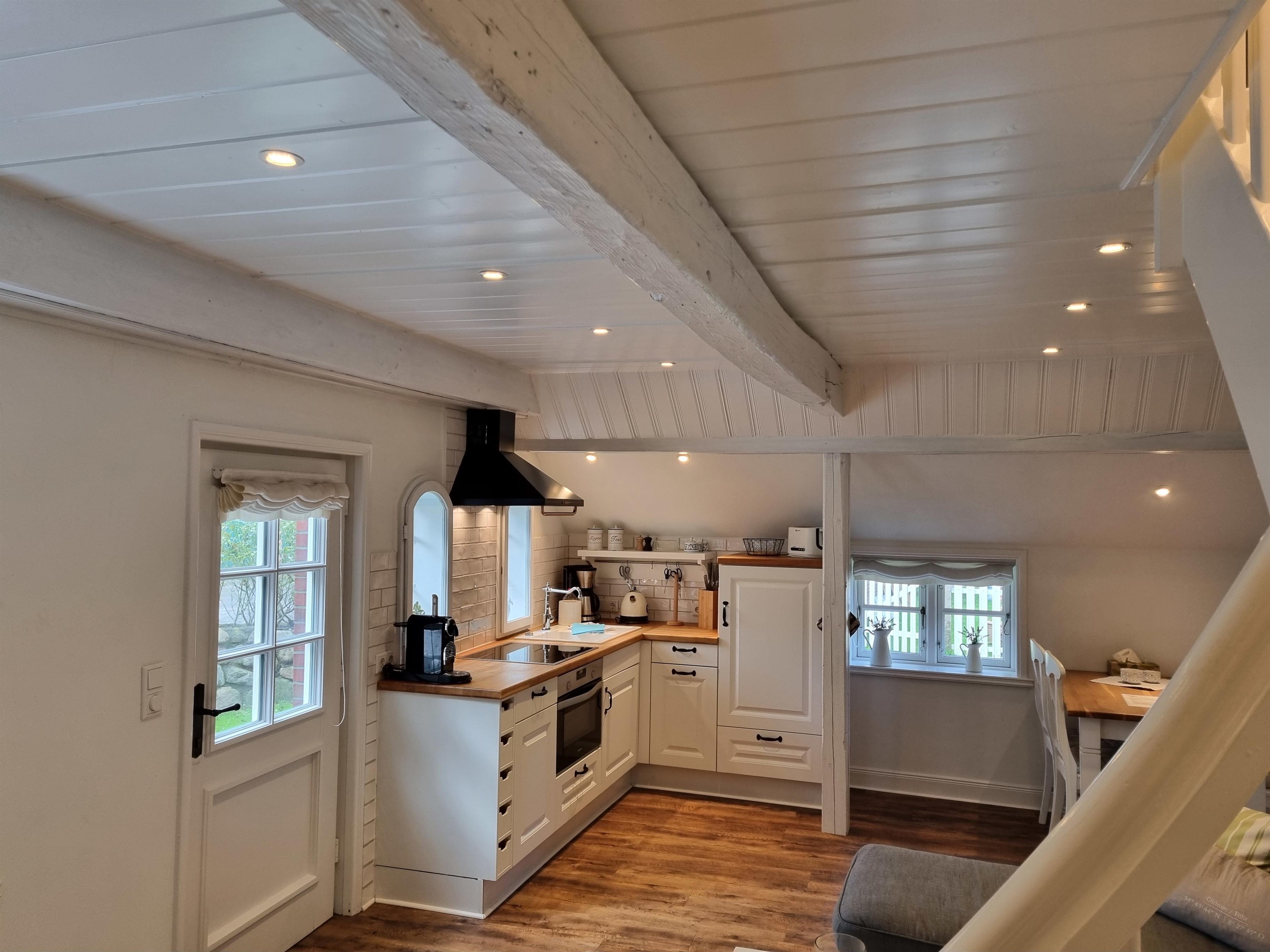 Im Erdgeschoss befindet sich der offene Wohn- und Essbereich mit integrierter Küche. Die Küche ist ausgestattet mit Backofen, Mikrowelle, Nespresso-Maschine sowie allem, was Sie zum Kochen benötigen.