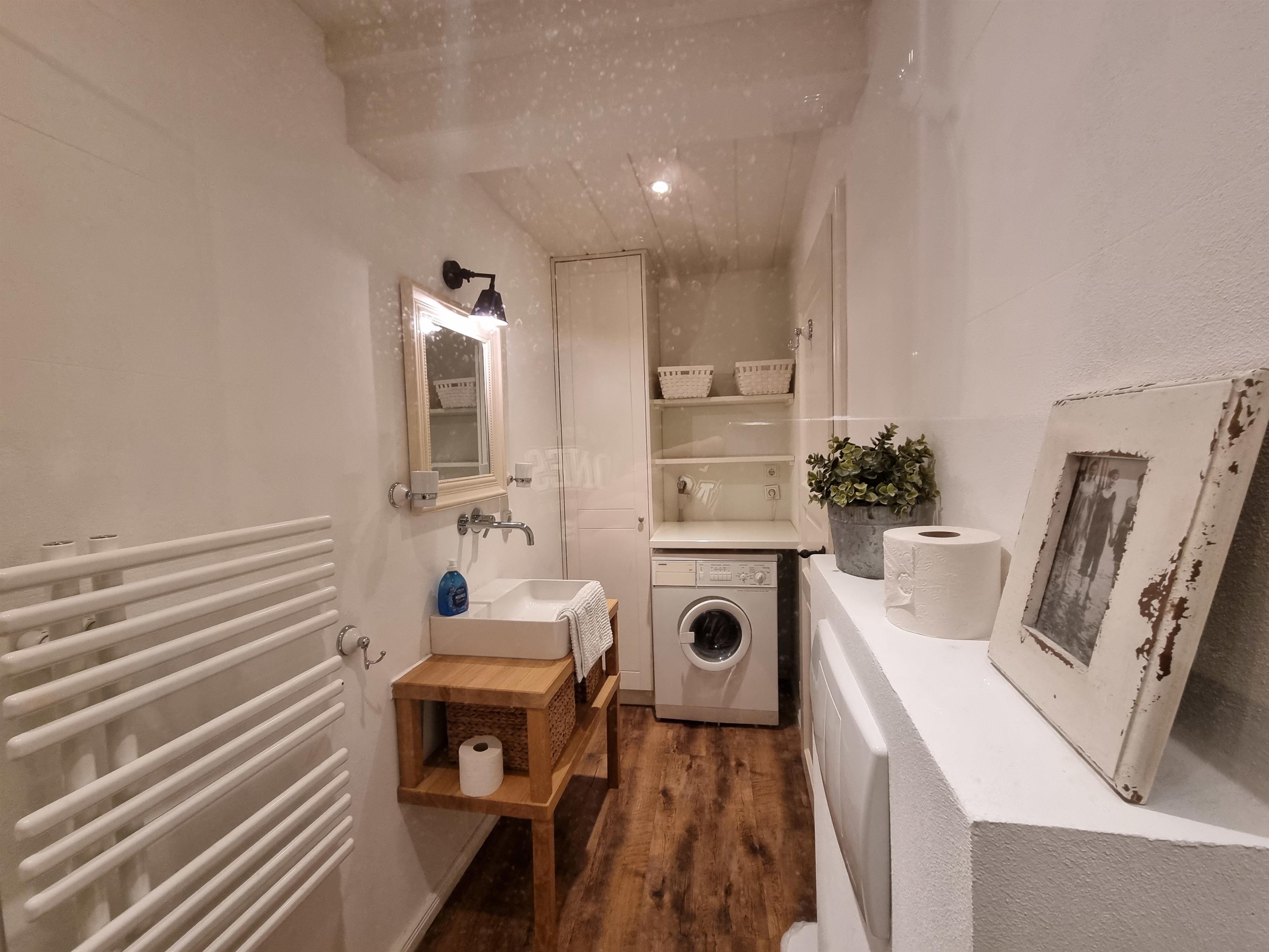 Ebenfalls im Erdgeschoss befindet sich ein kleines Badezimmer mit WC, Waschbecken, ebenerdiger Dusche, Föhn, Handtuchwärmer sowie einer Waschmaschine, die Ihnen zur Verfügung steht.