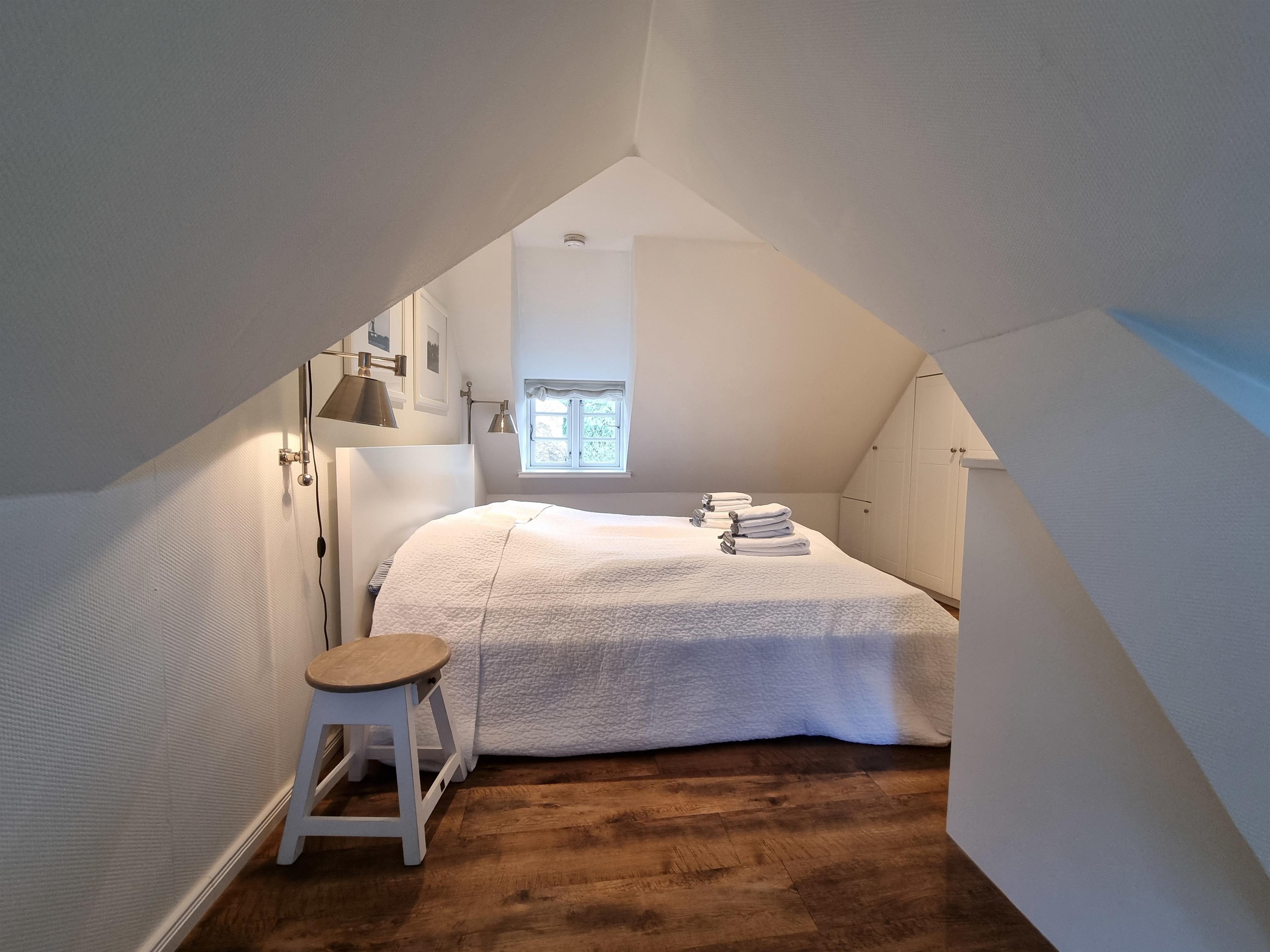 Im Obergeschoss liegt das Elternschlafzimmer mit einem Doppelbett (1,60 × 2,00 m), einem Einbaukleiderschrank und einer kleinen Leseecke.