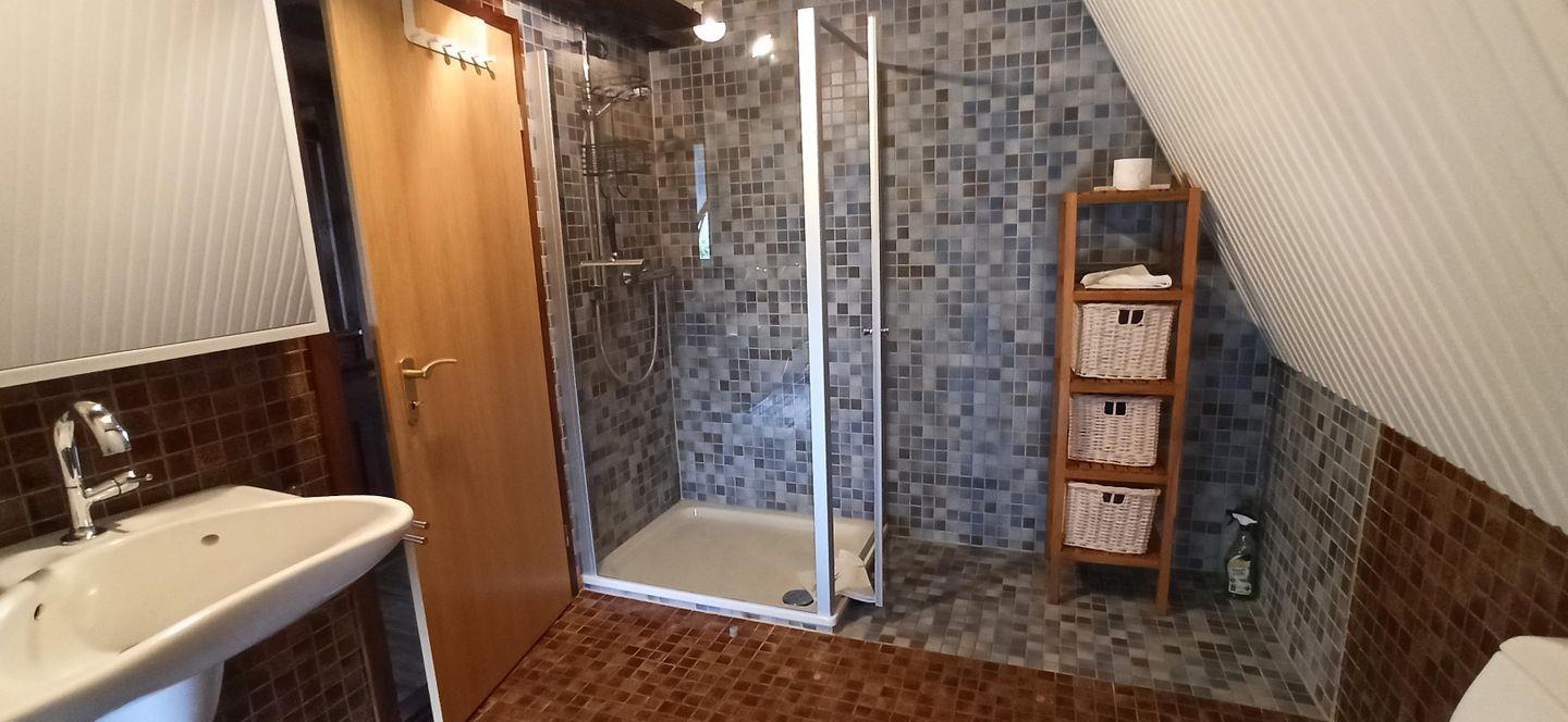 Das Badezimmer umfasst eine bodengleiche Dusche (1), WC und Bidet sowie Waschbecken, Spiegel, Fenster und warmes Wasser. Handtücher, Badetücher und ein Haartrockner sind bereitgestellt; Bettwäsche ist ebenfalls inklusive. Ein Staubsauger steht zur Verfügung. Ein Balkon ergänzt die Wohnung als angenehmer Außenbereich. Für die Anreise ist ein Parkplatz vorhanden (1). Haustiere sind auf Anfrage möglich.
