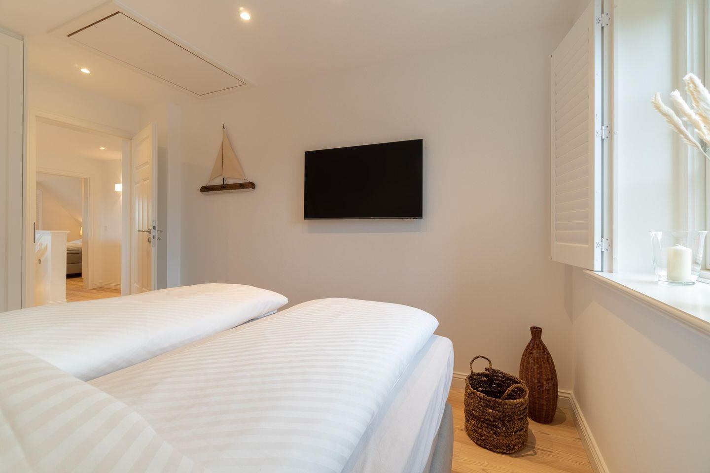 Im Obergeschoss befinden sich die drei Schlafzimmer - zwei mit jeweils einem Doppelbett und eines mit zwei Einzelbetten - ein Duschbad sowie die hauseigene Sauna. Eines der Doppelbettzimmer verfügt zusätzlich über ein Duschbad en Suite.