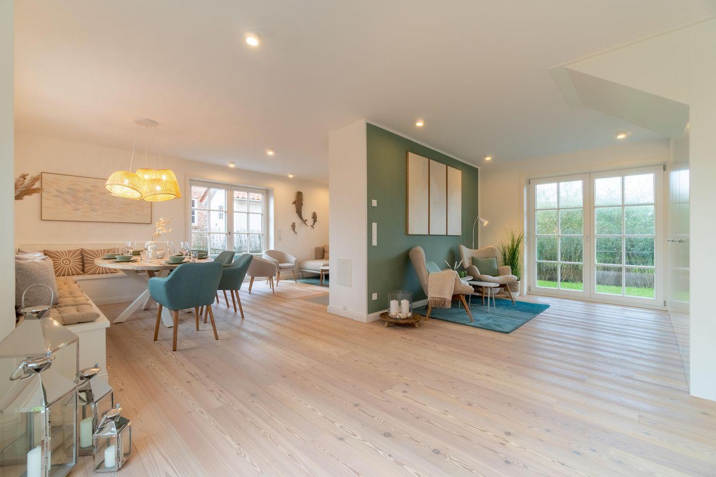 Im Erdgeschoss befinden sich der großzügige Wohn- und Essbereich mit offener Küche, ein Gäste-WC sowie ein Hauswirtschaftsraum mit Waschmaschine und Trockner. An kühleren Abenden sorgt der Original Mylin-Kachelofen für eine angenehme Atmosphäre.
