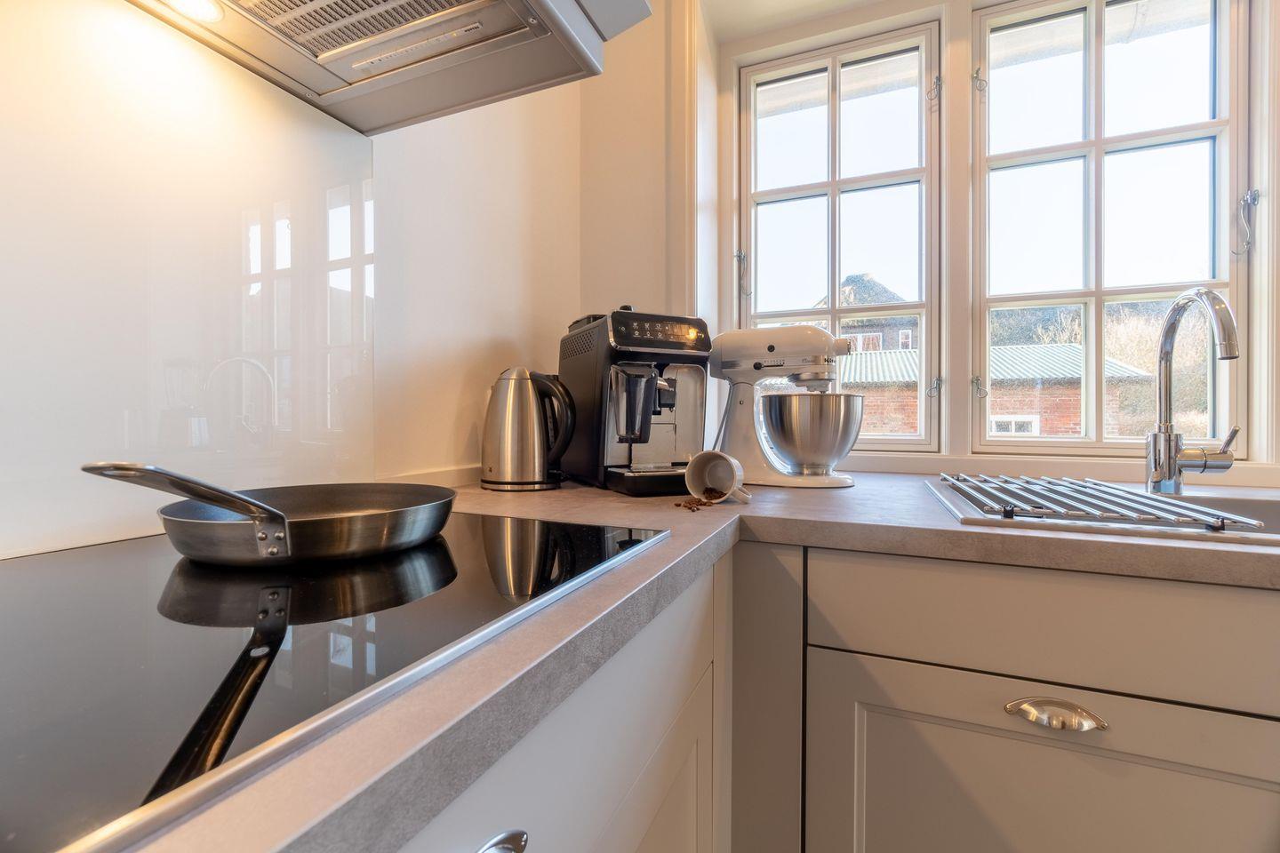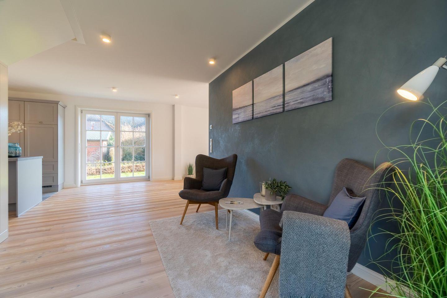 Exklusives Ferienhaus mit Sauna, Terrasse und Original Mylin-Kachelofen, sowie Ausblick auf die Oldsumer Mühle.