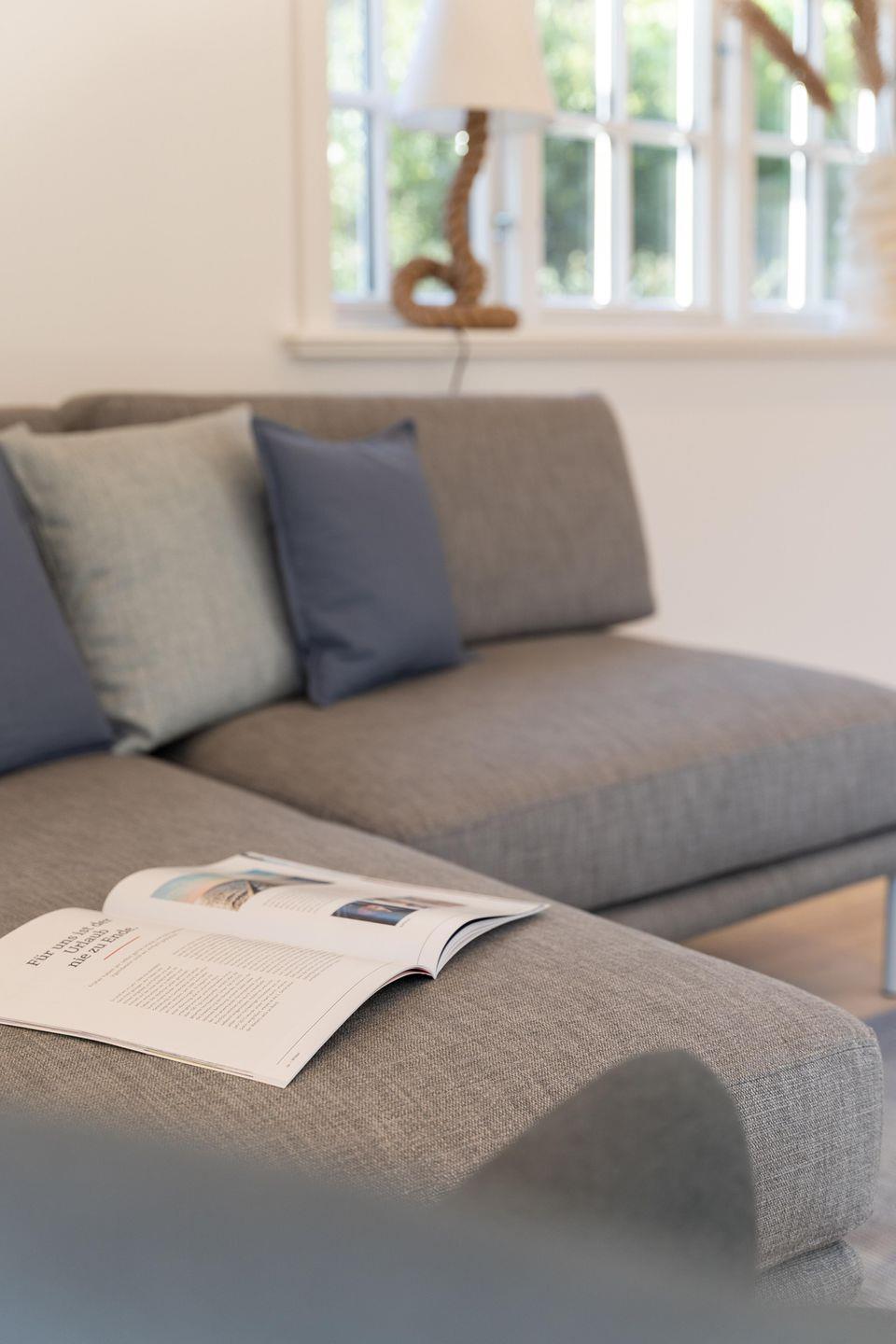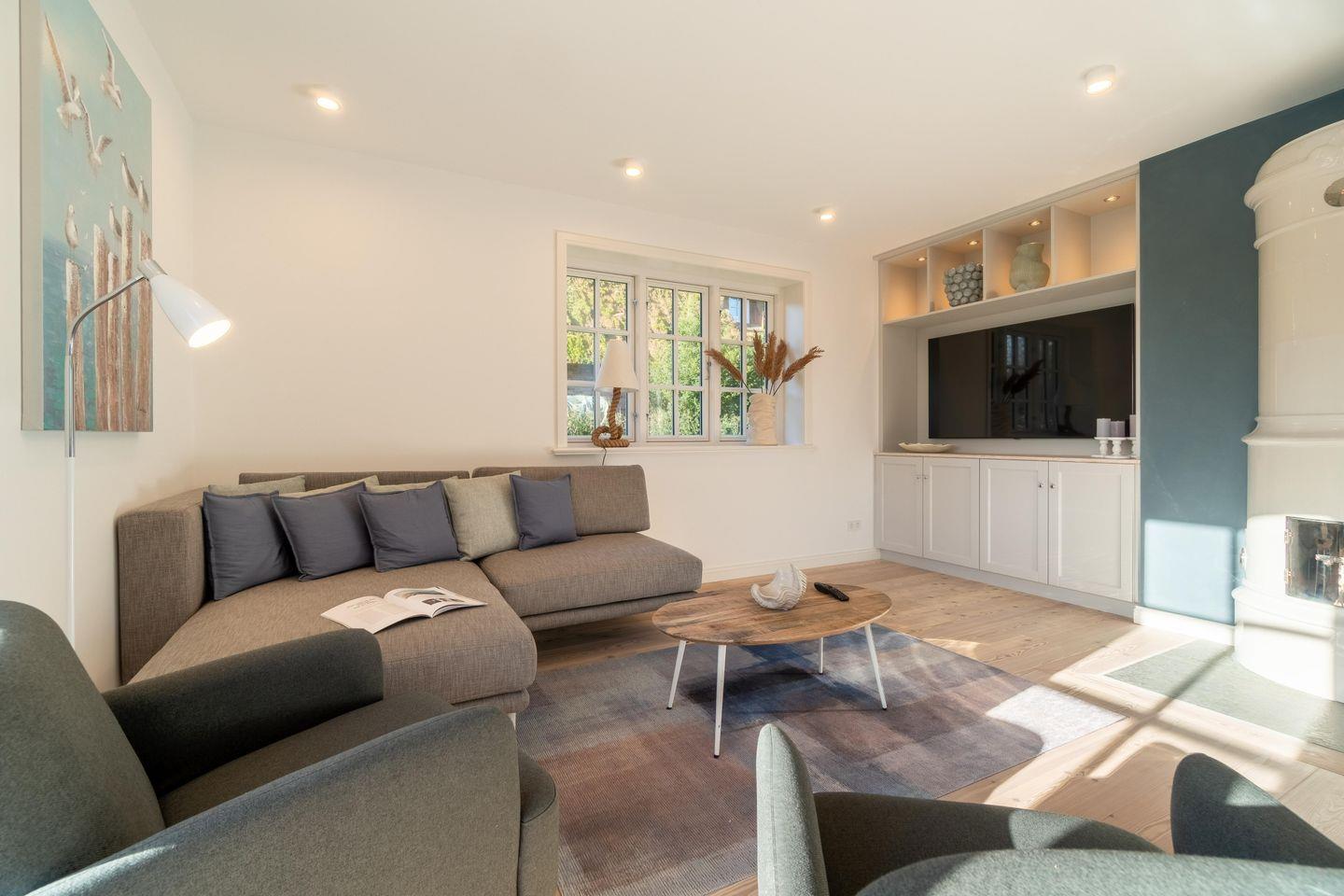Zu den Highlights der Ferienunterkunft zählen wir u. a. den Original Mylin-Kachelofen, die hauseigene Sauna, die Terrasse im Garten sowie der Ausblick auf die Oldsumer Mühle, eines der Wahrzeichen des Dorfes.