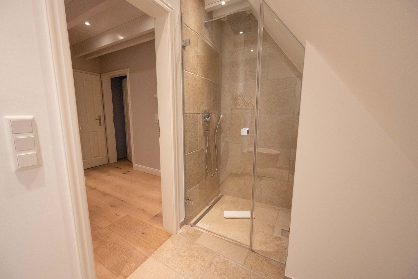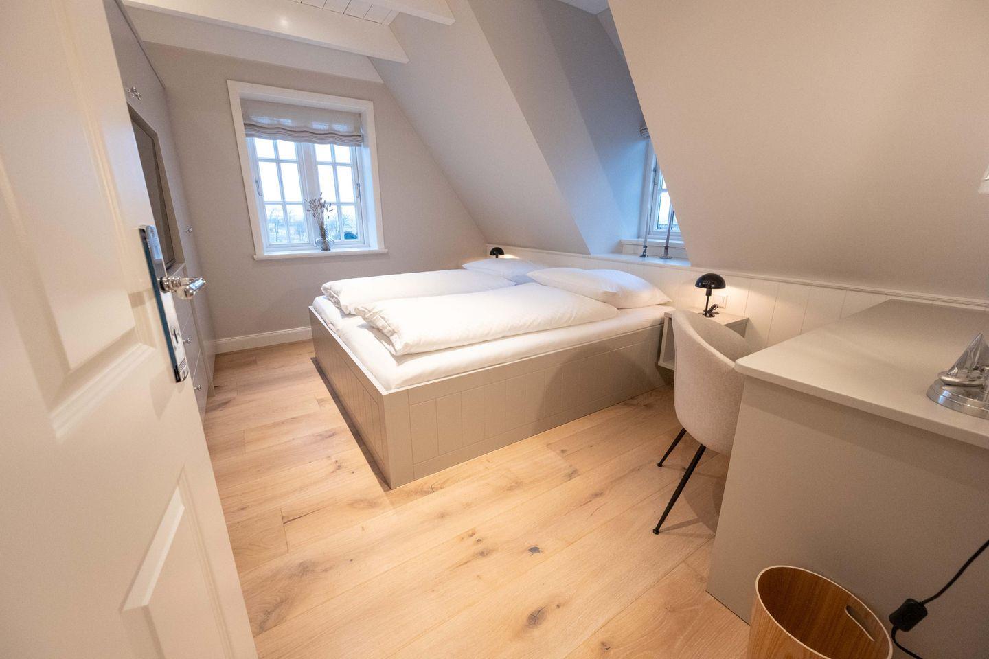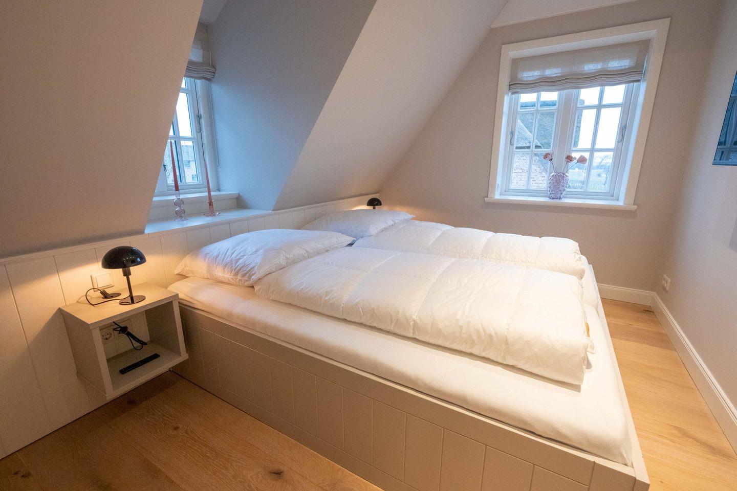 Im Obergeschoss sind die beiden Schlafzimmer - jeweils mit einem Doppelbett und einem Smart-TV ausgestattet - und die beiden Duschbäder gelegen. Im Dachgeschoss steht Ihnen ein weiteres Schlafzimmer mit Doppelbett zur Verfügung.