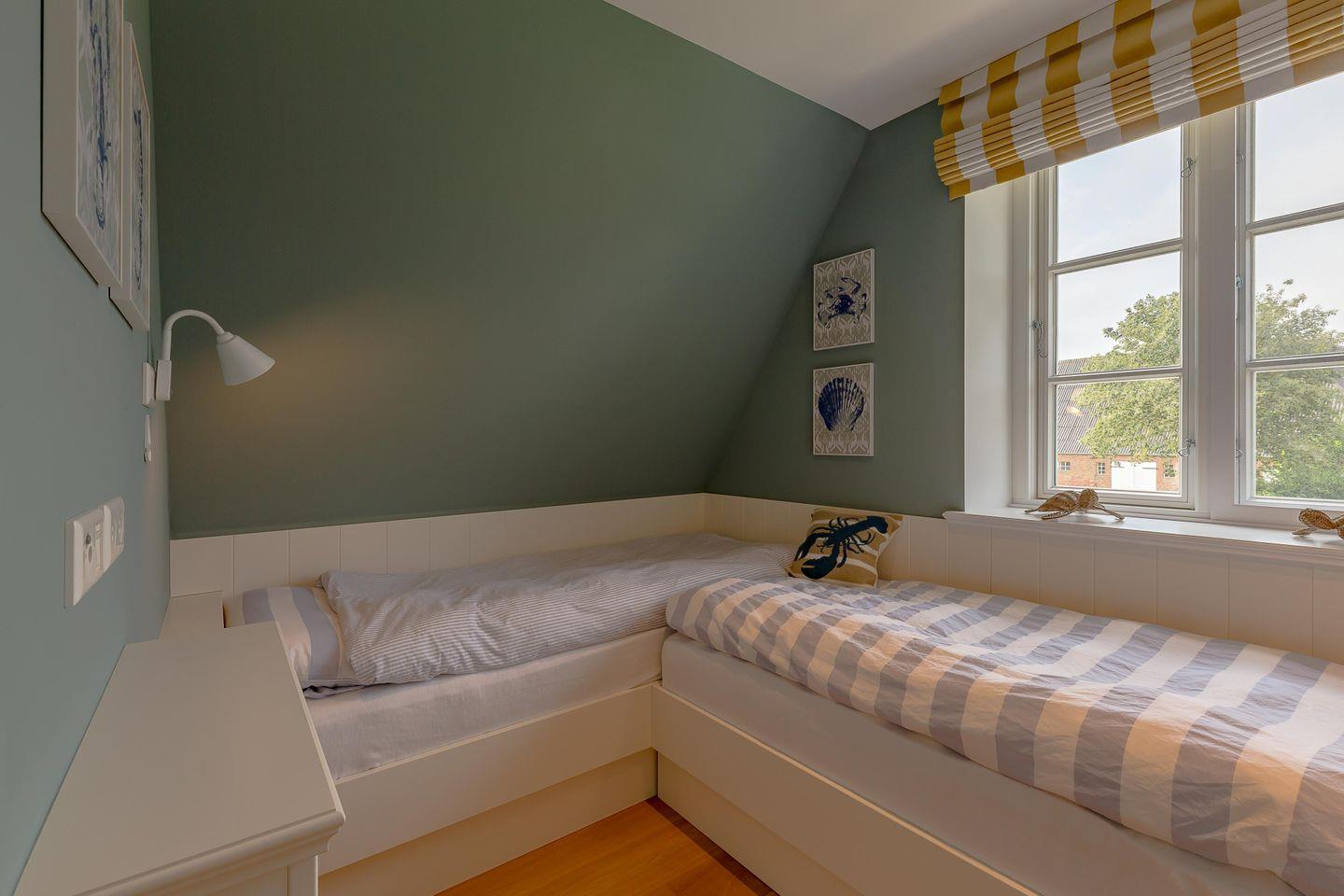 Im Obergeschoss sind die drei Schlafzimmer sowie das zweite Duschbad gelegen. Zwei der Schlafzimmer sind jeweils mit einem Doppelbett und einem Smart-TV ausgestattet, das dritte Schlafzimmer mit zwei Einzelbetten. Relaxen Sie in der hauseigenen Sauna im Dachgeschoss samt Ruheraum.