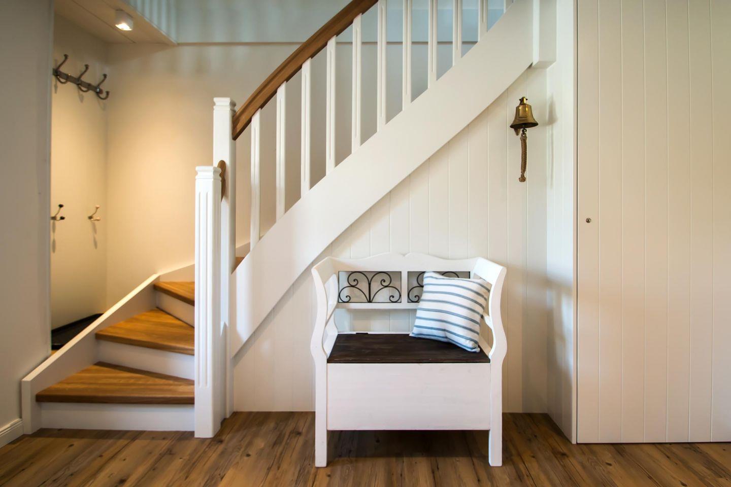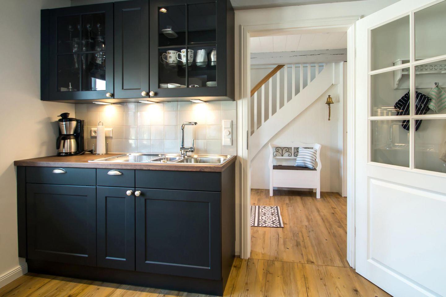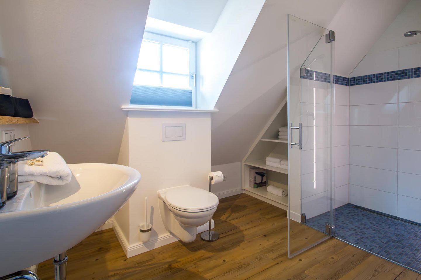 Im Erdgeschoss der Wohnung Waasterlun (zu deutsch Westerland) befindet sich ein großzügiger Wohn-/Essbereich mit Ofen und angrenzender Küche. Ein Bad mit bodengleicher Dusche finden Sie hier ebenfalls vor.